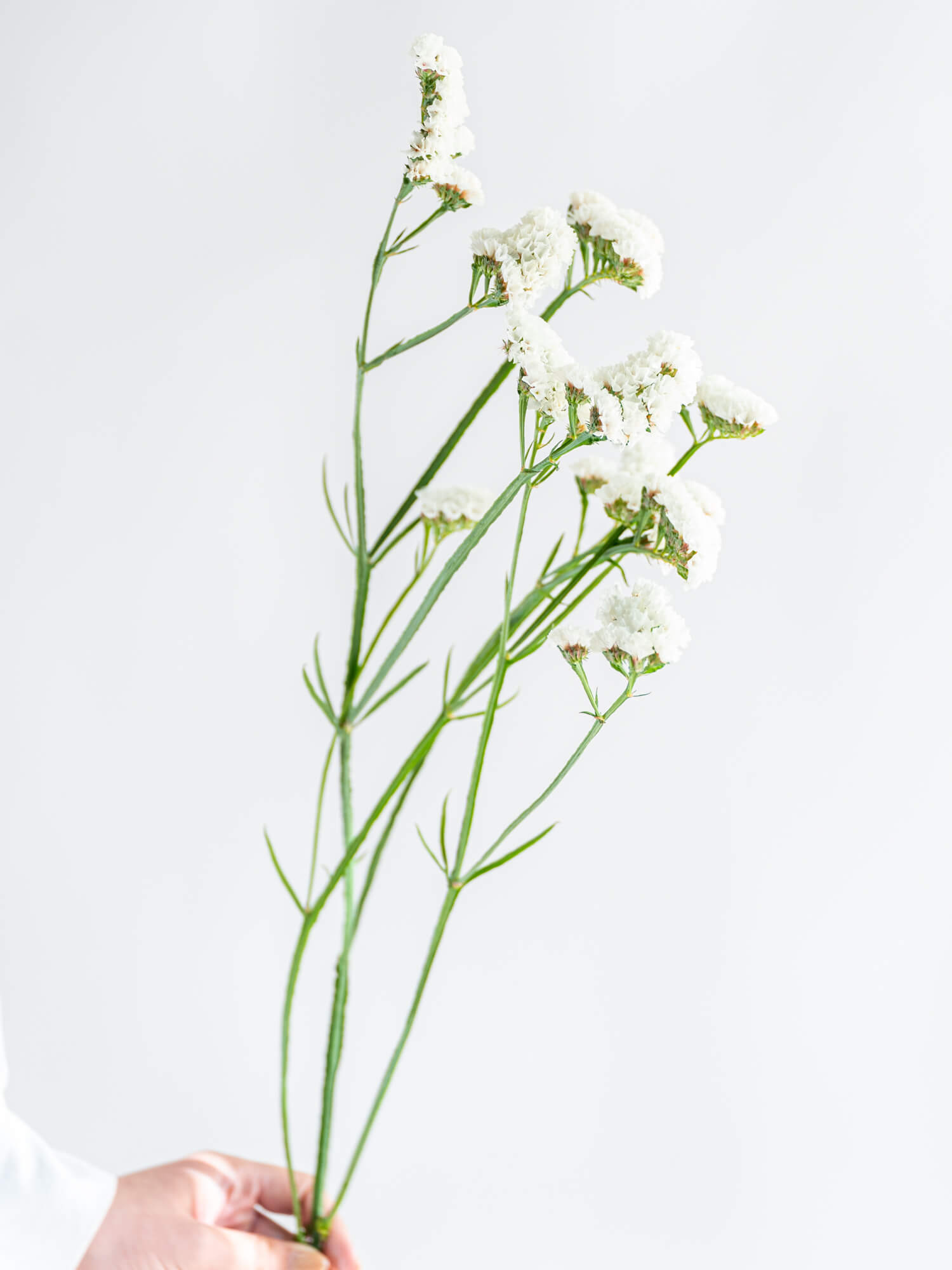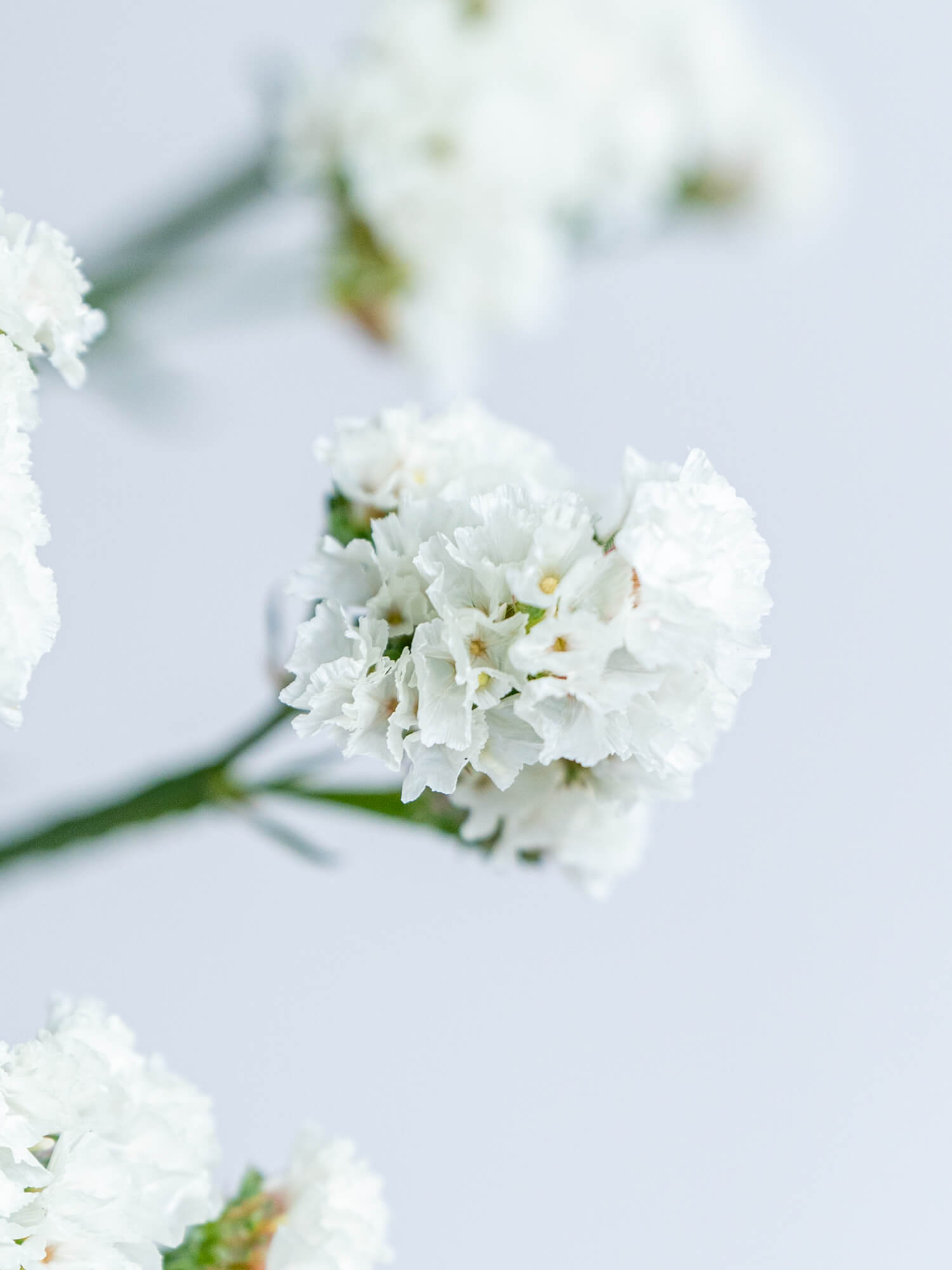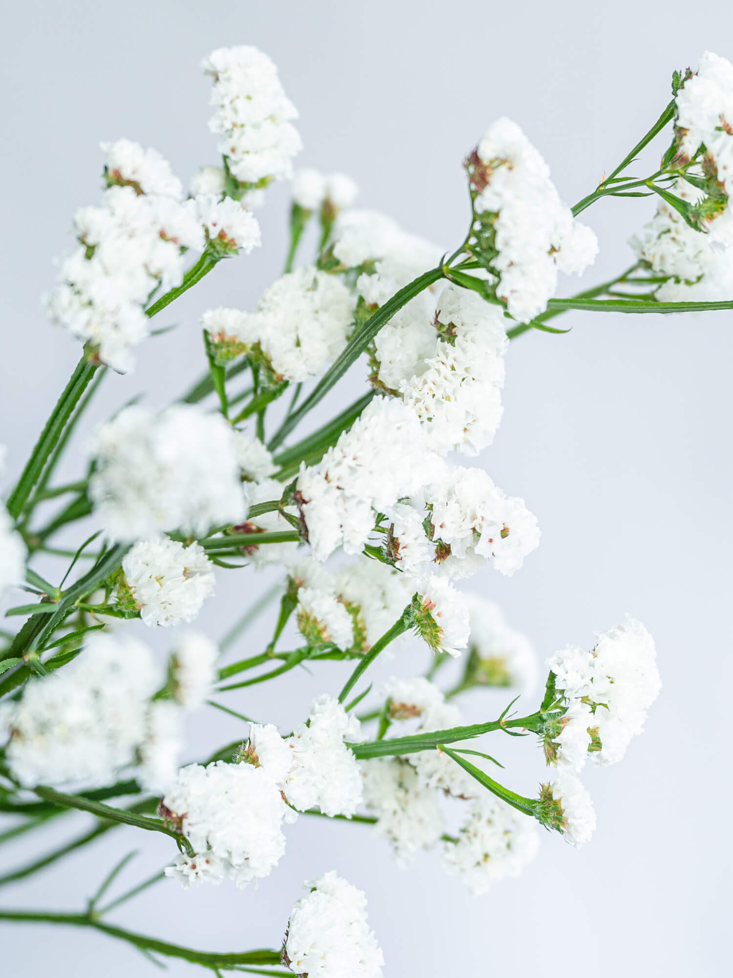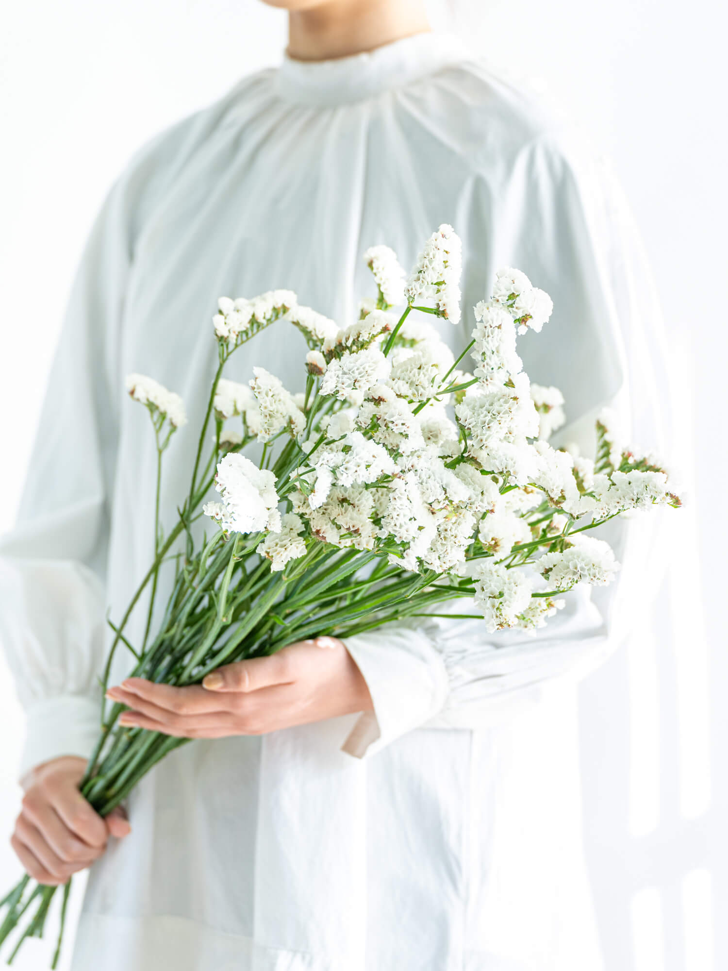 純白の花弁が美しく、清潔感を演出します。ドライフラワーやリース素材としても人気の花材です。