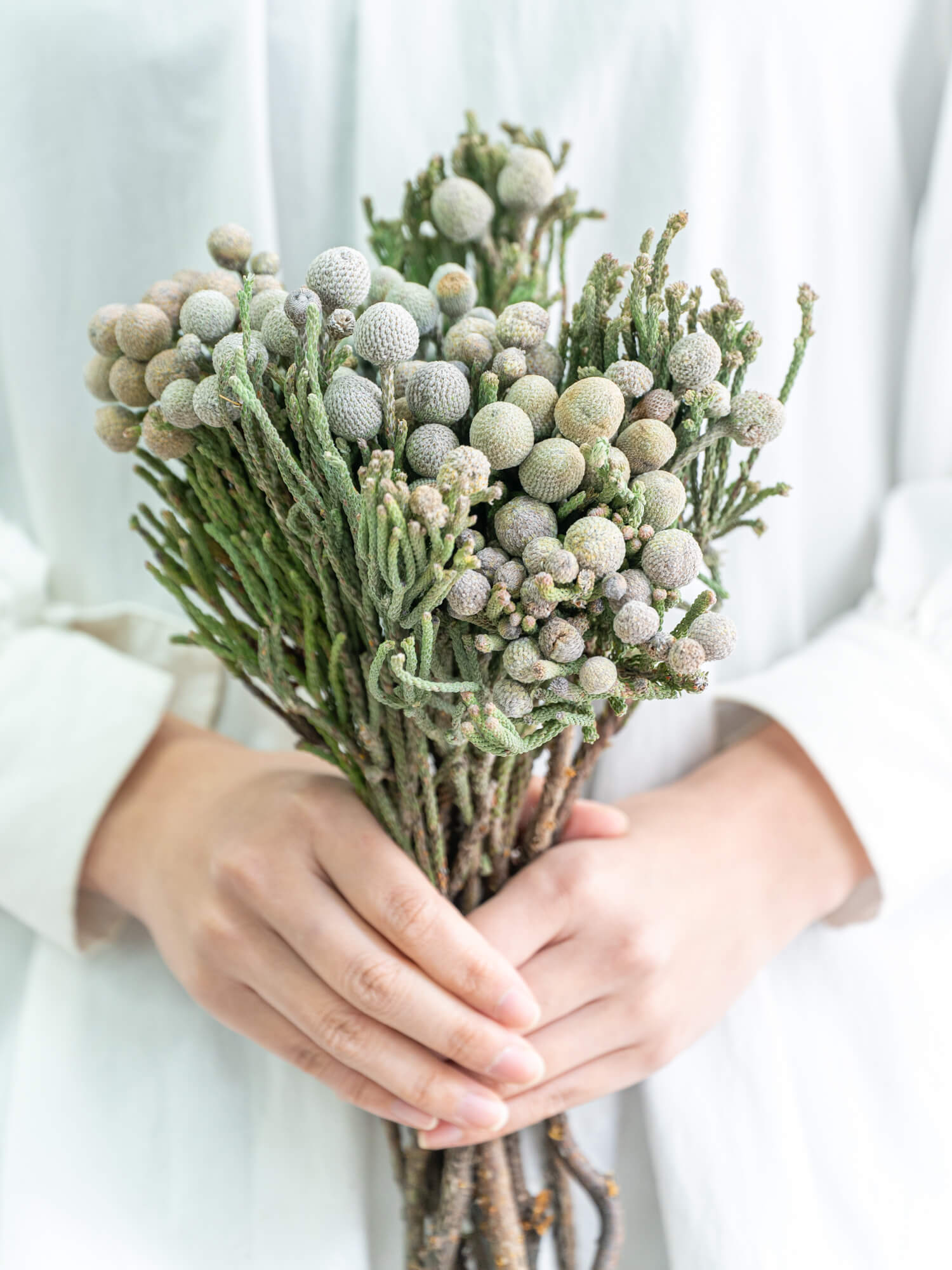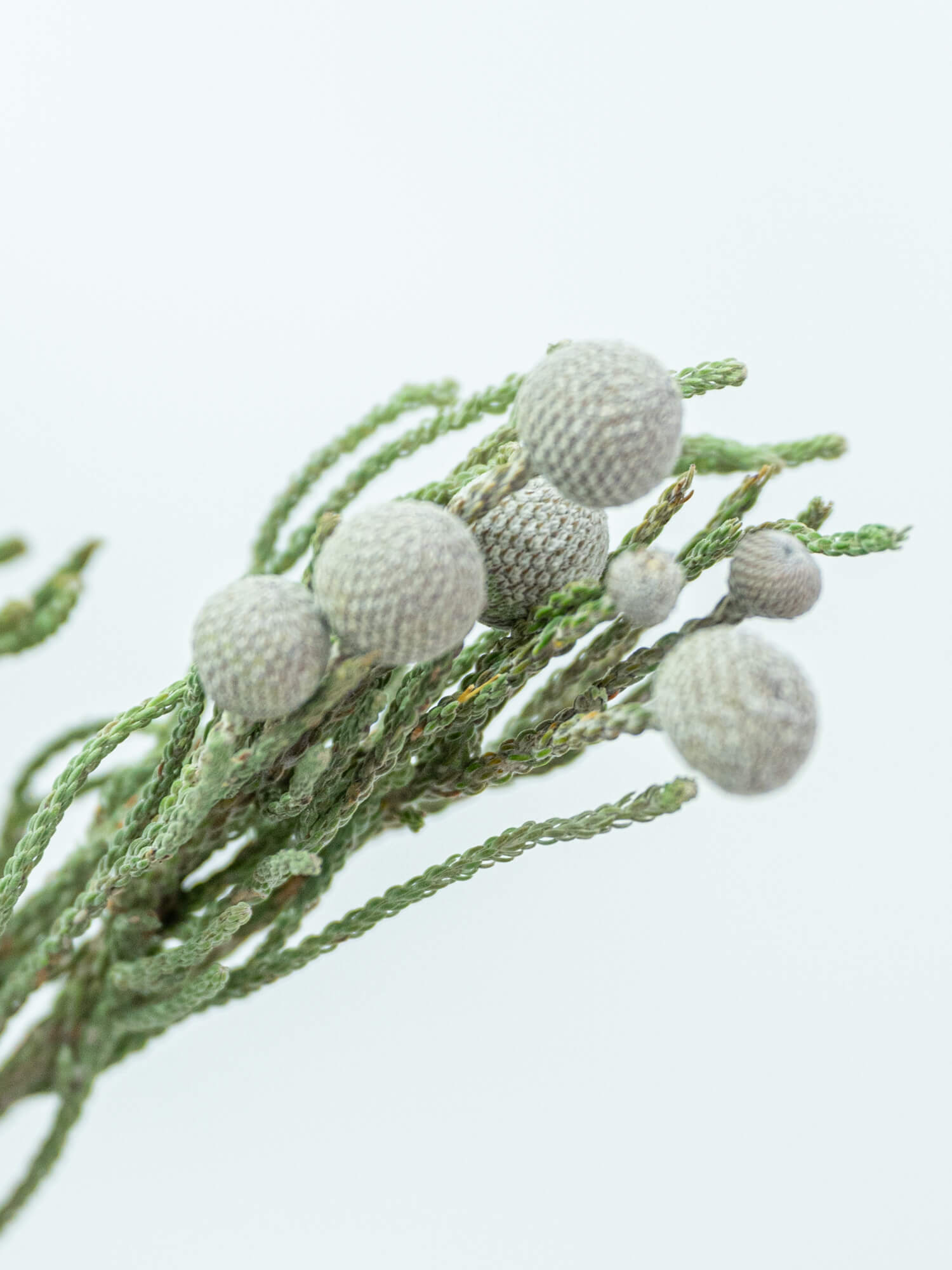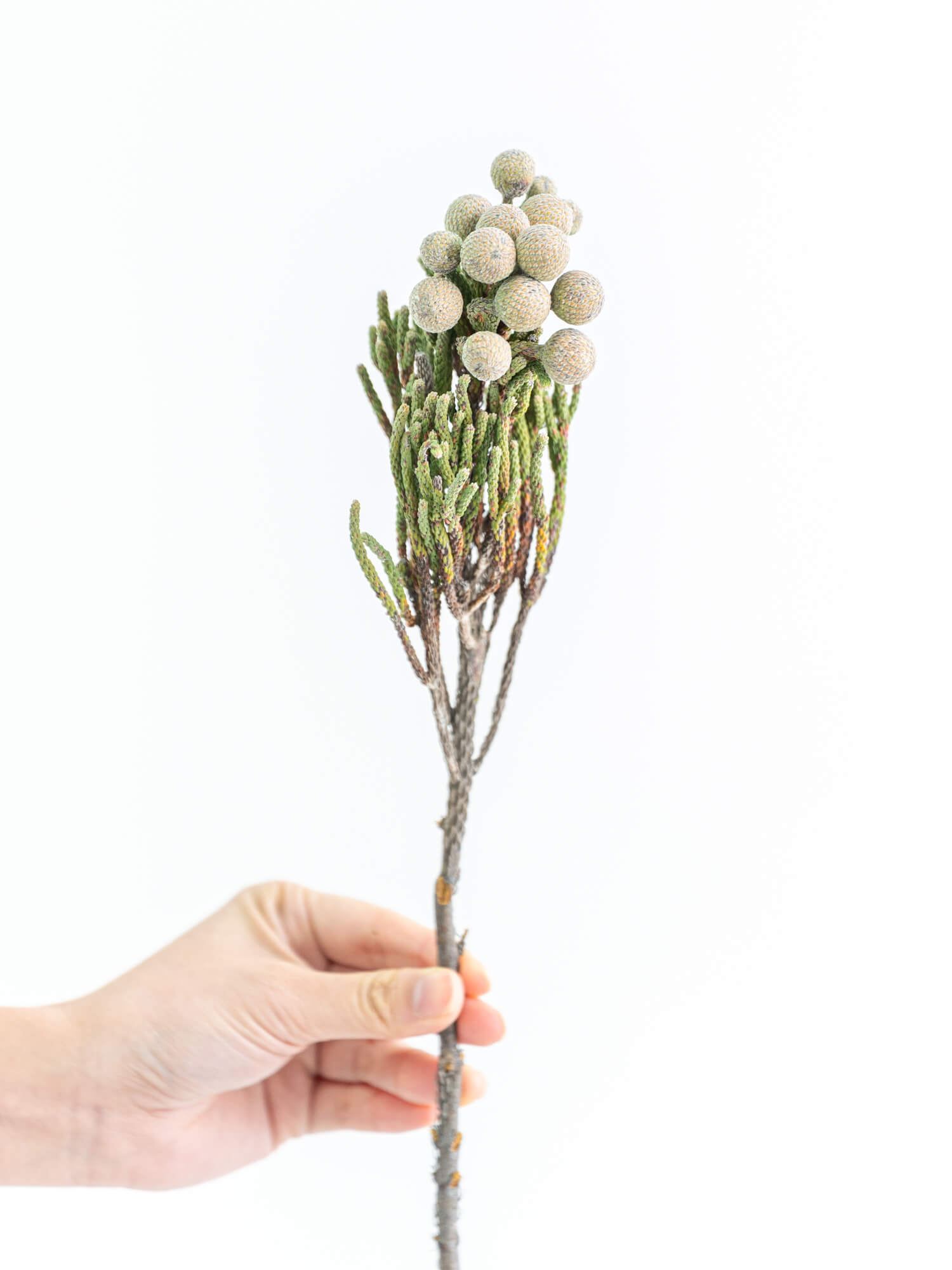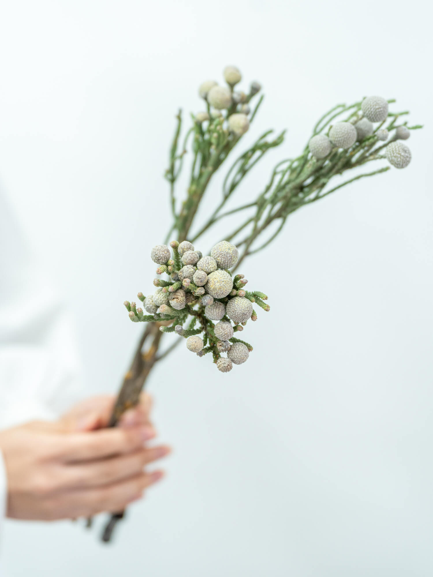 銀白色の枝が高級感を演出します。冬の装飾やシックなアレンジメントに適しています。