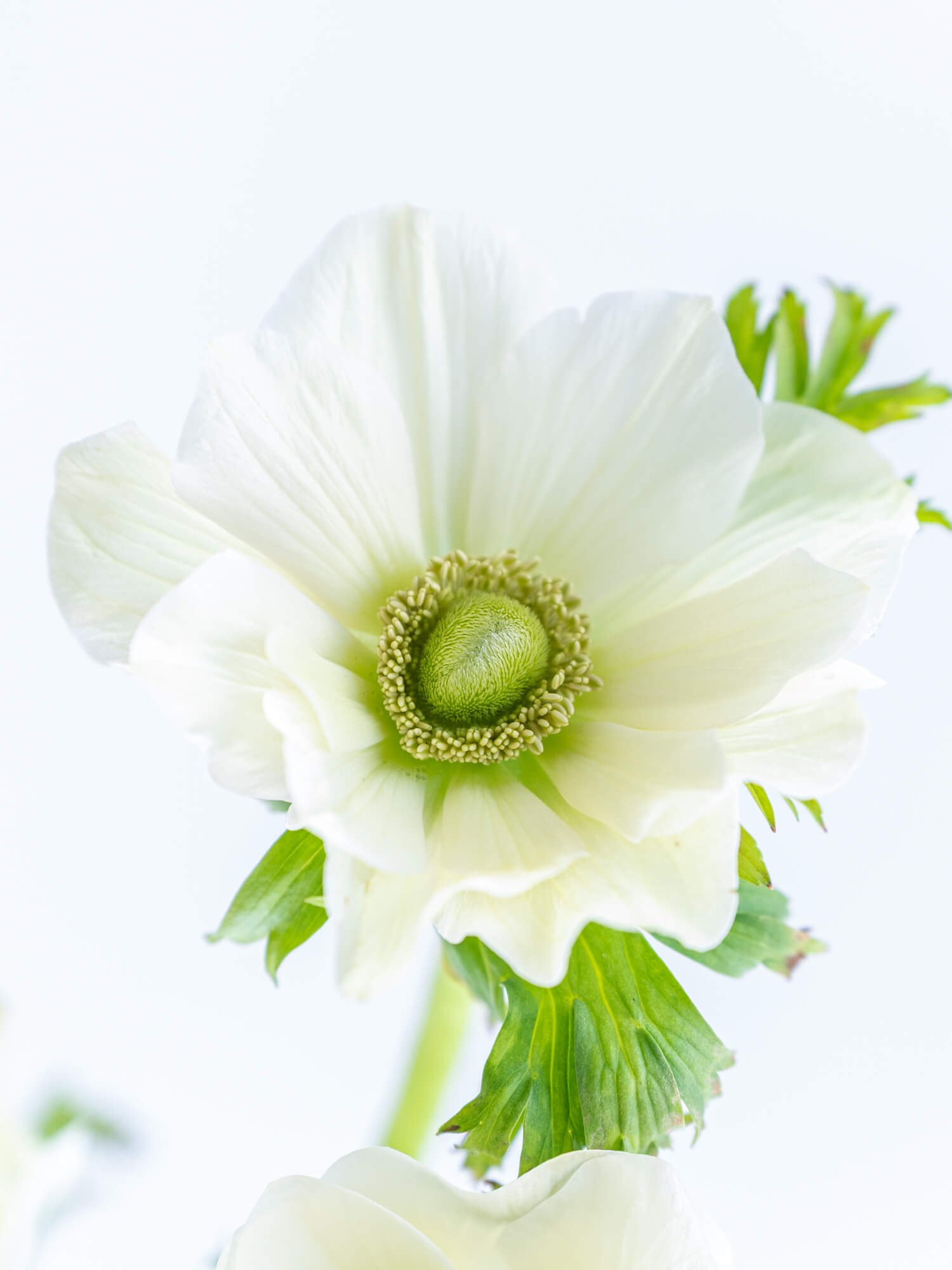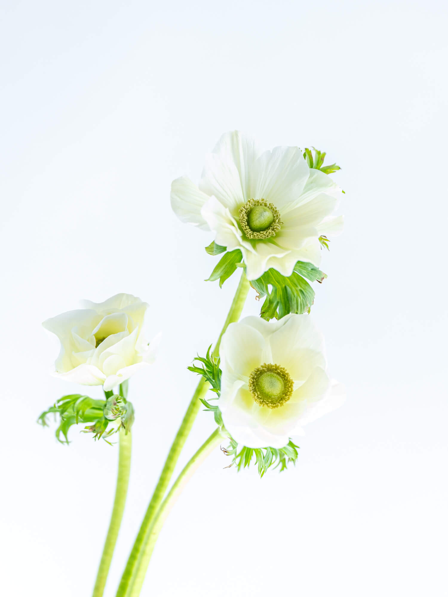 純白の花弁と黒い中心が印象的です。シンプルながらもモダンなアレンジに適しています。