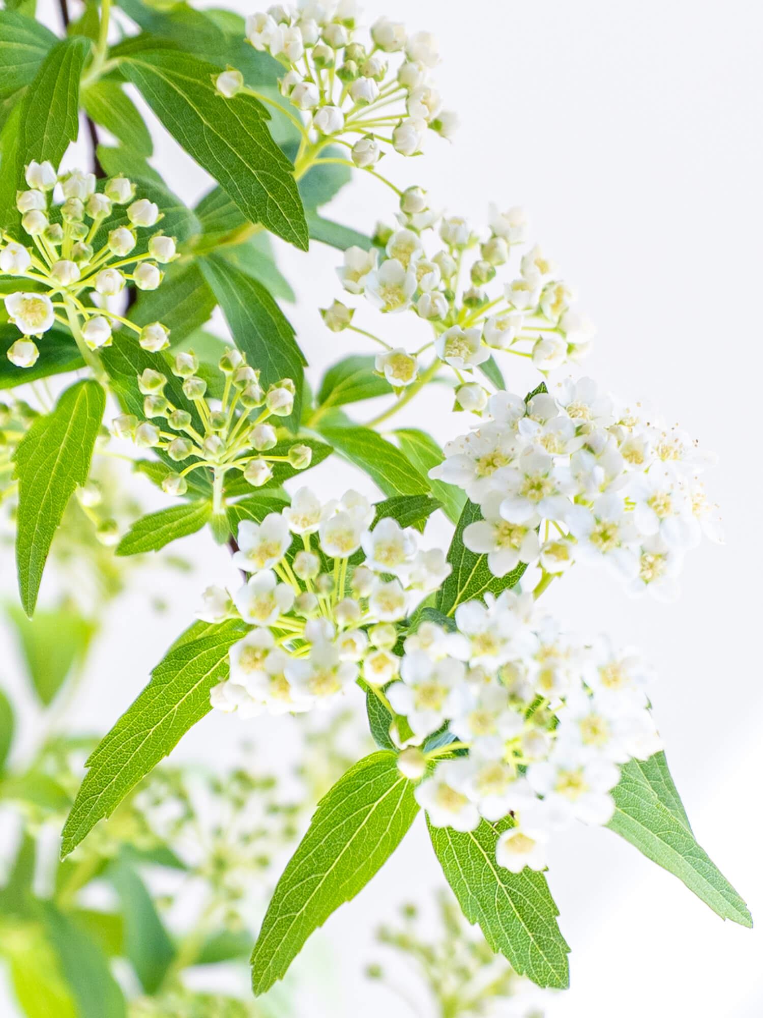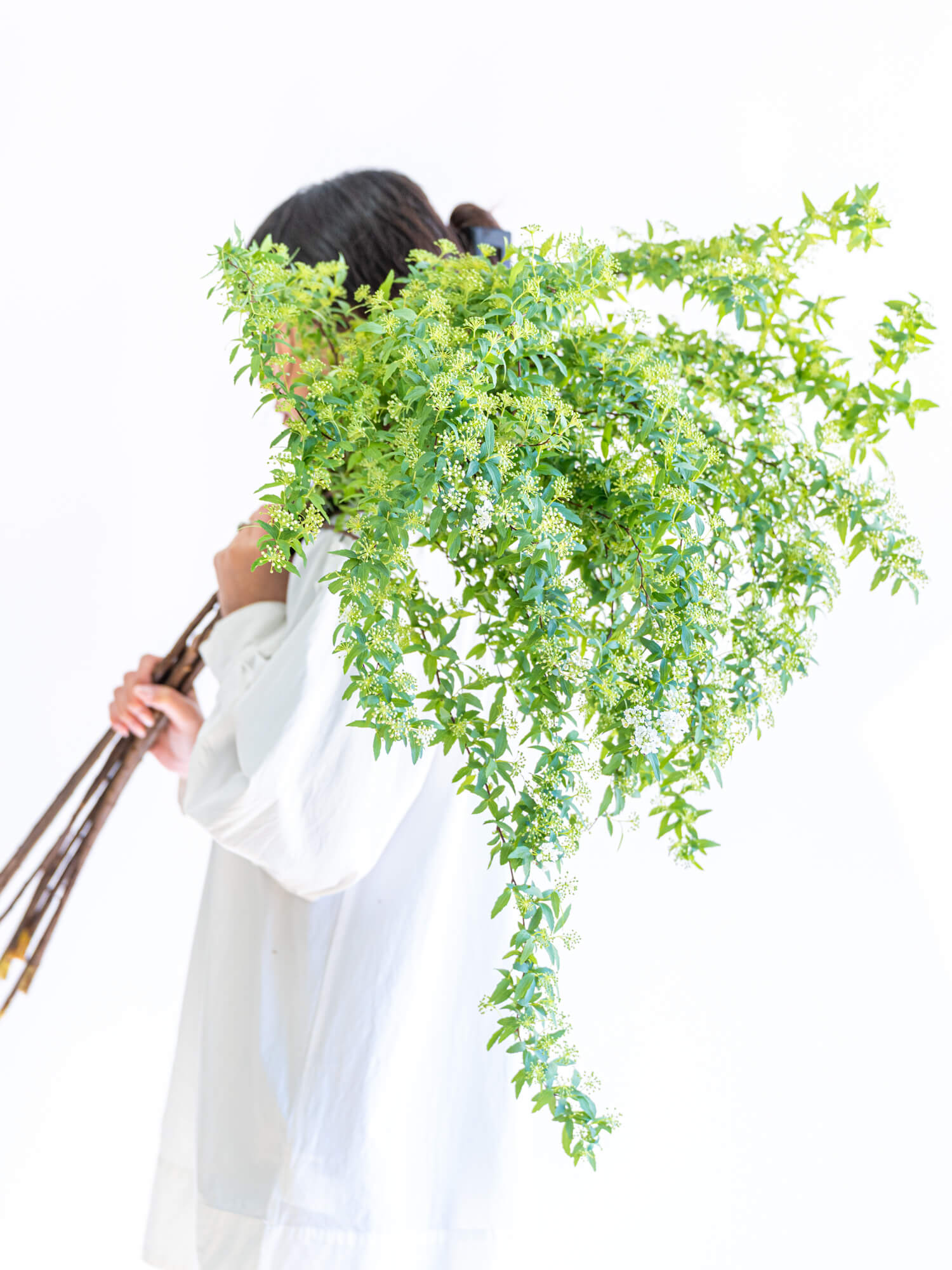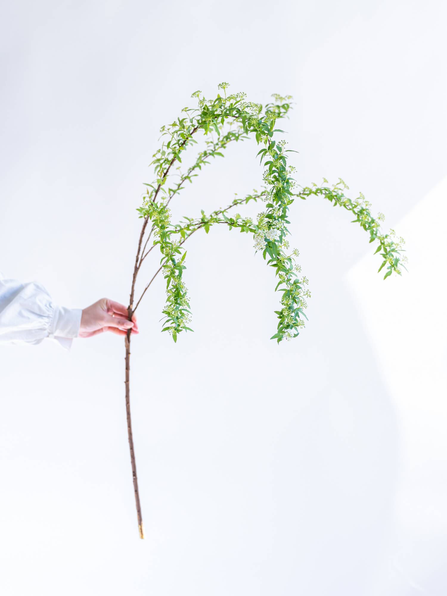 小さな白い花が枝に密集して咲きます。流れるようなラインが美しく、和洋どちらにも合います。