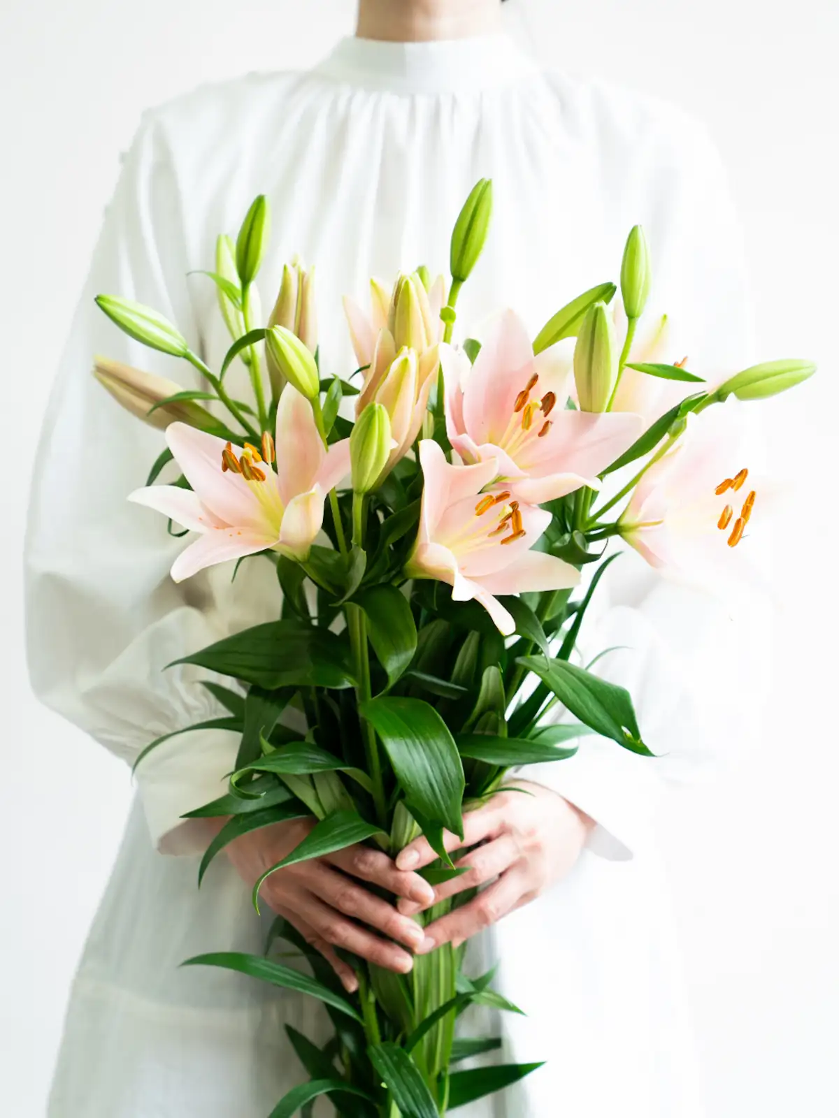 LAユリはすっきりとした花姿としっかりとした茎が特徴で、華やかさと扱いやすさを兼ね備えたユリです。ボリュームは入荷時期・産地によりイメージと異なる場合がございます。予めお含みおきください。
