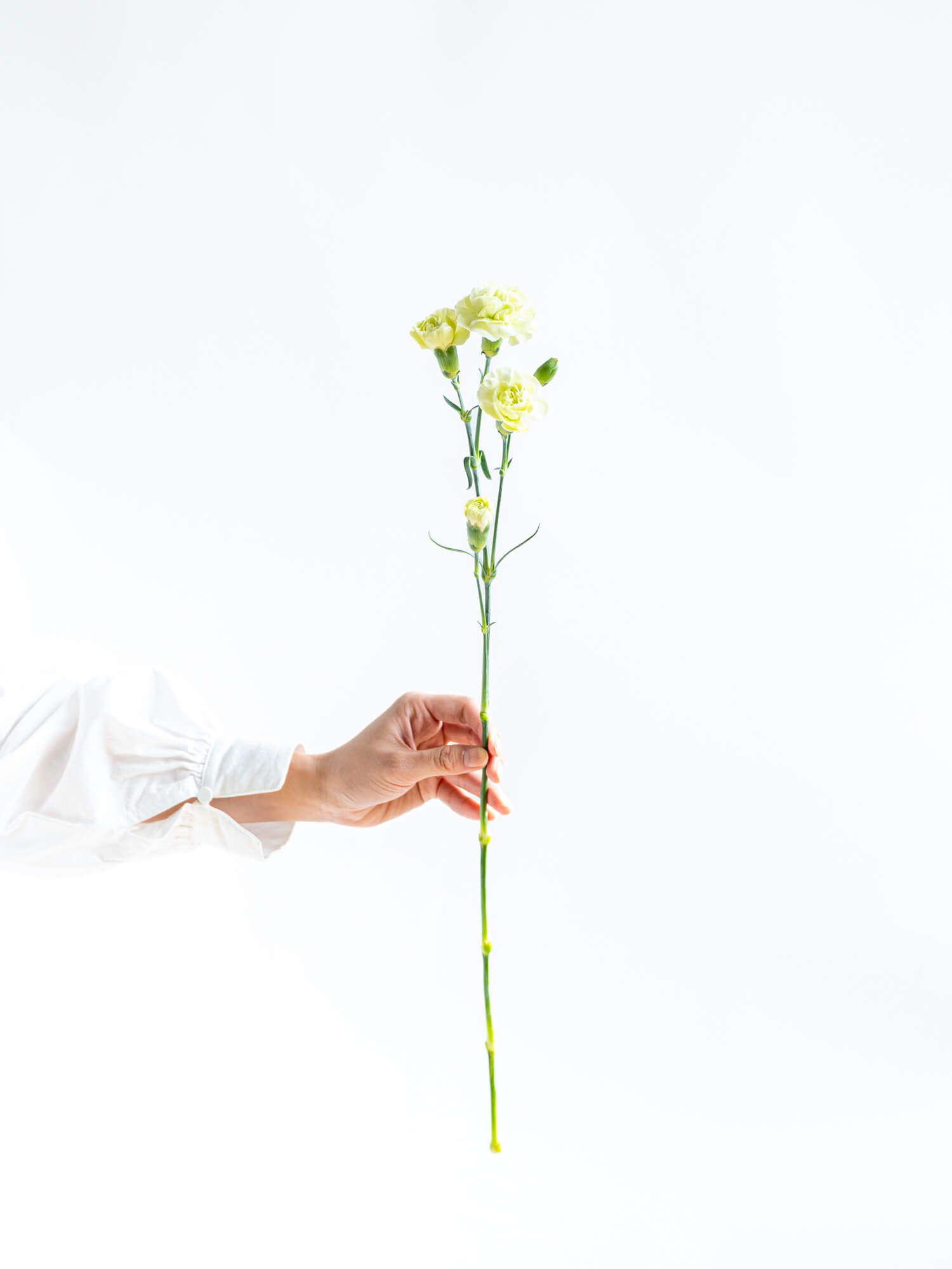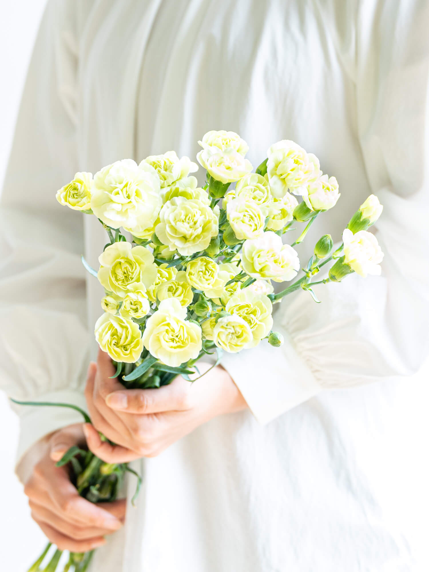 SPカーネーションは1本に複数の小花が咲く枝分かれタイプ。グリーン系はナチュラルで落ち着いた印象のアレンジに適しています。ボリュームは入荷時期・産地によりイメージと異なる場合がございます。予めお含みおきください。