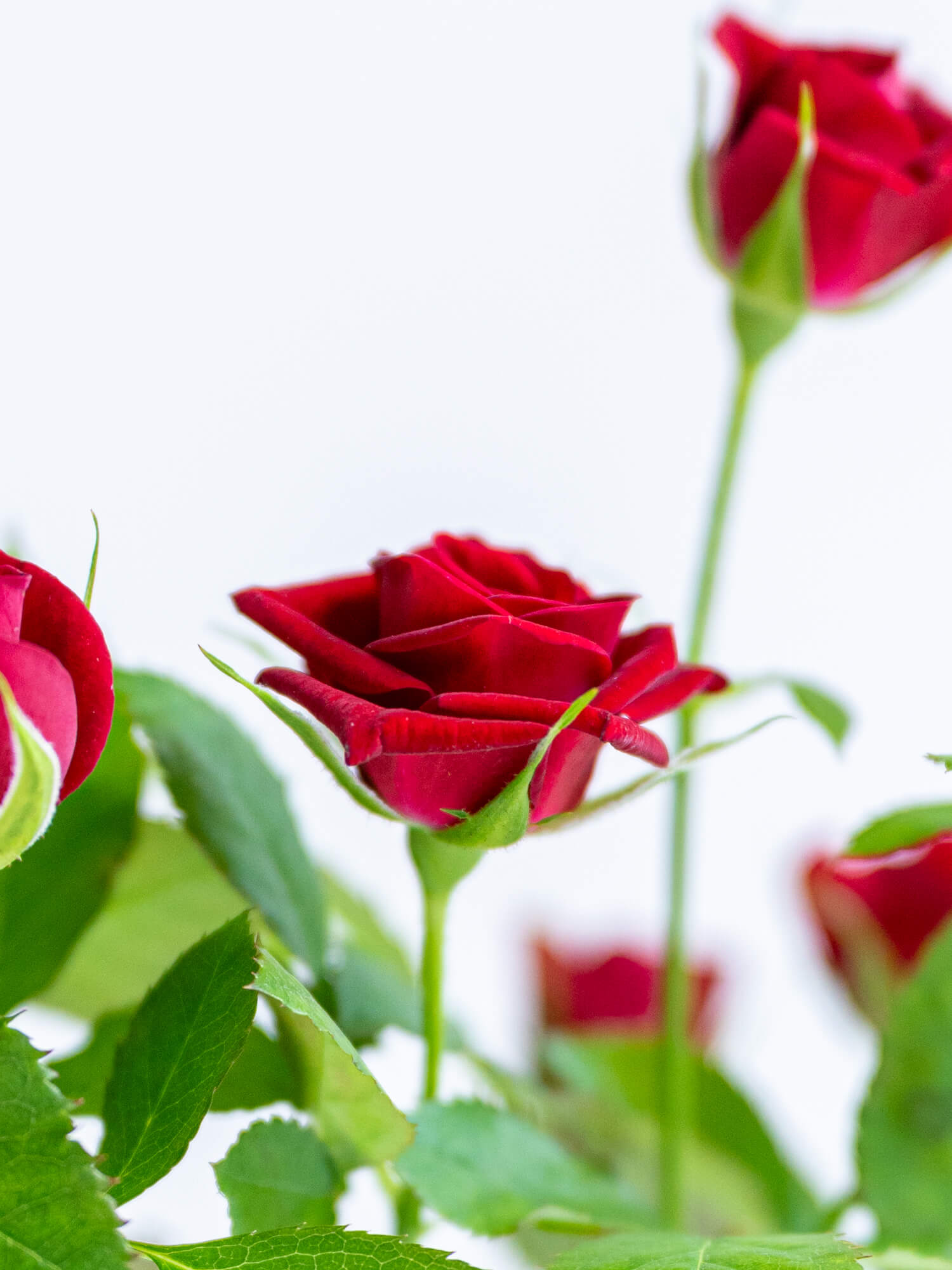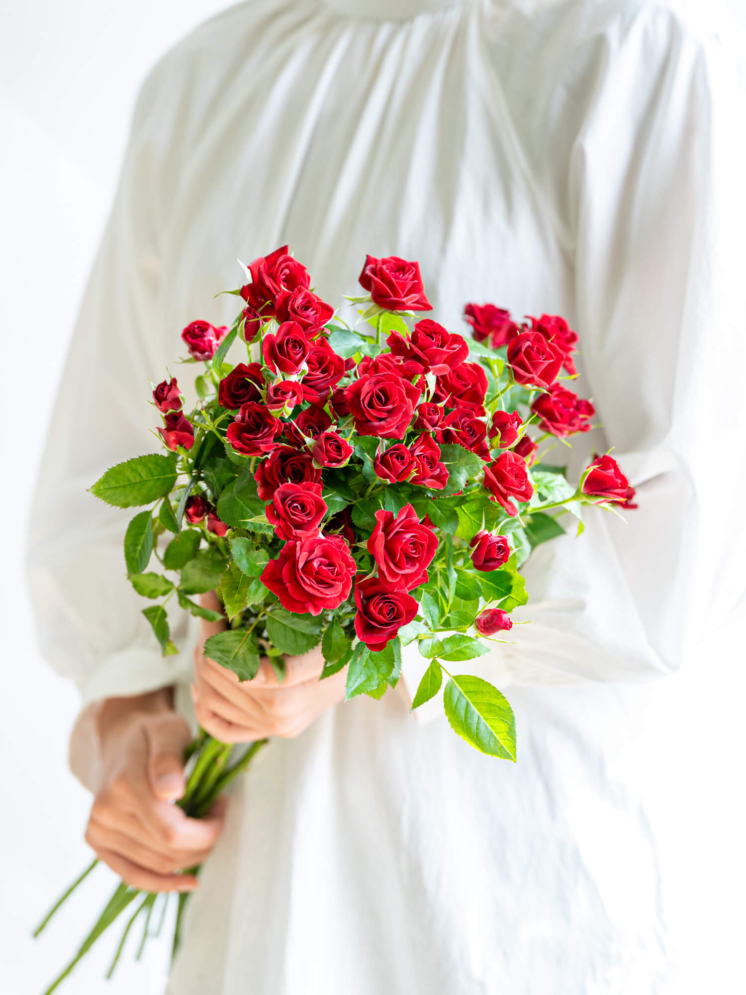 落ち着いた色から鮮やかなものまで、赤系SPバラはアレンジに深みと華やかさを与える定番花材です。ボリュームは入荷時期・産地によりイメージと異なる場合がございます。予めお含みおきください。