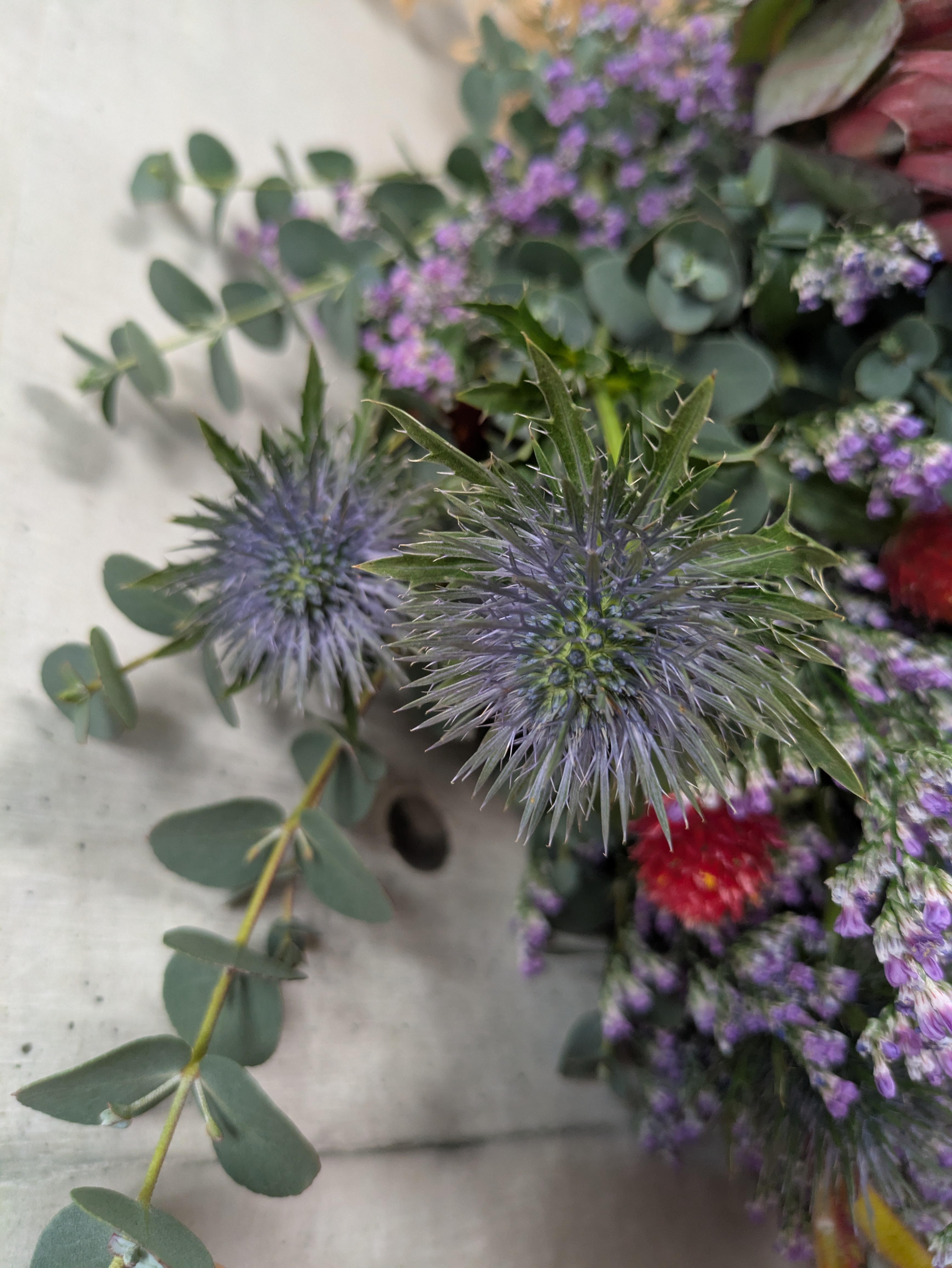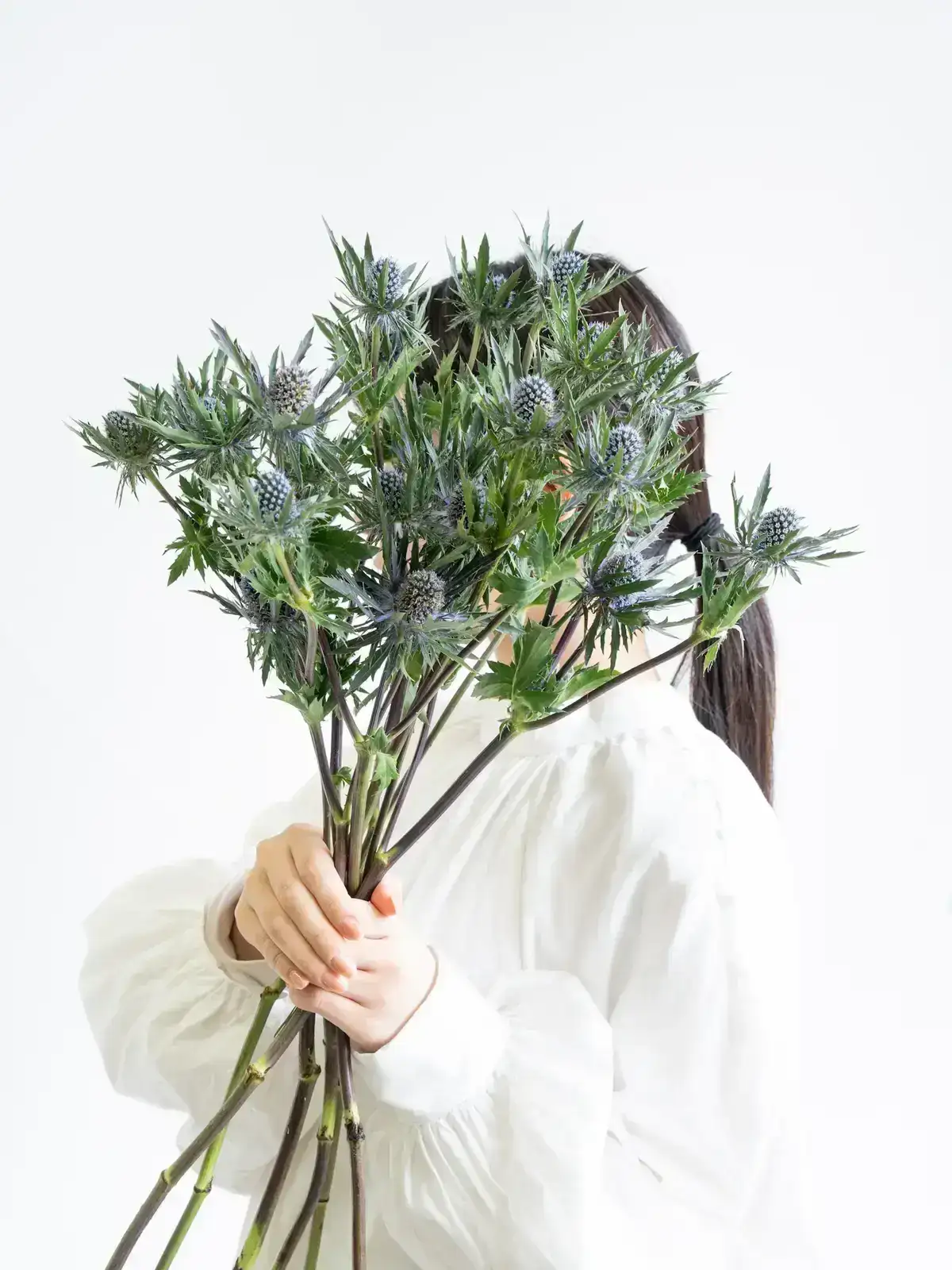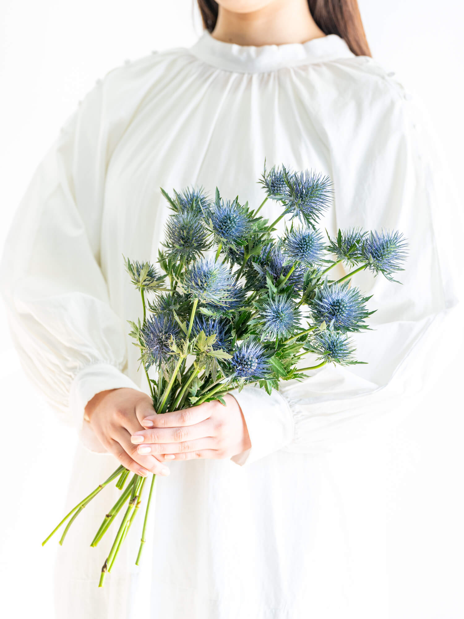 エリンジウムは金属的な質感を持つ花姿が特徴的で、個性的なアレンジに深みとアクセントを加えます。色合いや形には品種による幅があります。ボリュームは入荷時期・産地によりイメージと異なる場合がございます。予めお含みおきください。