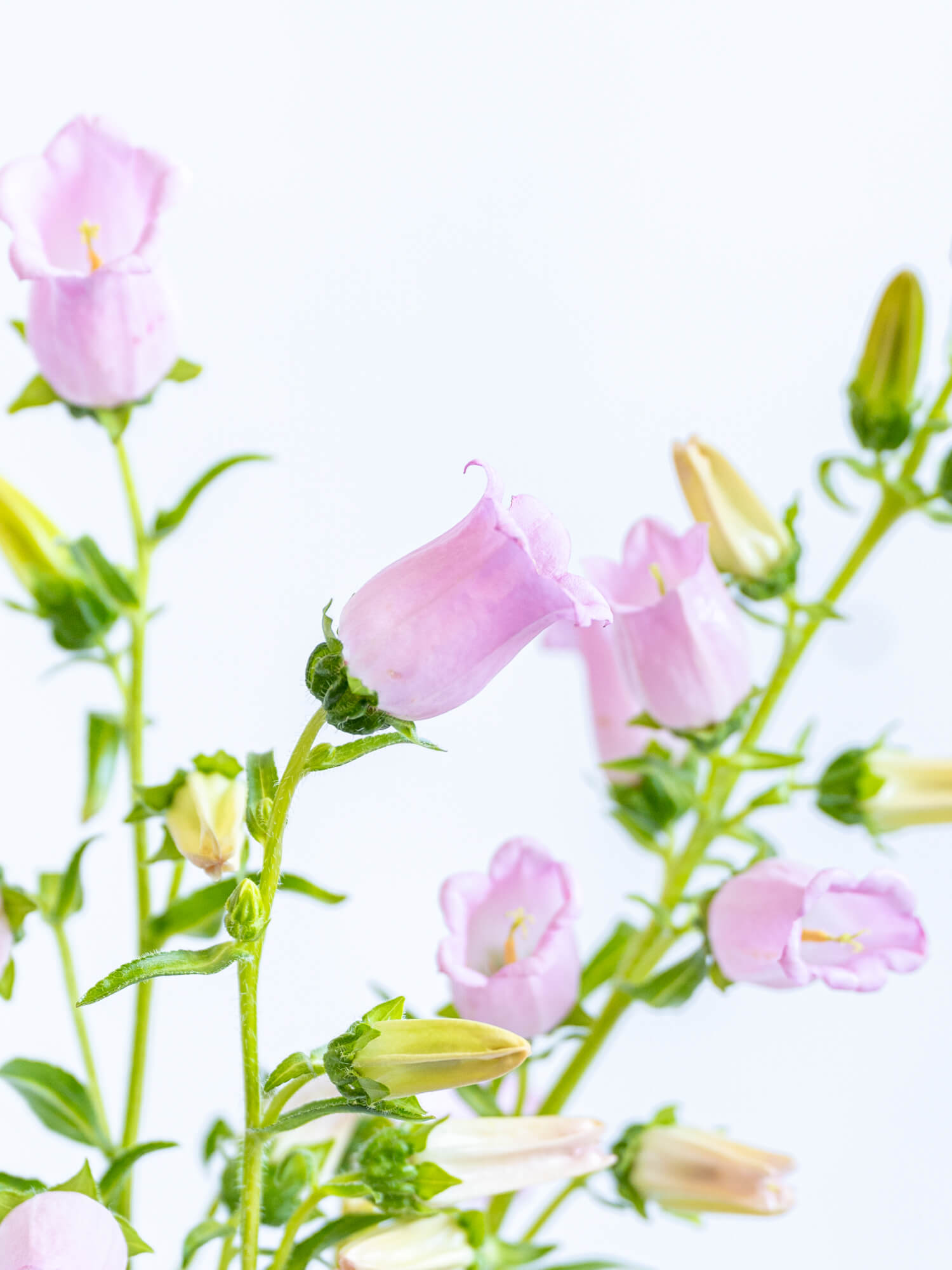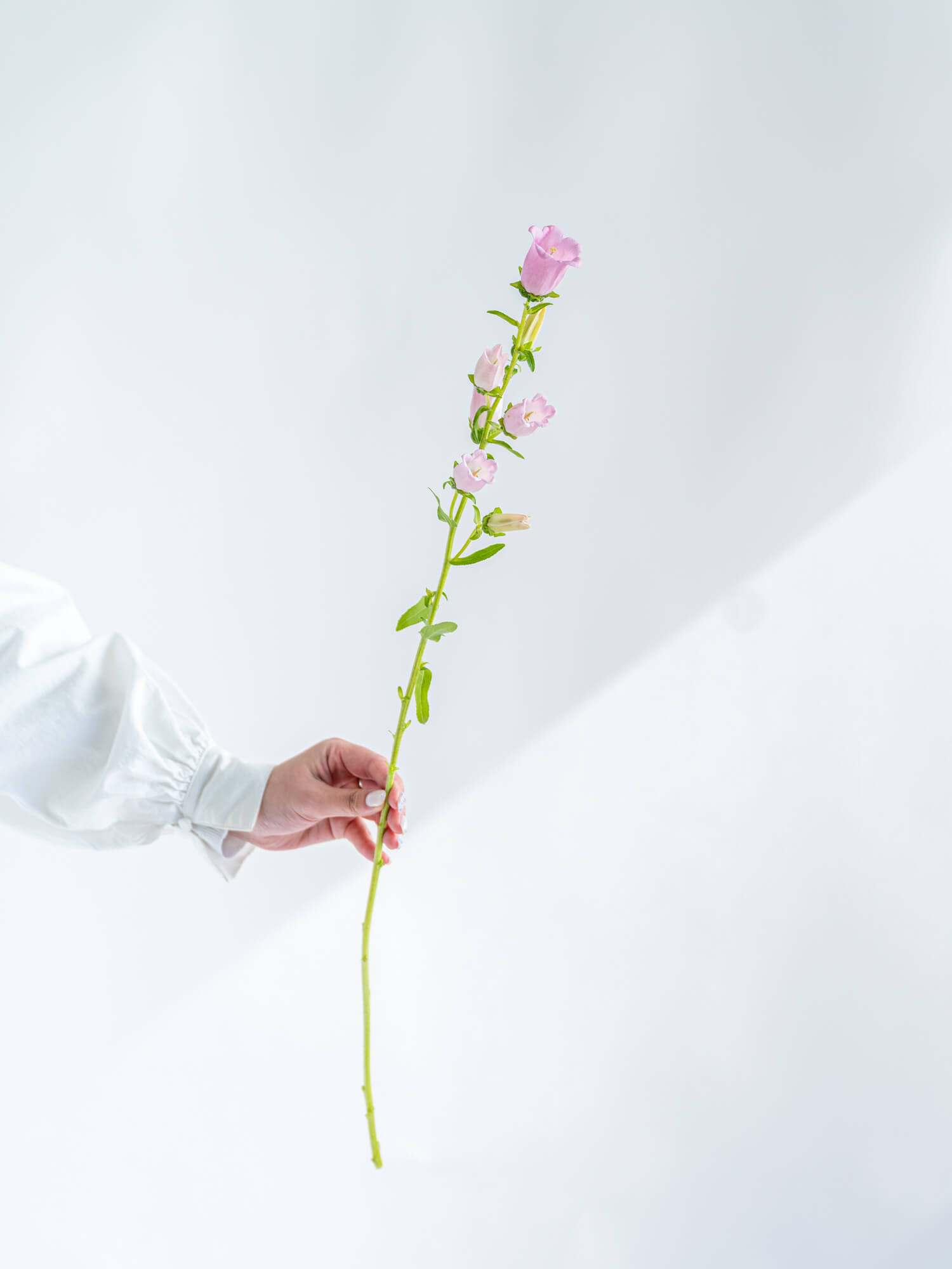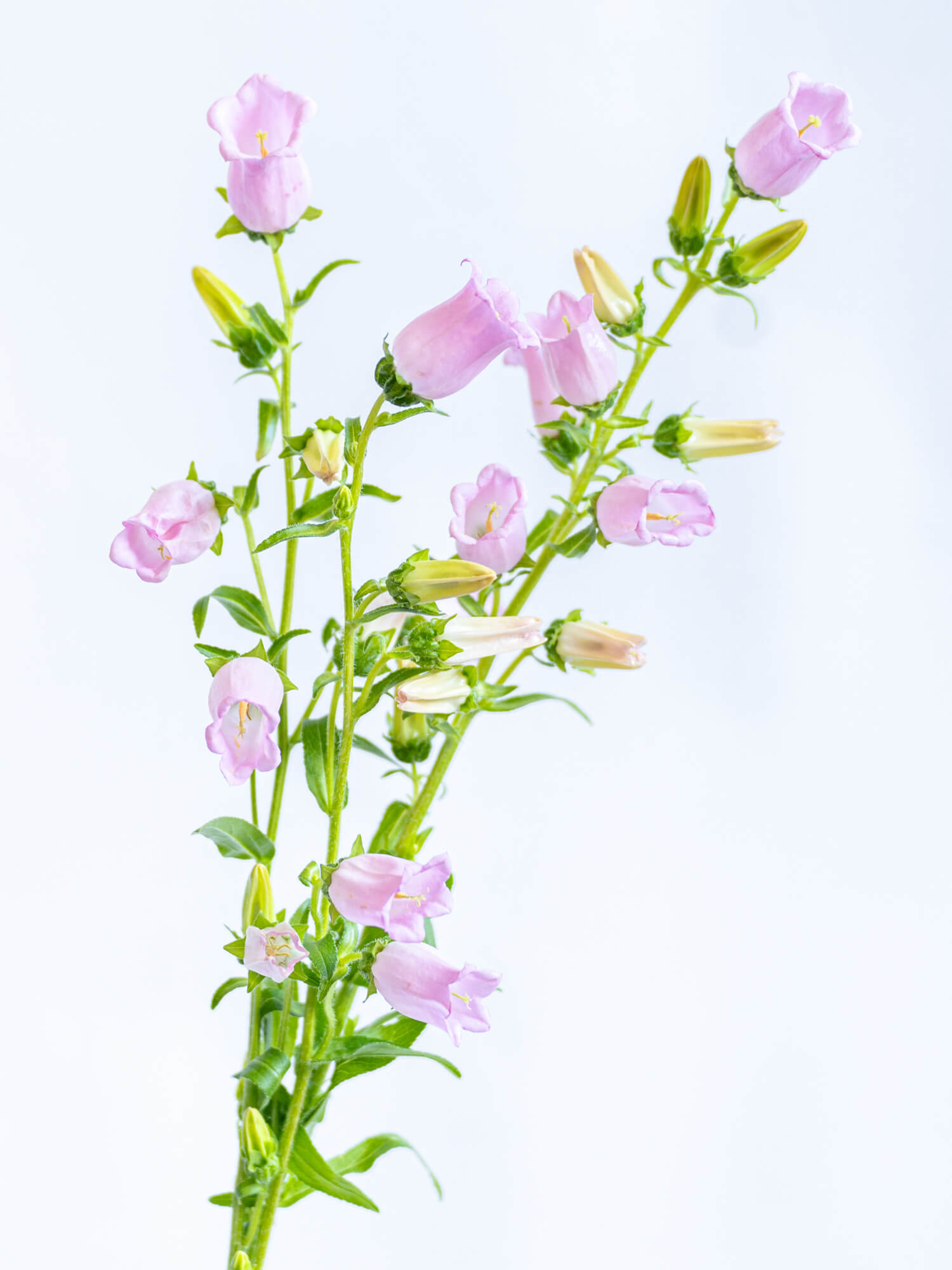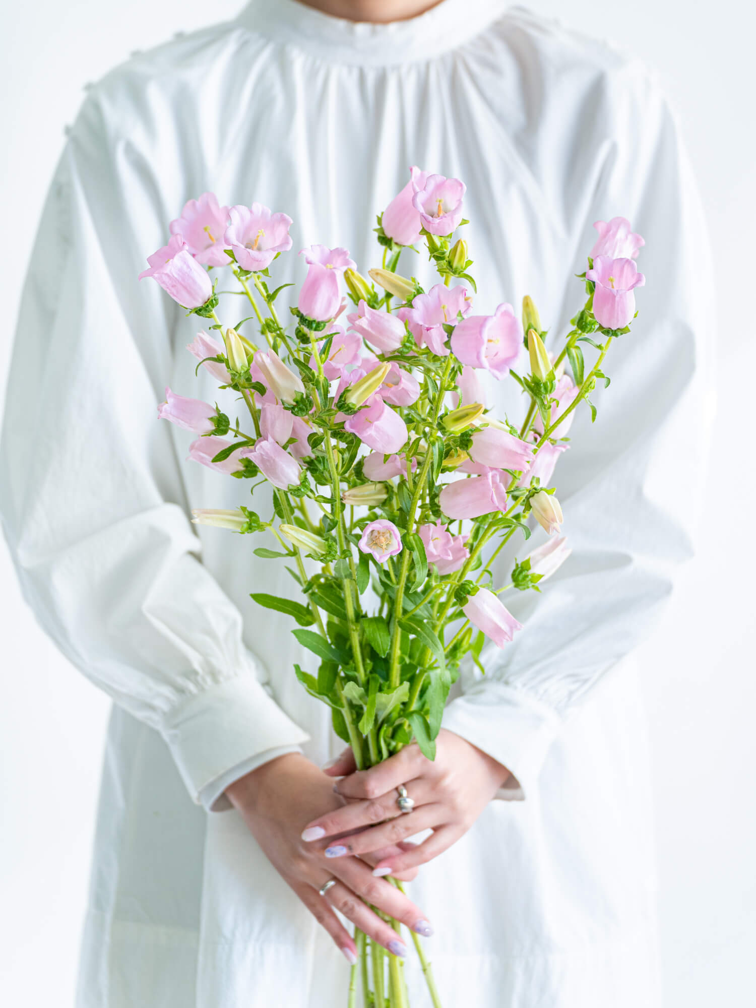 カンパニュラは釣鐘状の花がやさしく揺れる、可憐な印象の花材です。色合いや花の大きさには品種による違いがあります。ボリュームは入荷時期・産地によりイメージと異なる場合がございます。予めお含みおきください。