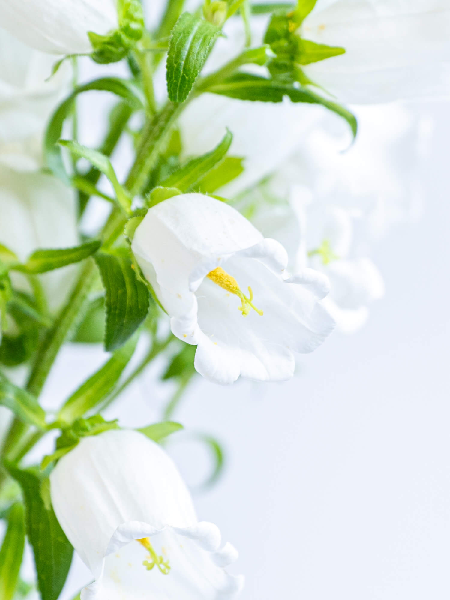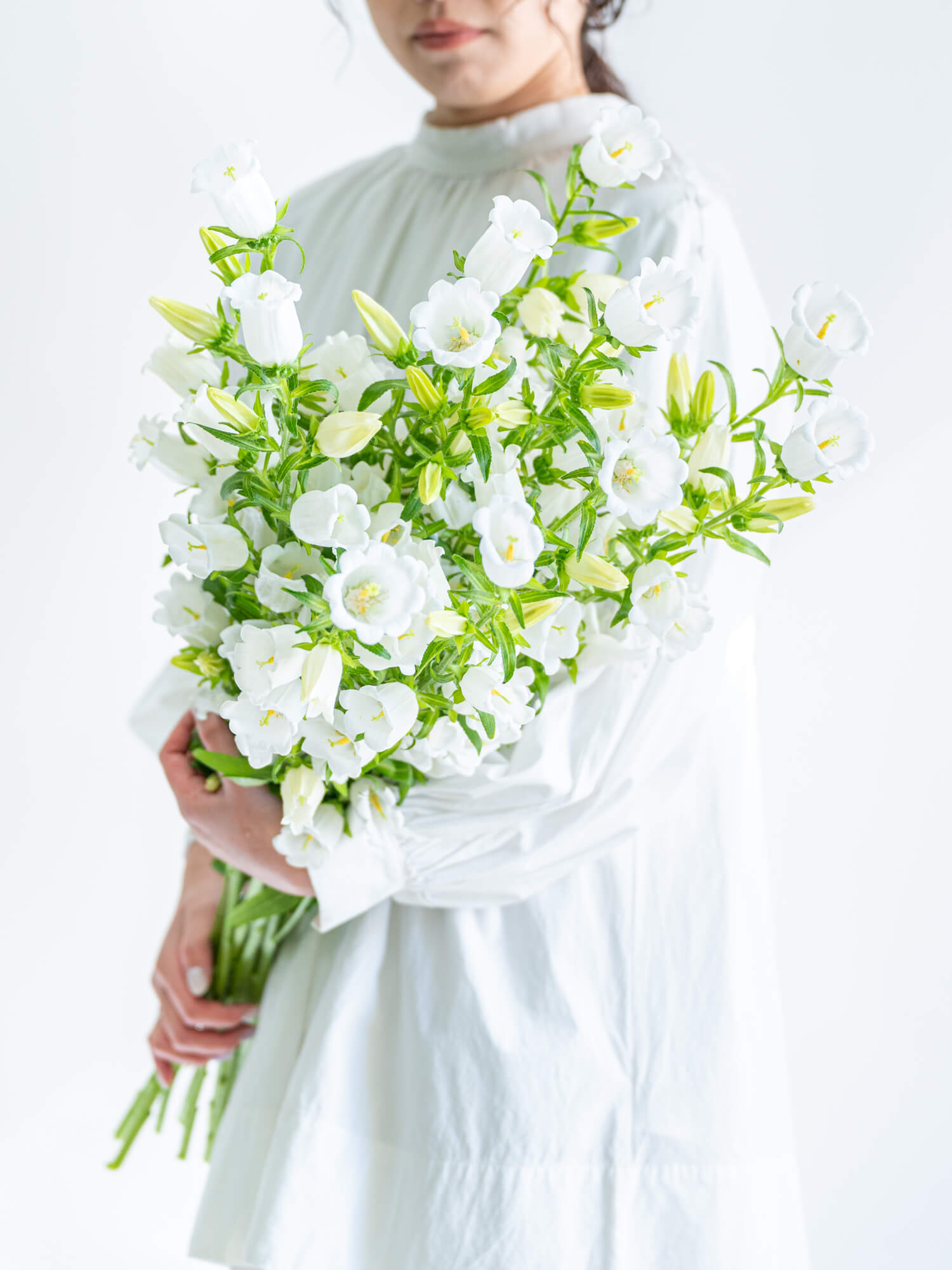 清楚な印象を持つ白系のカンパニュラは、やわらかな曲線とすっきりとした立ち姿が魅力。ナチュラルな装花に適しています。ボリュームは入荷時期・産地によりイメージと異なる場合がございます。予めお含みおきください。