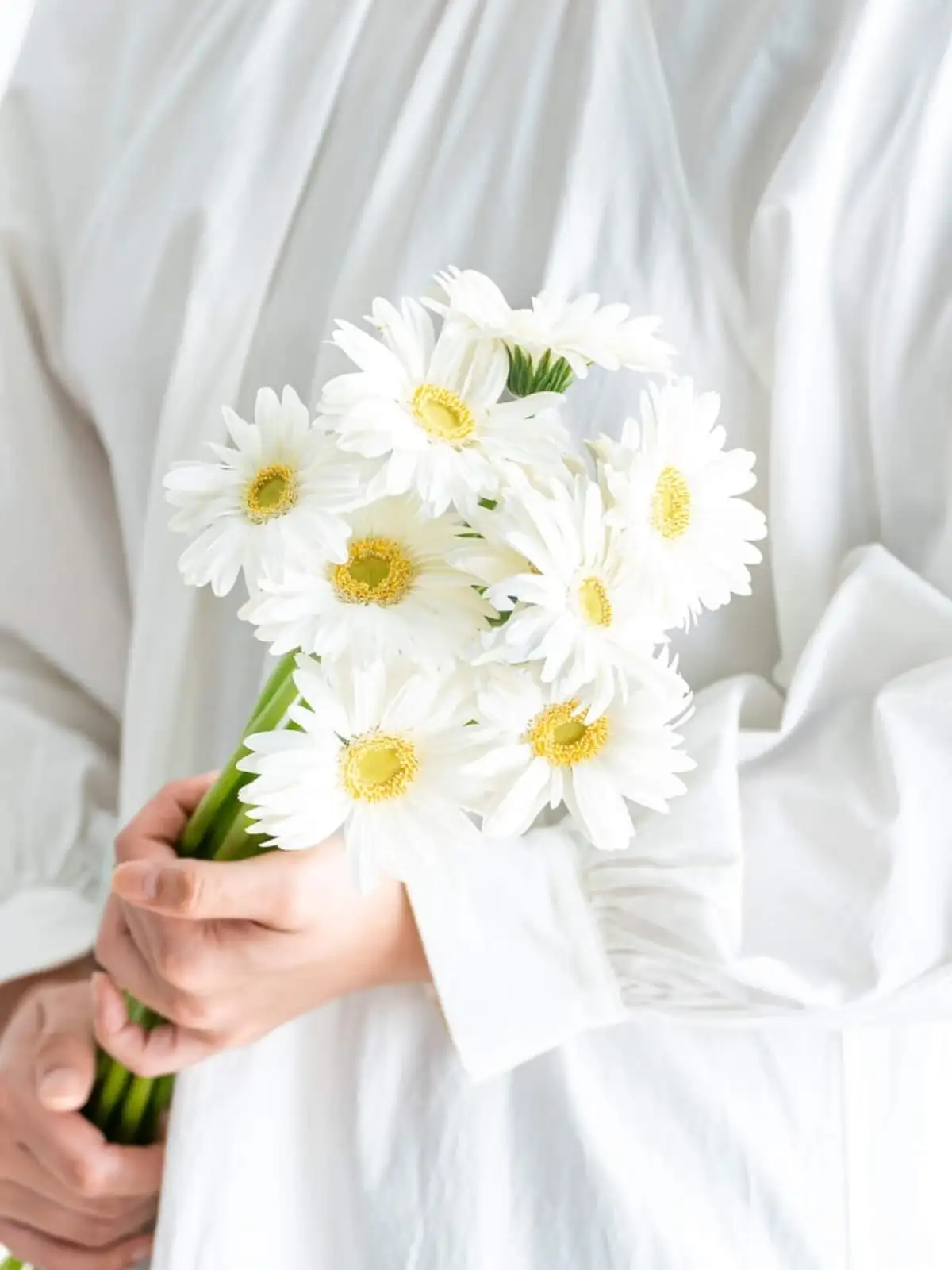 白系の一重咲きガーベラは清潔感があり、他の花材とも調和しやすい万能なアクセント花材です。ボリュームは入荷時期・産地によりイメージと異なる場合がございます。予めお含みおきください。