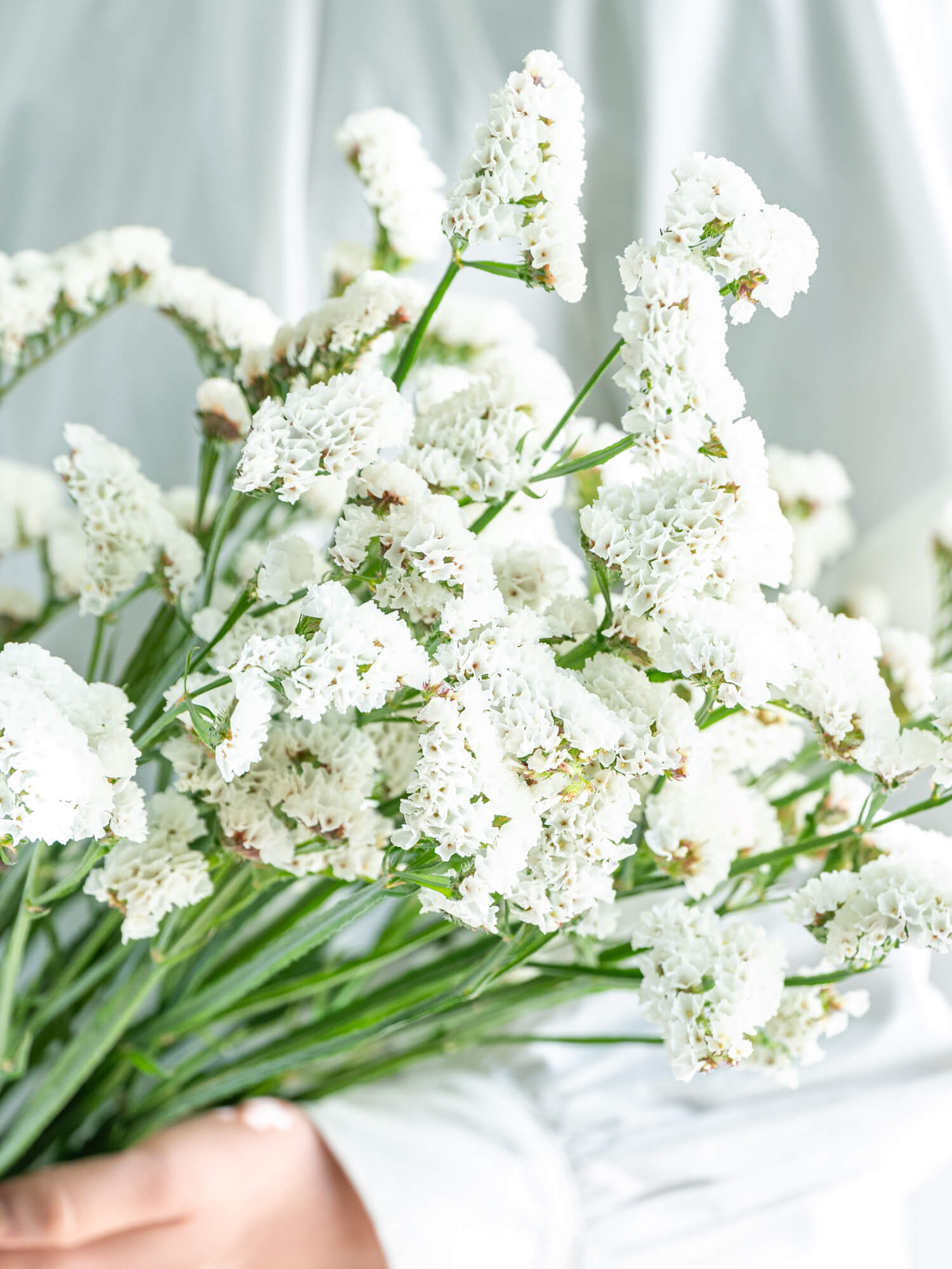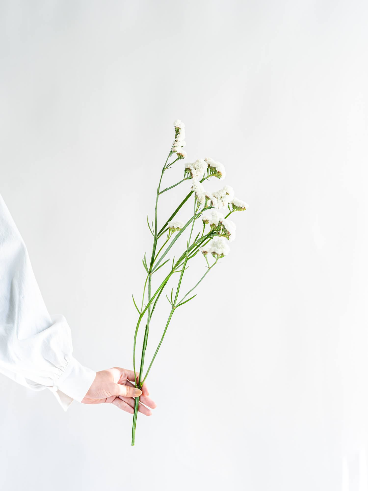 清楚な印象を持つ白系スターチス。控えめながら存在感があり、幅広い用途に使える万能花材です。ボリュームは入荷時期・産地によりイメージと異なる場合がございます。予めお含みおきください。