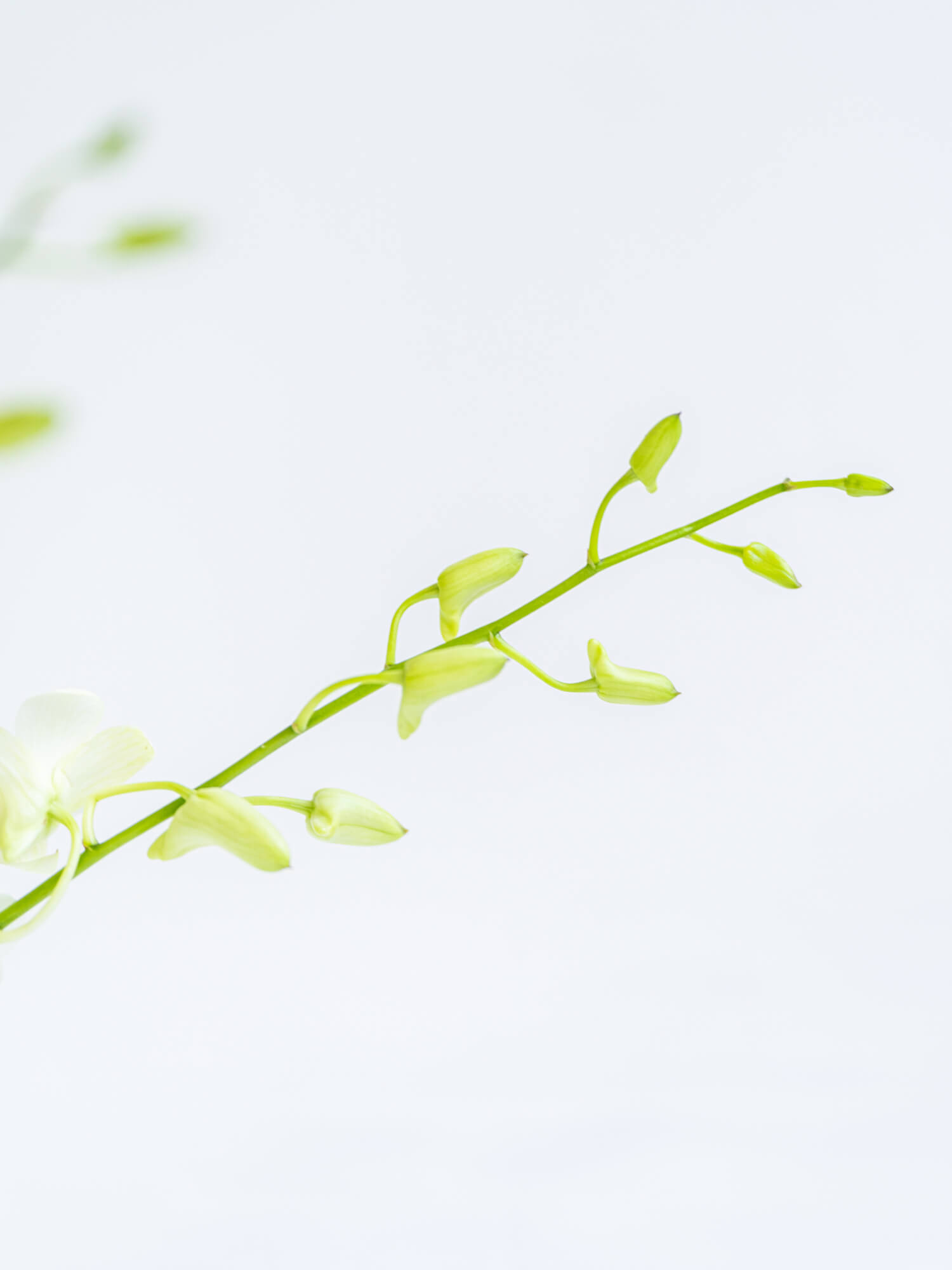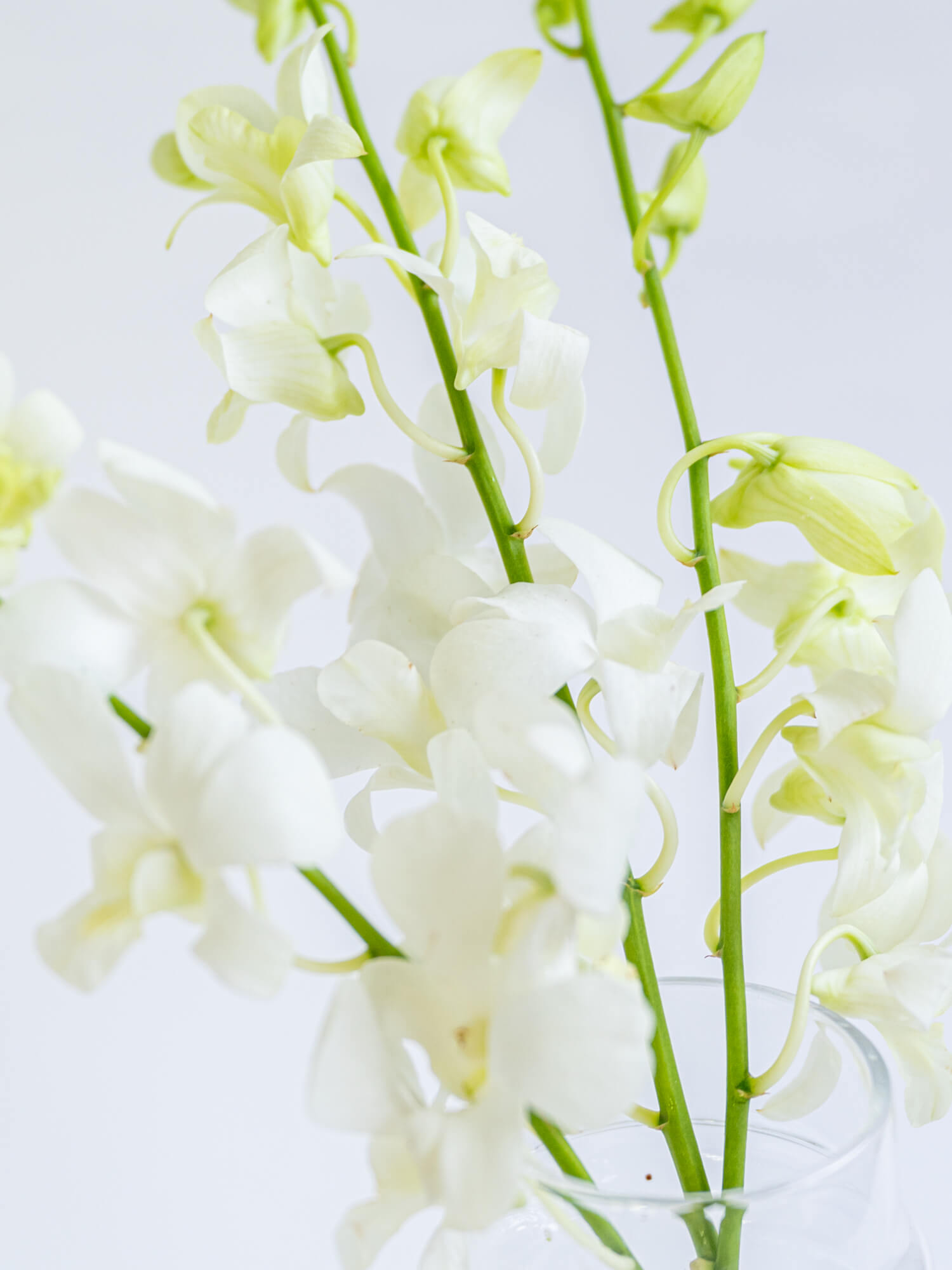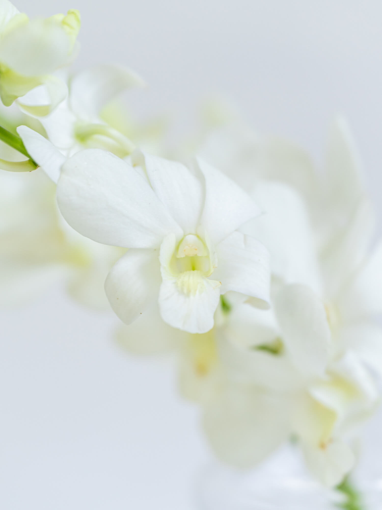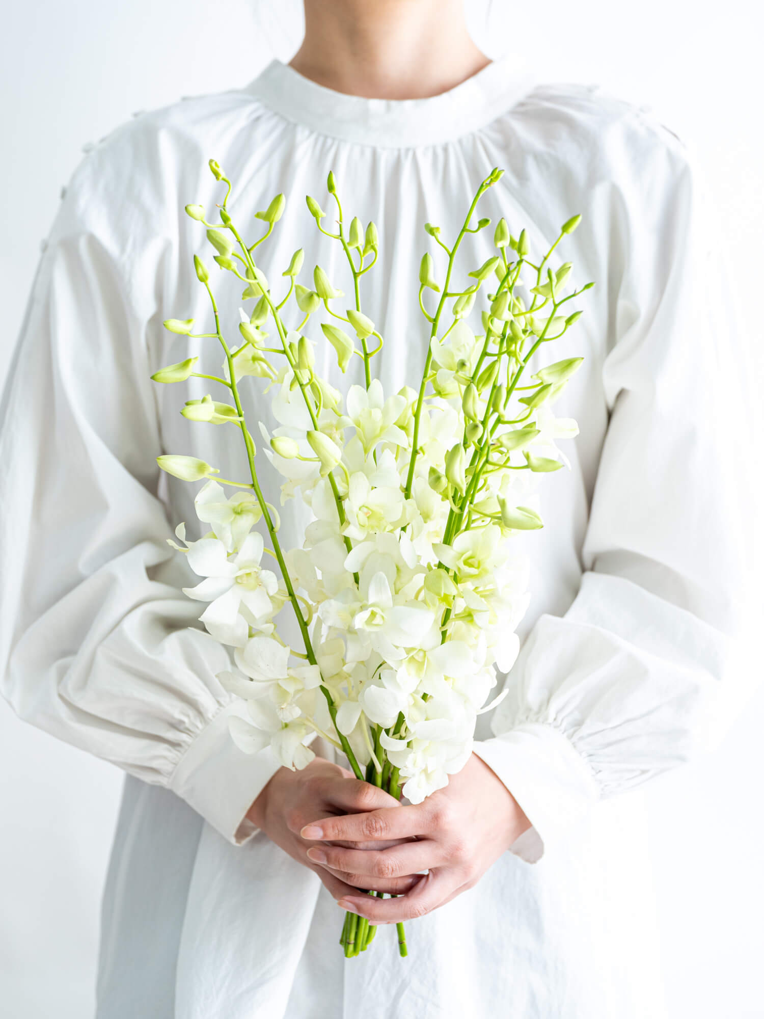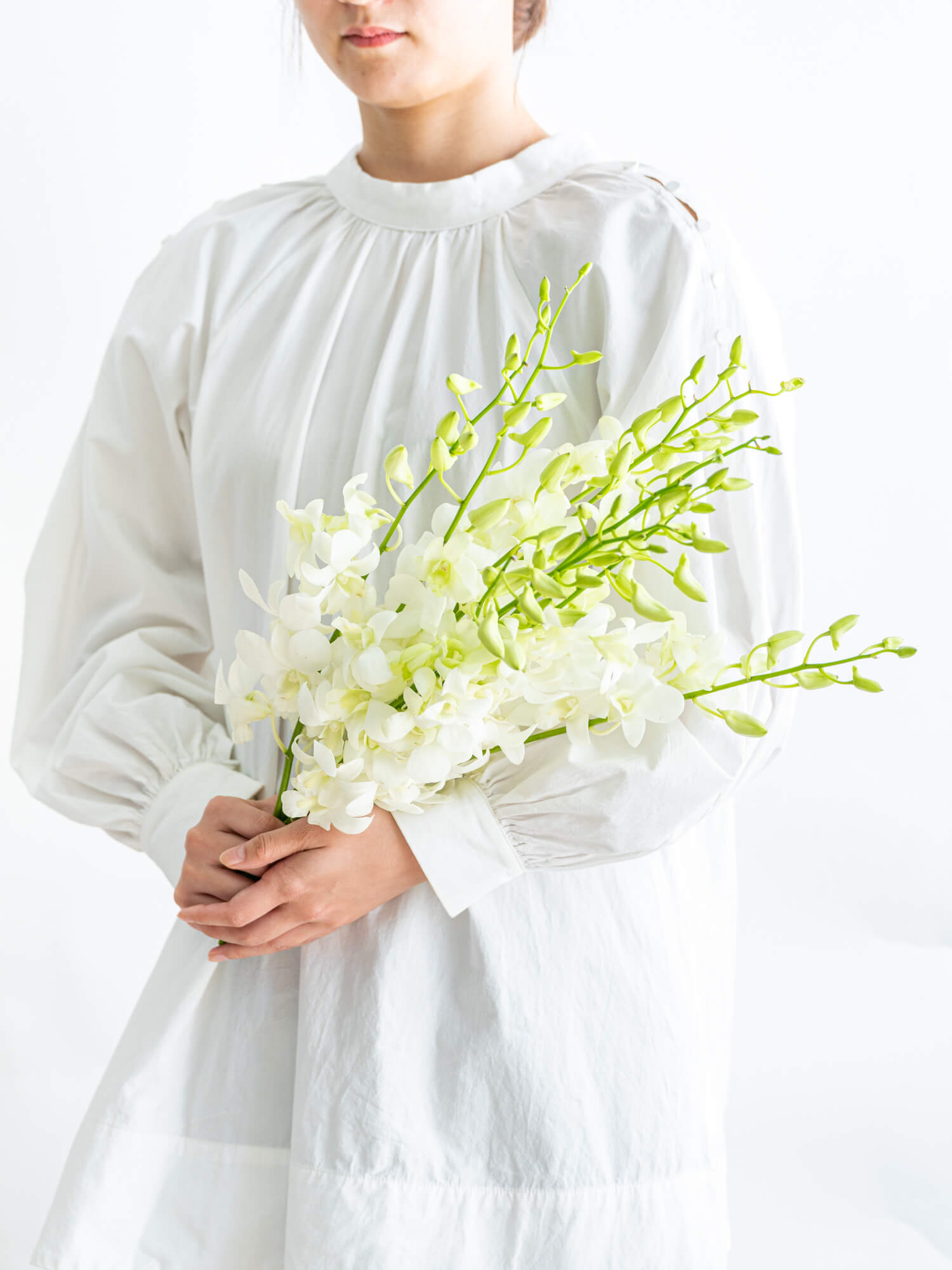 清潔感ある白系のデンファレは、洗練された雰囲気を演出できる花材。ブライダルやフォーマル装花に向いています。ボリュームは入荷時期・産地によりイメージと異なる場合がございます。予めお含みおきください。