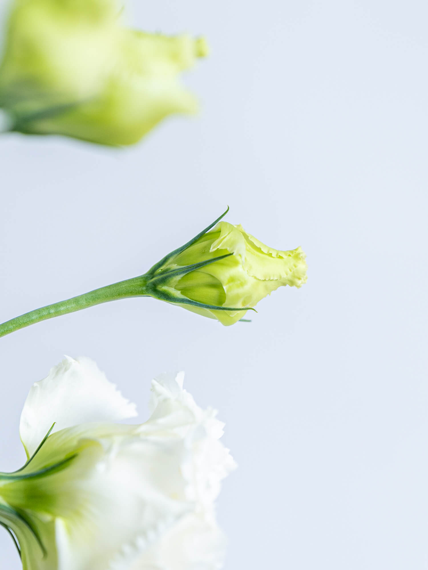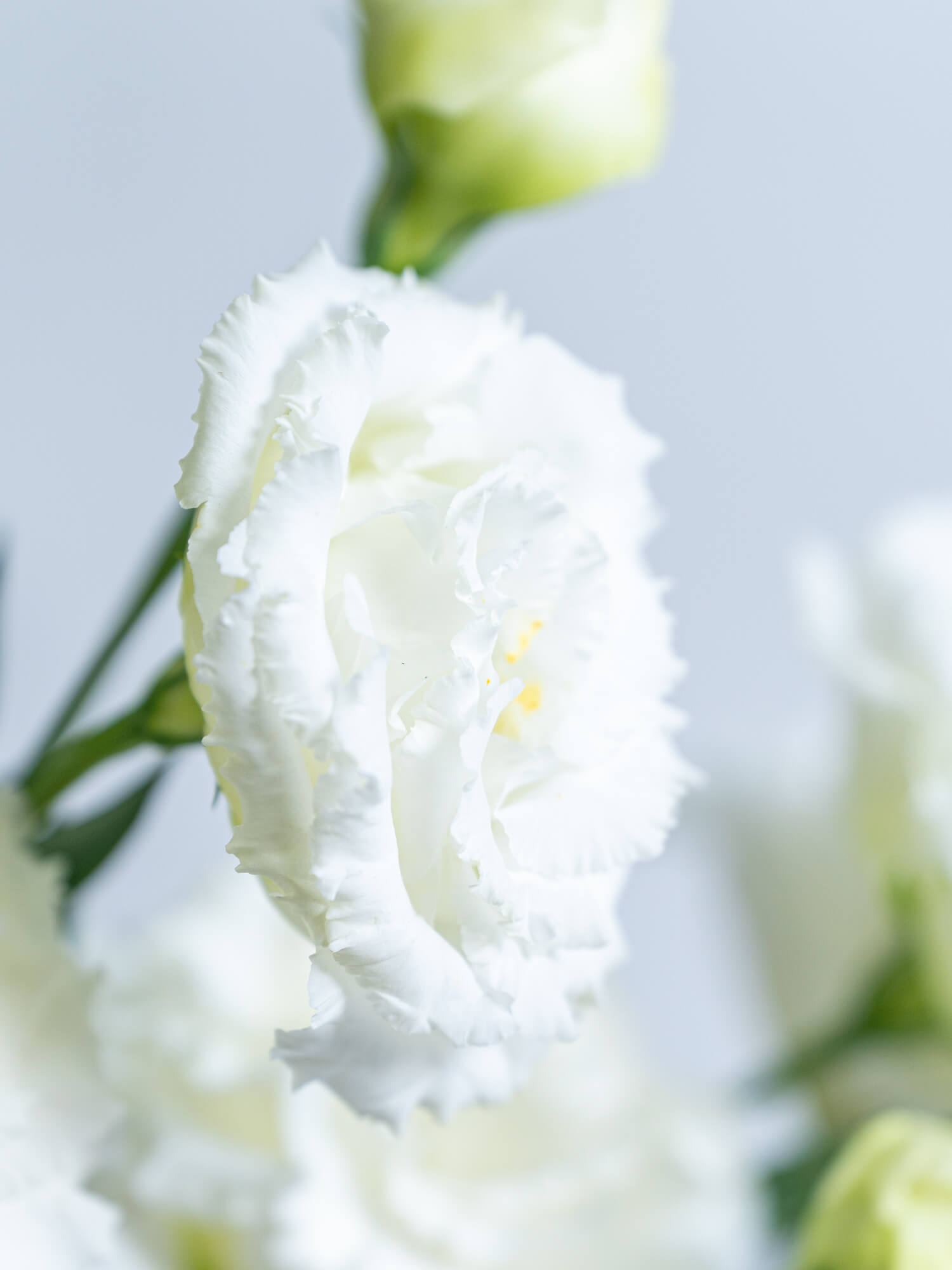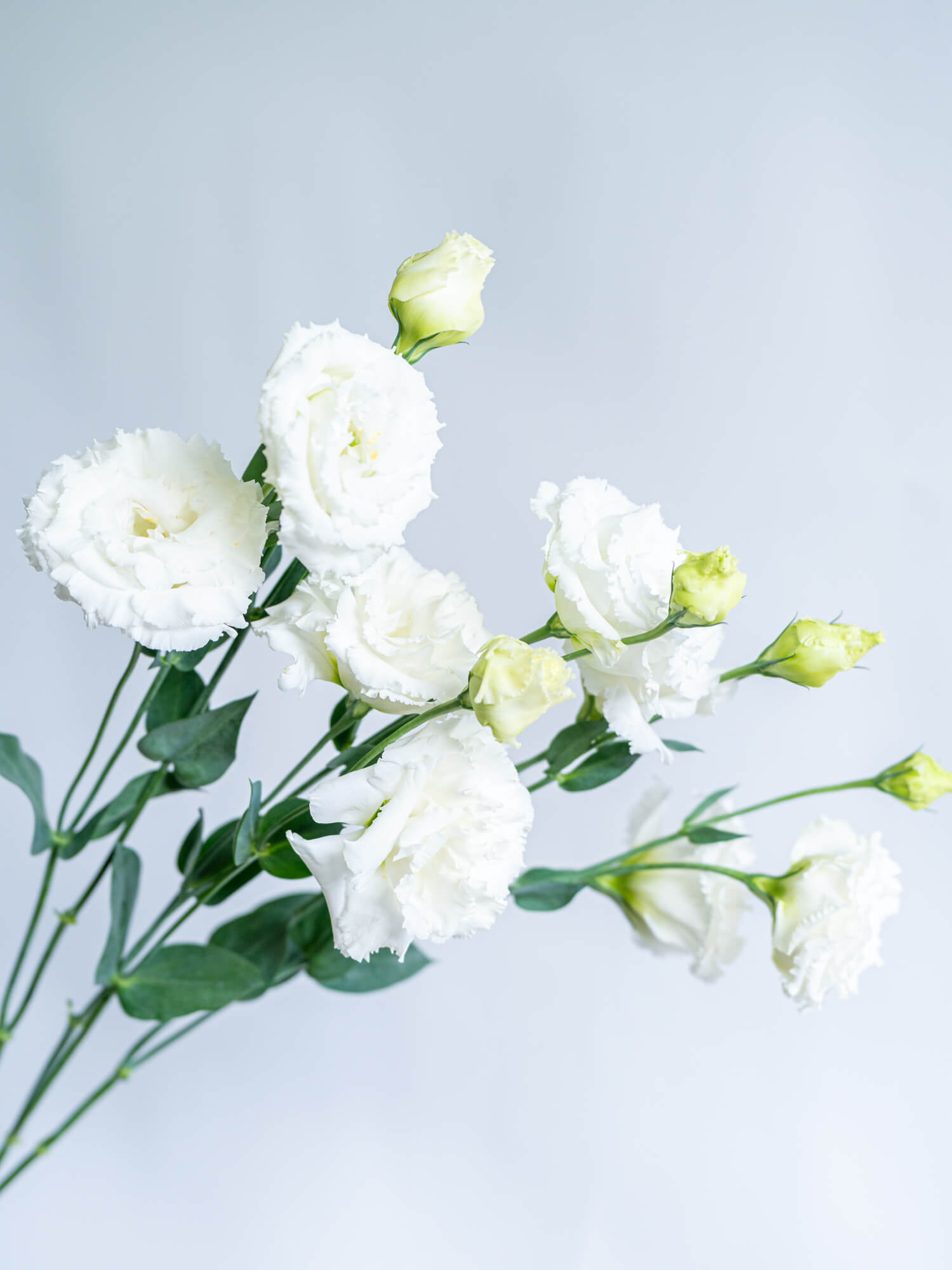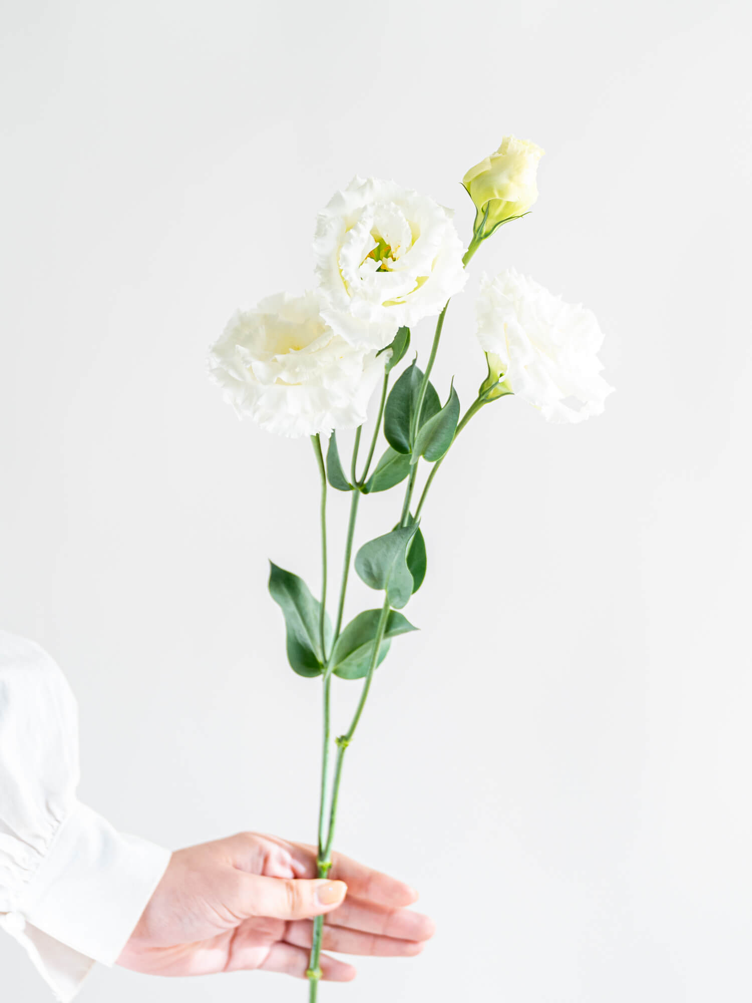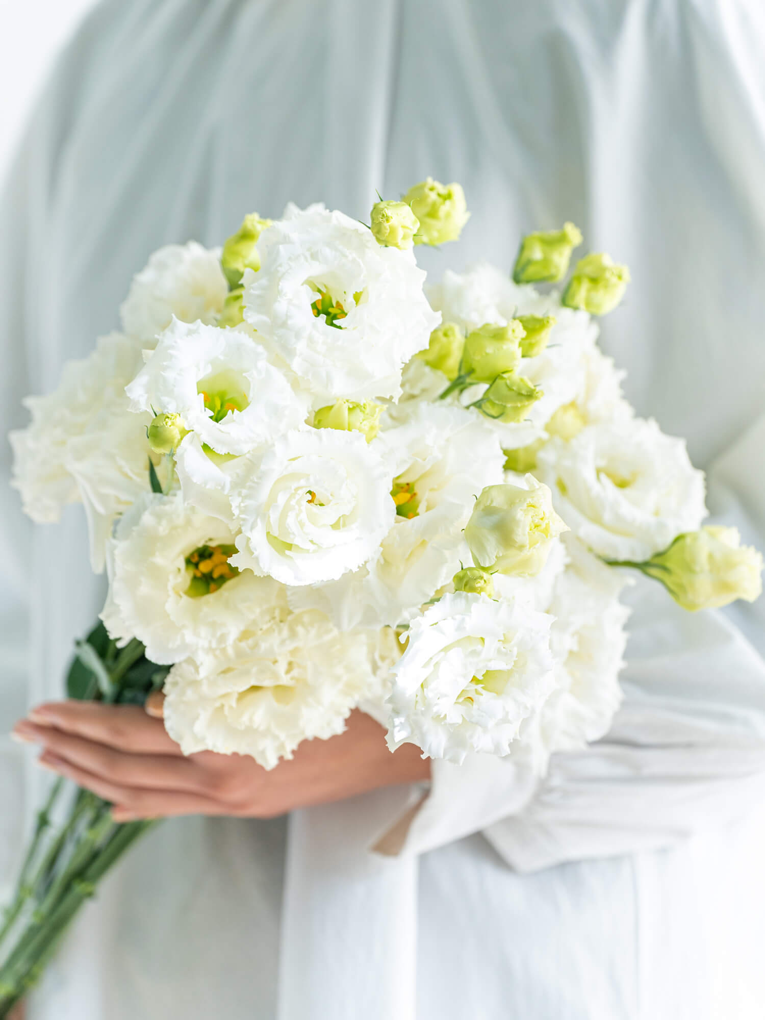 清楚な白系のトルコキキョウは、やさしい曲線の花びらが特徴。幅広いシーンで使える万能な花材です。ボリュームは入荷時期・産地によりイメージと異なる場合がございます。予めお含みおきください。