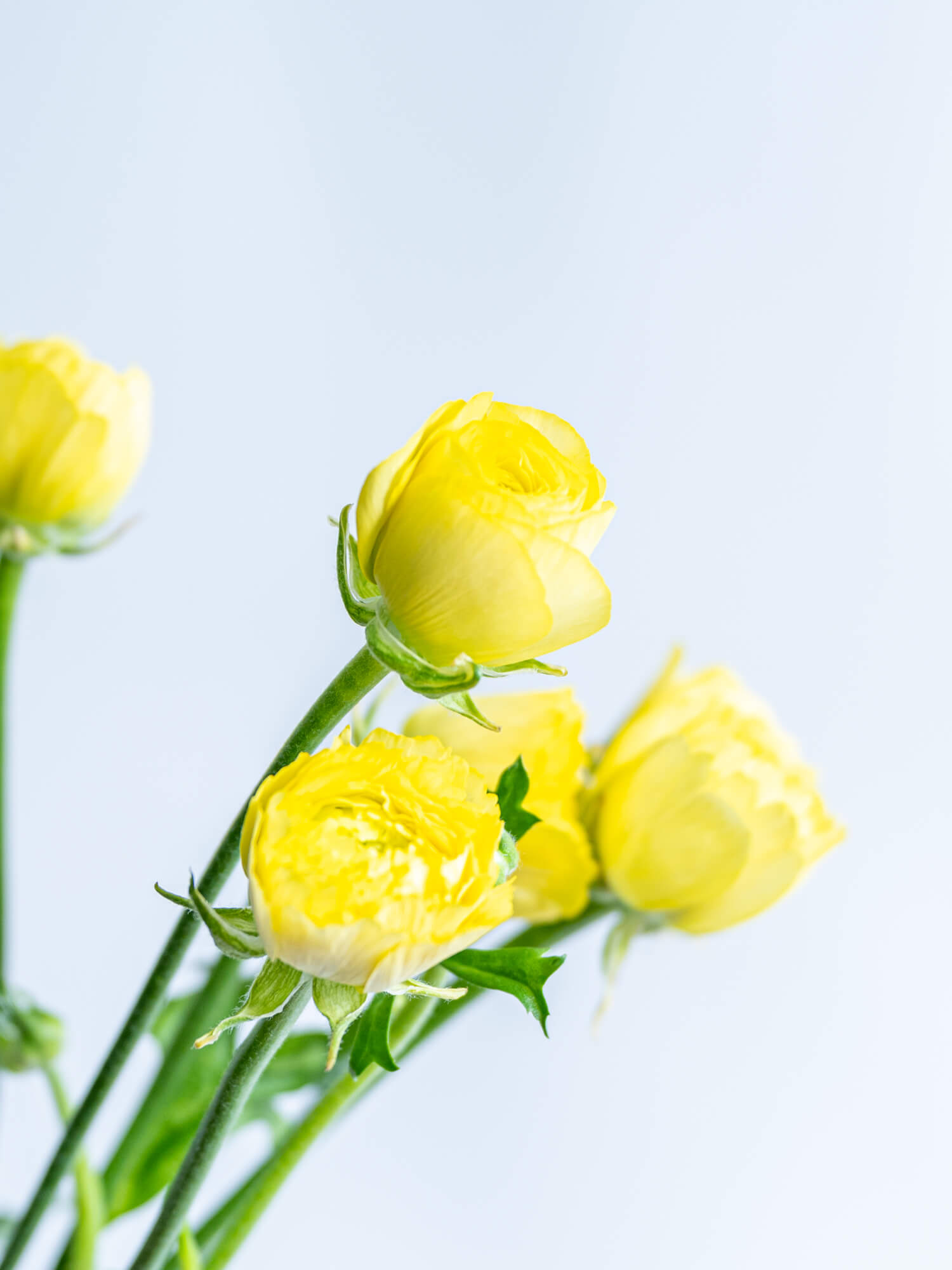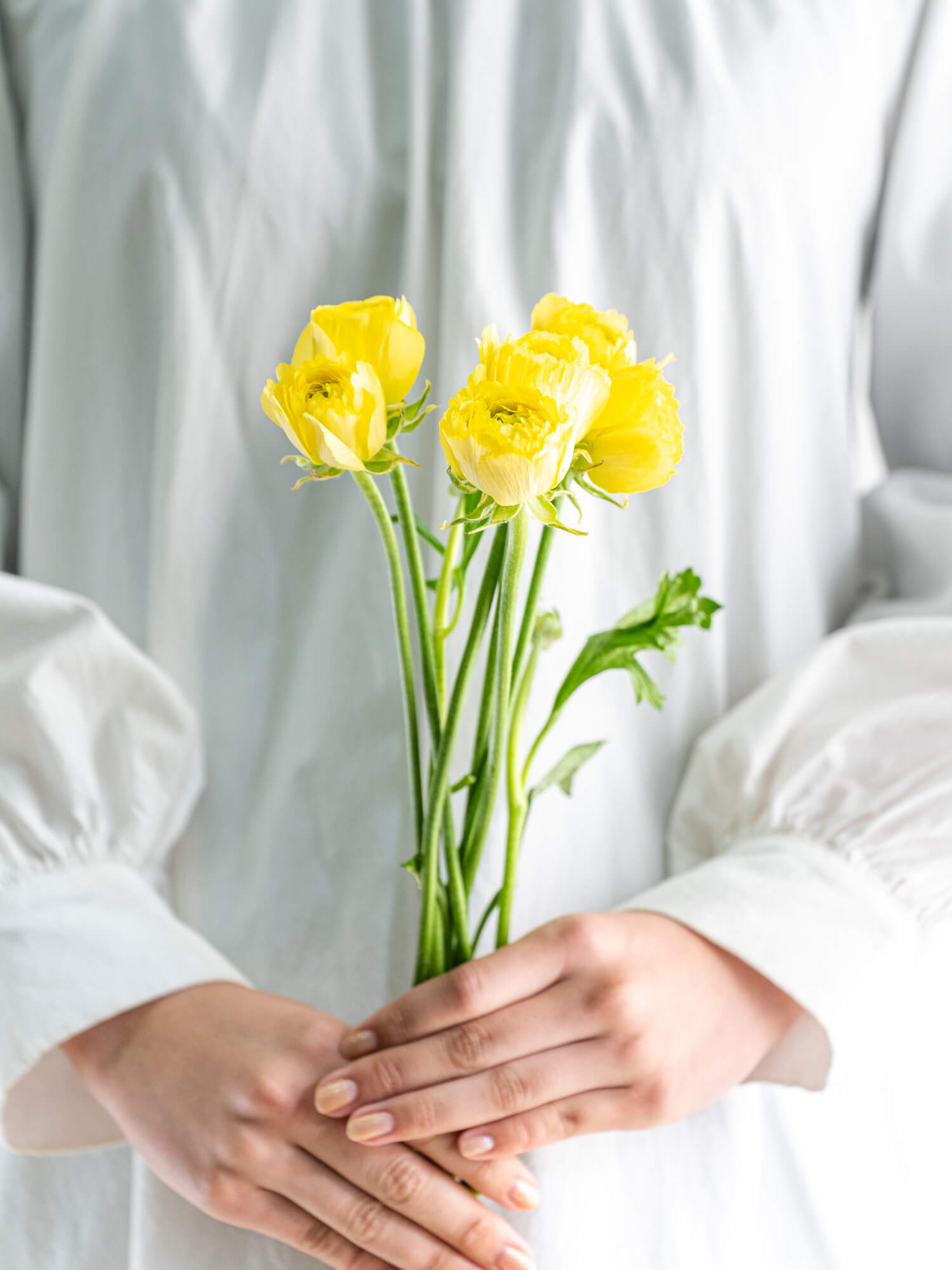 ラナンキュラスは明るい色合いのものも多く、黄色系の品種は春らしい装花やギフトに活躍します。咲き方は品種により異なります。ボリュームは入荷時期・産地によりイメージと異なる場合がございます。予めお含みおきください。