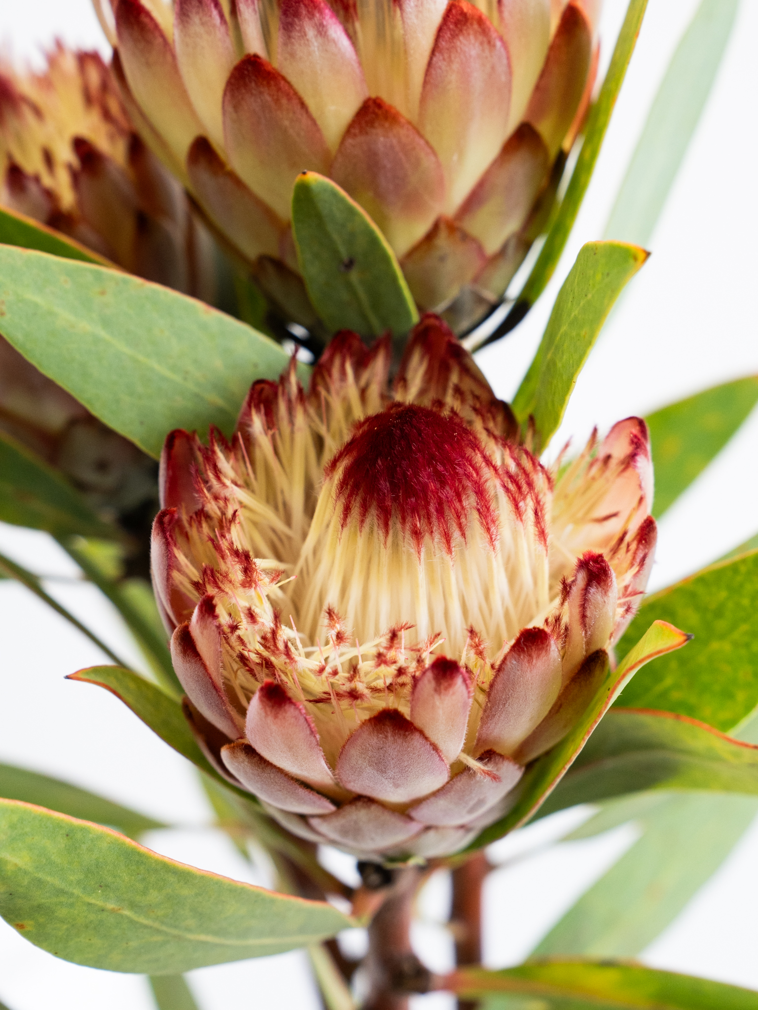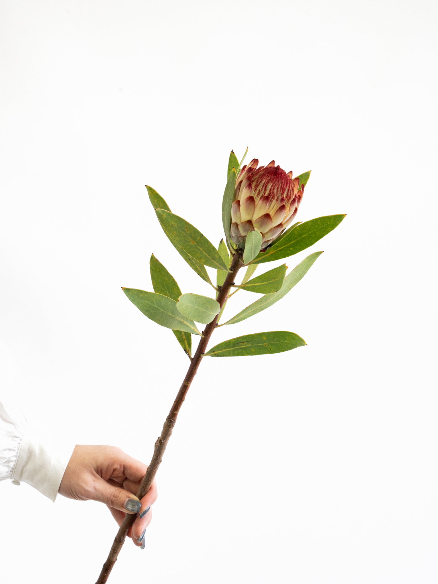 深紅の色合いと独特の形状が特徴のプロテア。ダイナミックなアレンジや空間装飾に適しています。