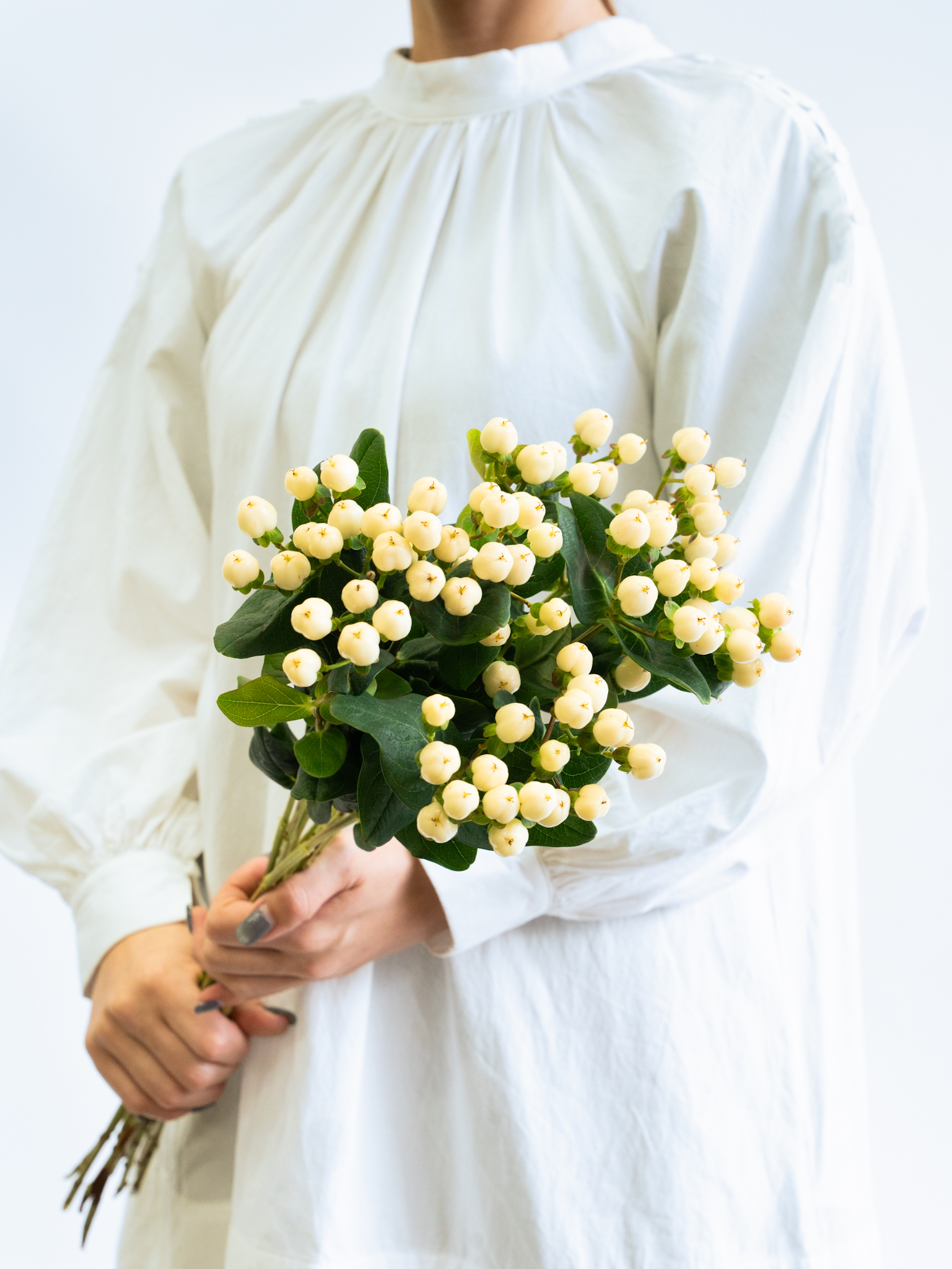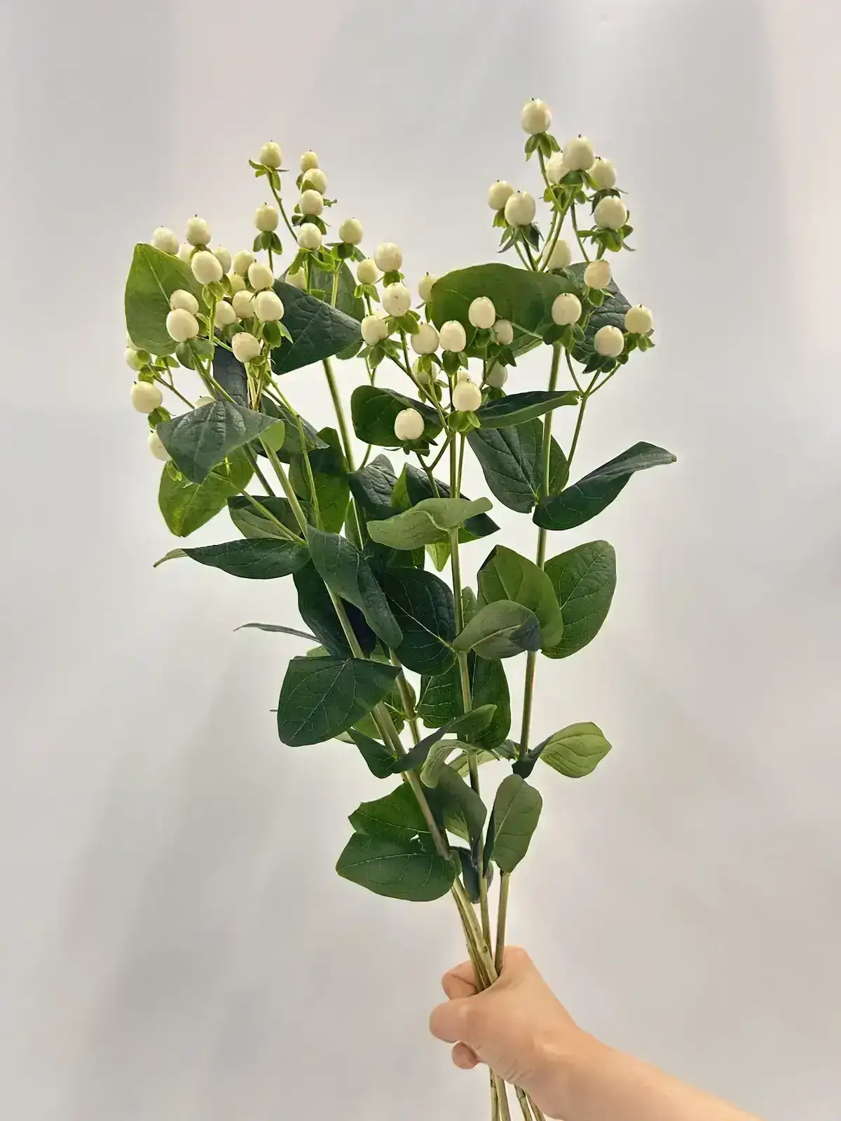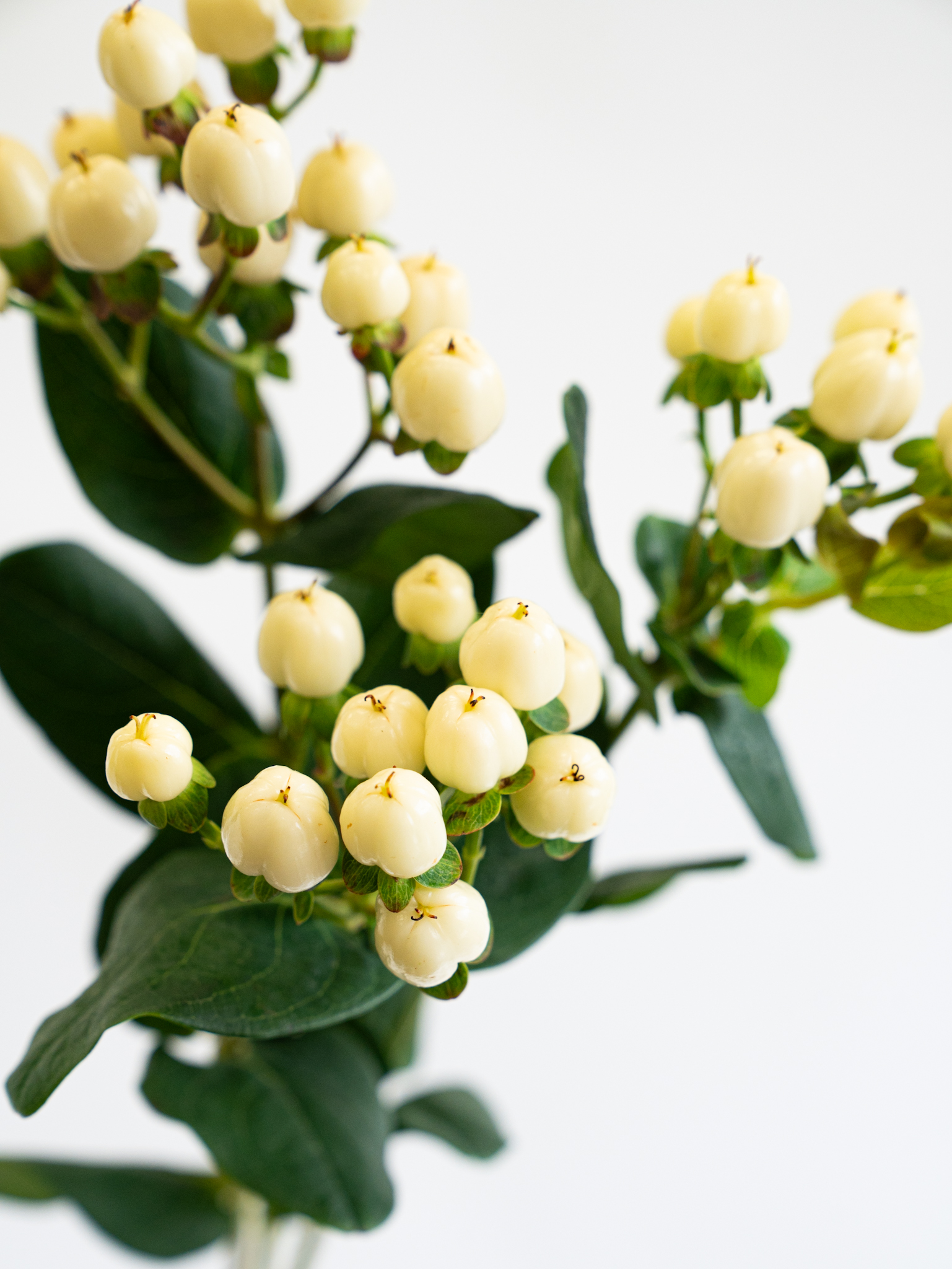 白い実が清楚で上品な印象を与えるヒペリカム。ブライダルやナチュラル系アレンジに適しています。