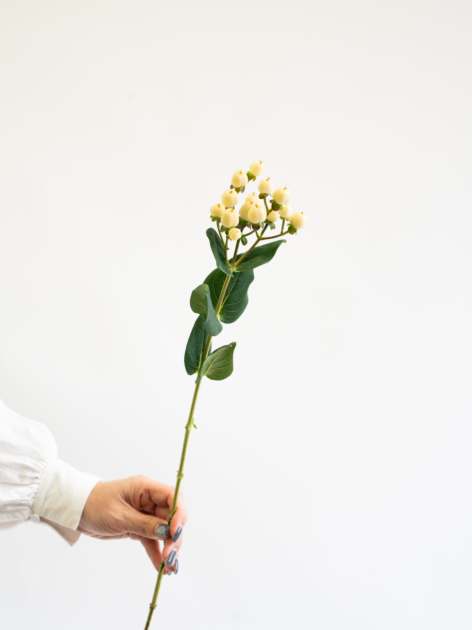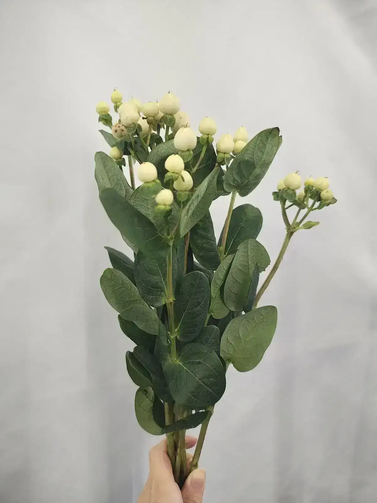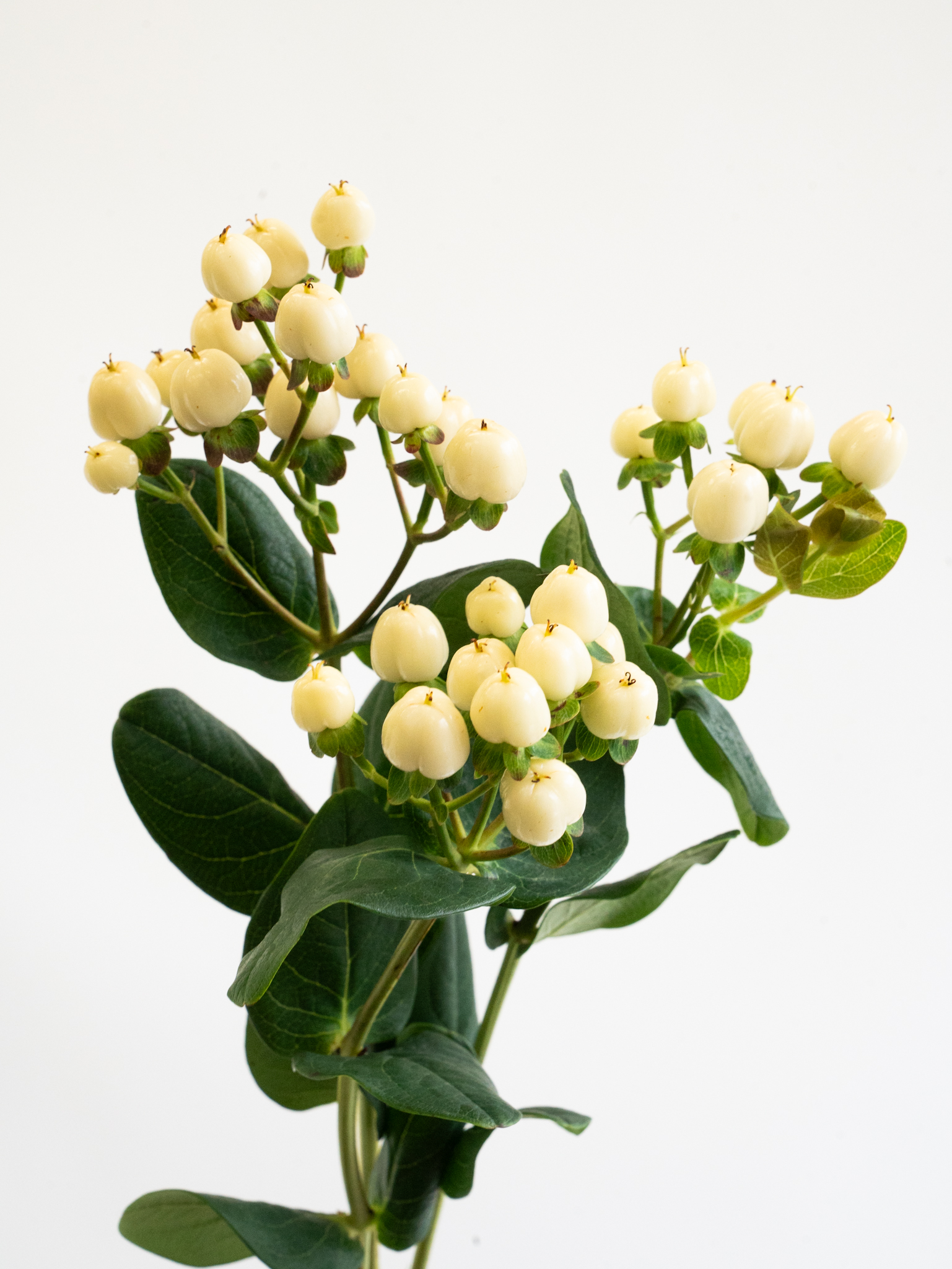 白い実が清楚で上品な印象を与えるヒペリカム。ブライダルやナチュラル系アレンジに適しています。