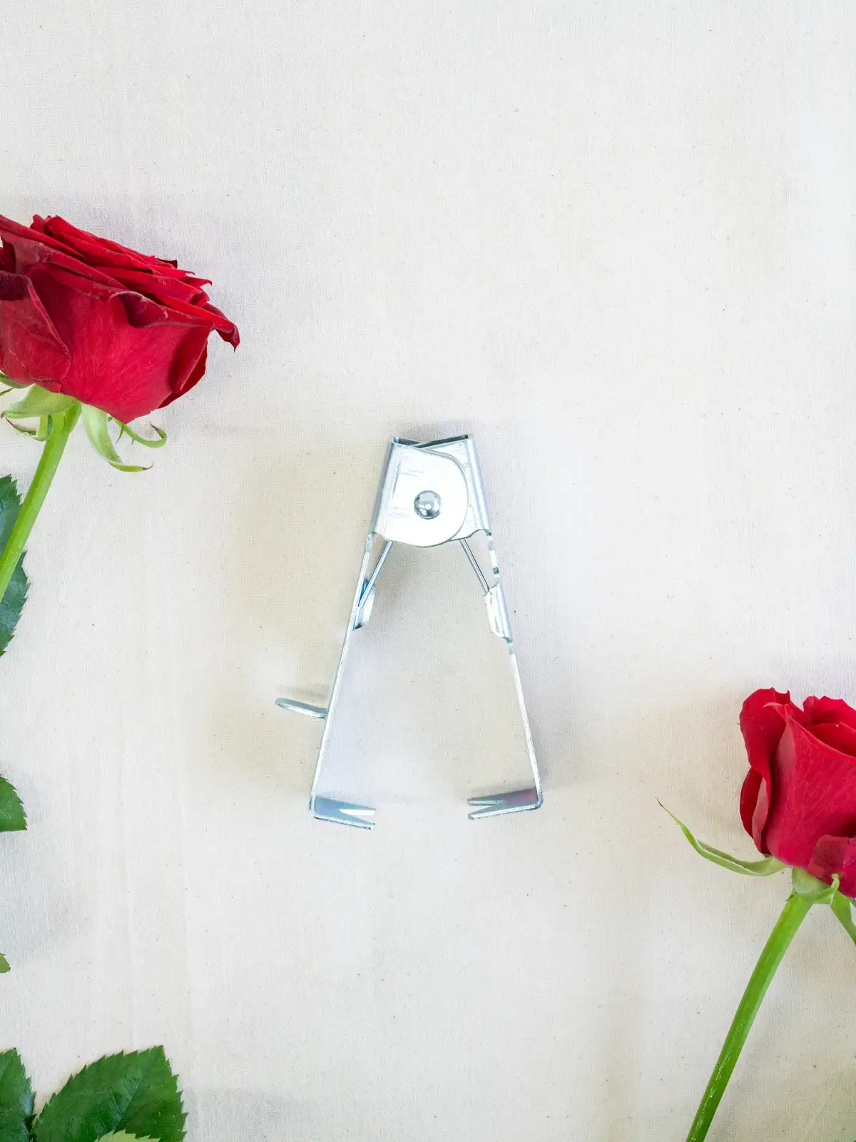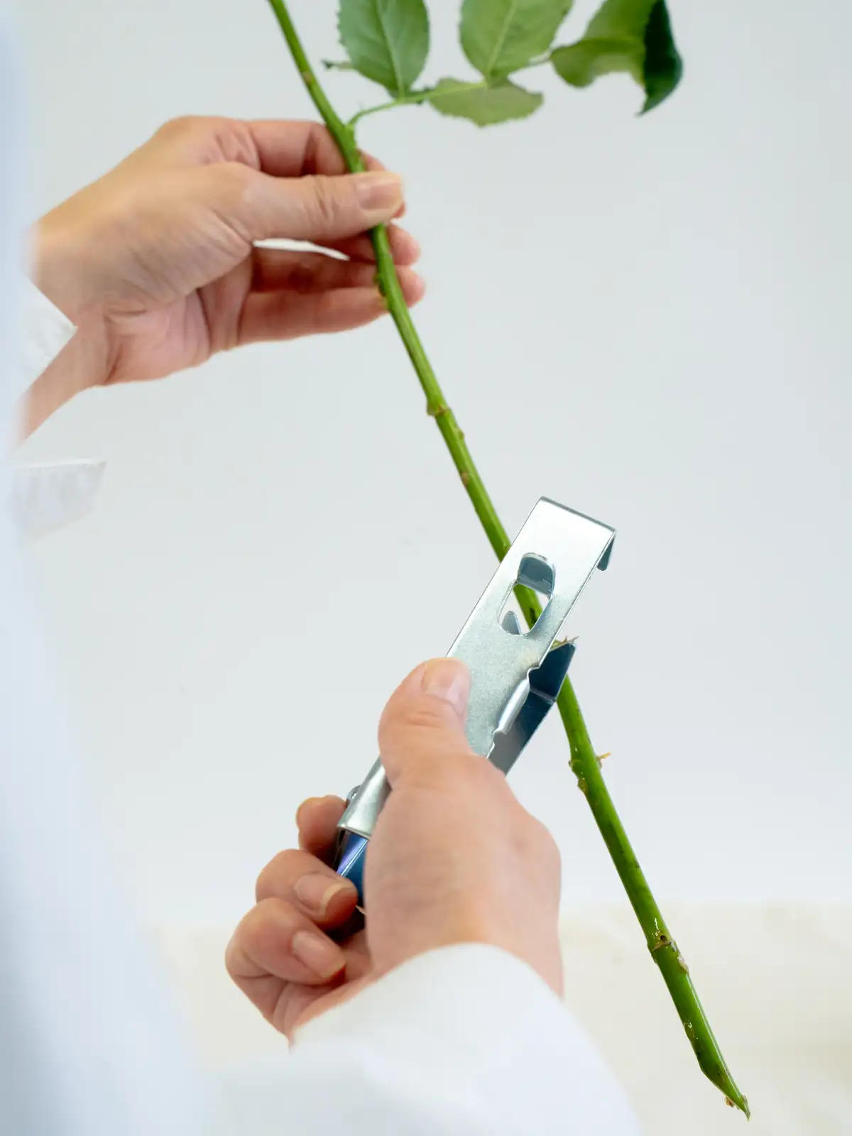 バラの茎に付いたとげや葉を、手早くきれいに取り除ける専用のとげ取り器です。金属製の刃で茎をしっかり挟み、軽く引くだけでとげだけを落とすことができ、作業効率が大幅にアップします。ブーケづくりやアレンジメント制作など、日々の作業をサポートする頼れる一本です。 ※事業者の方で大口購入の方はお問い合わせよりご相談ください。