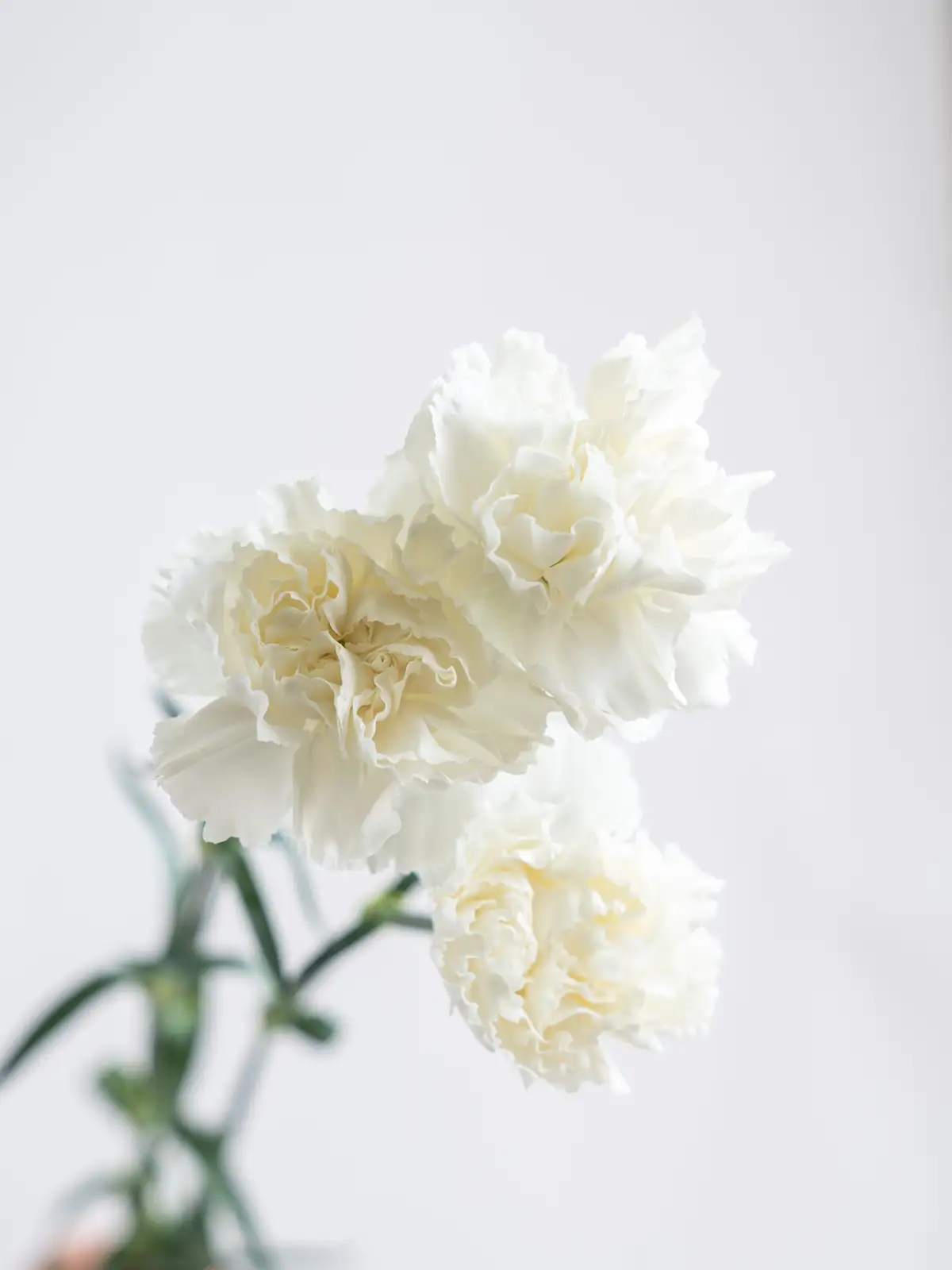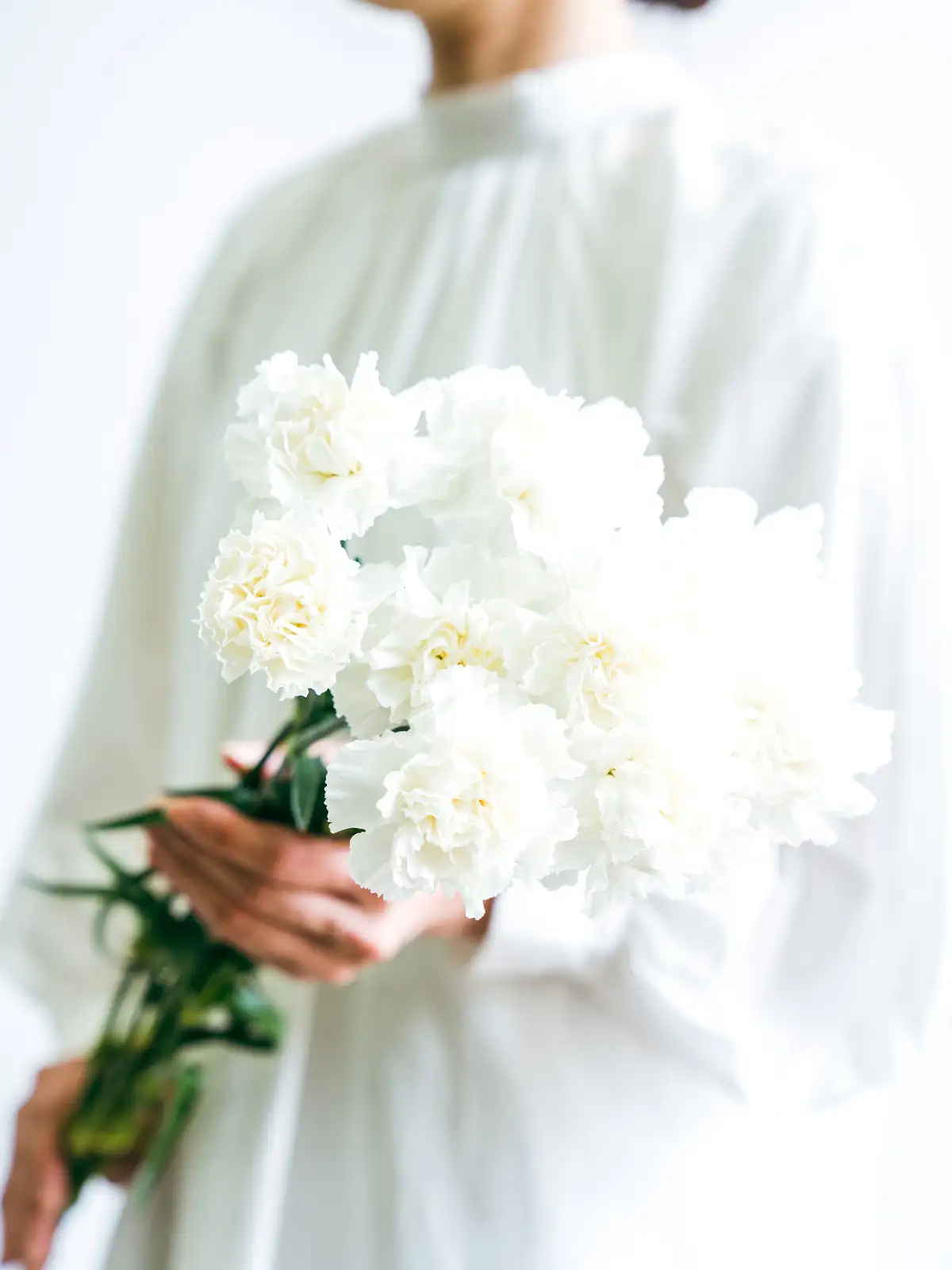清楚で凛とした印象の白系カーネーションは、フォーマルな装花や落ち着いたトーンのギフトにおすすめです。ボリュームは入荷時期・産地によりイメージと異なる場合がございます。予めお含みおきください。