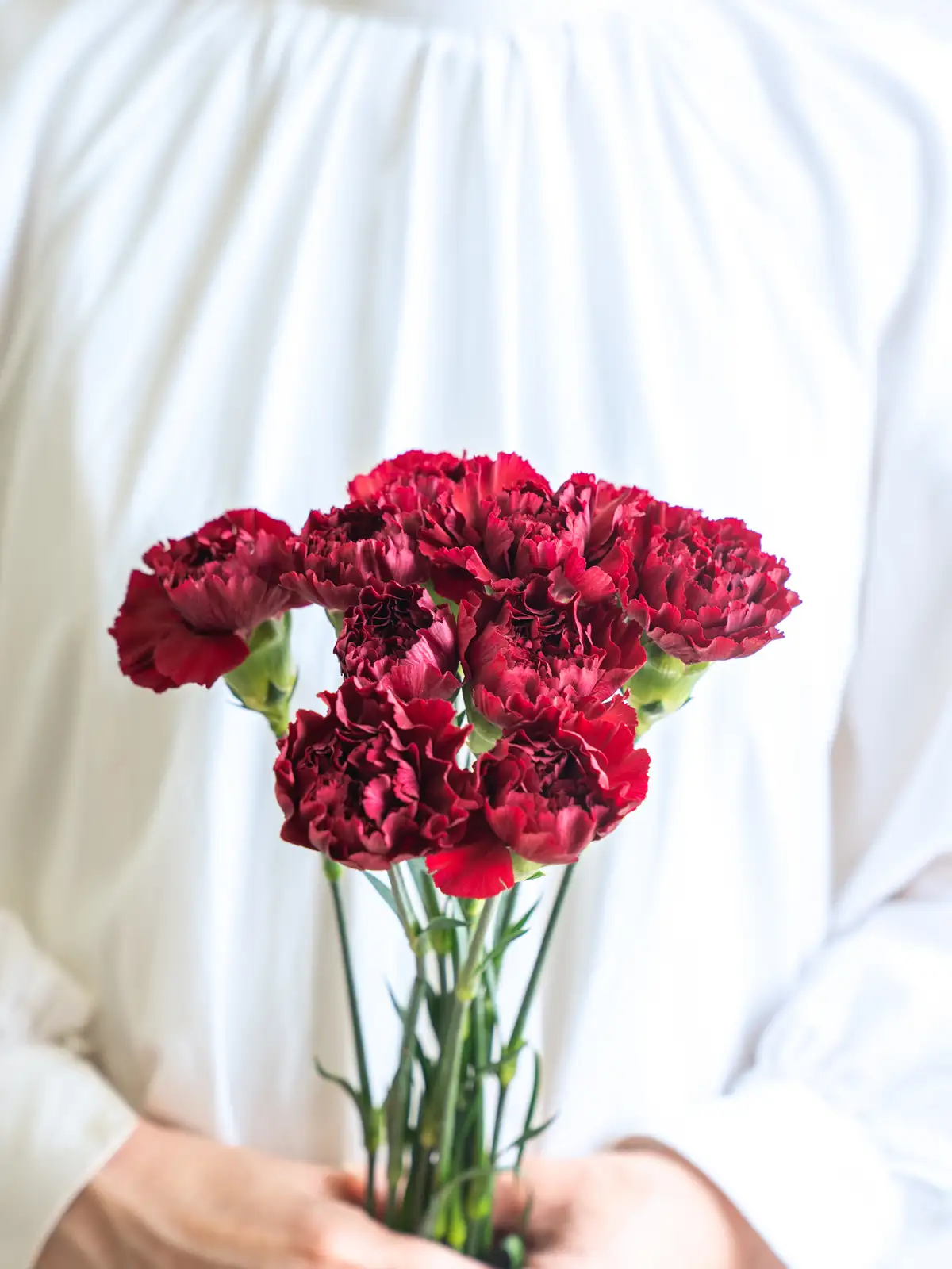 深みのある赤黒系カーネーションは、シックで大人っぽい雰囲気を演出したい場面に適しています。ボリュームは入荷時期・産地によりイメージと異なる場合がございます。予めお含みおきください。