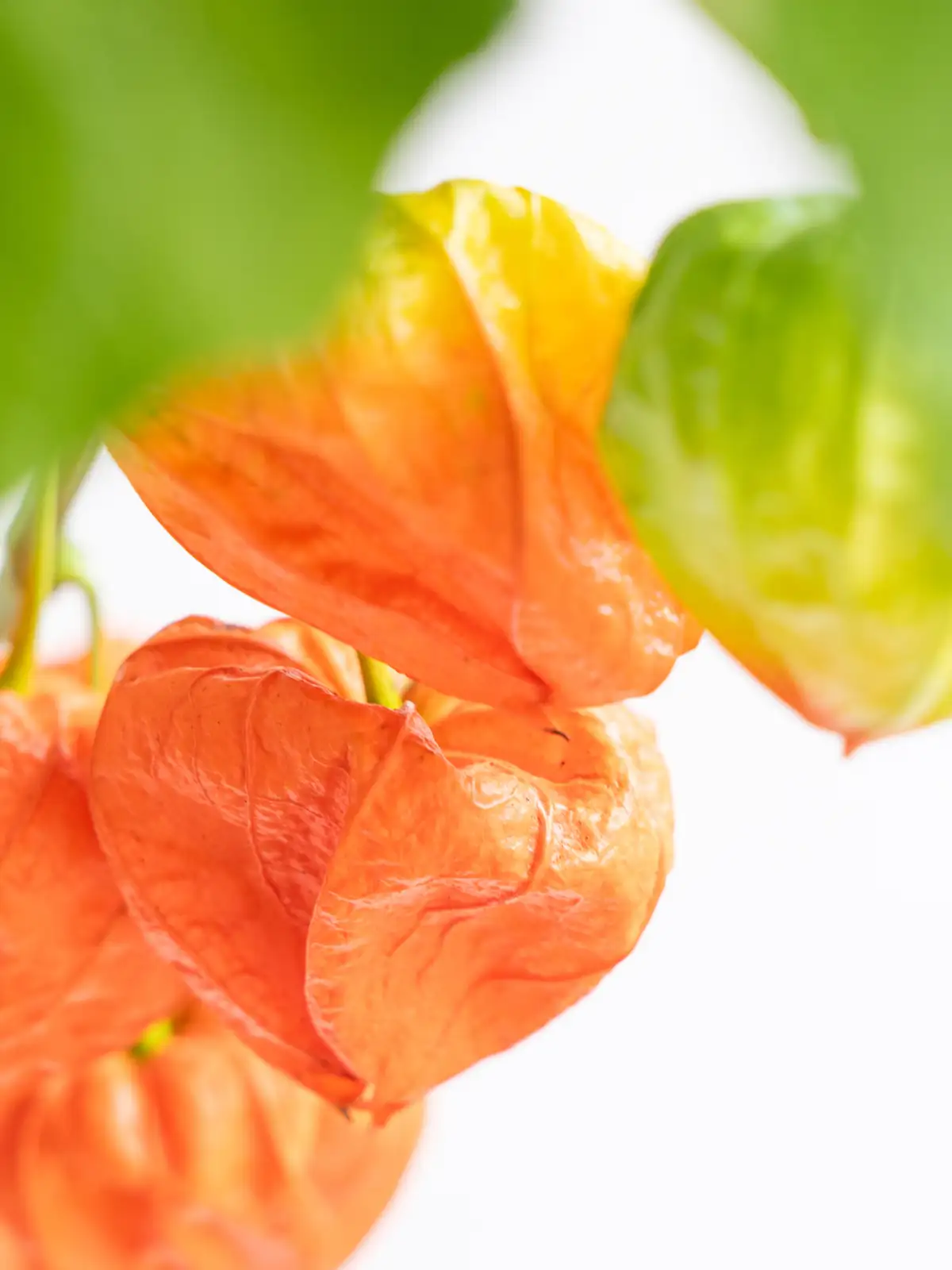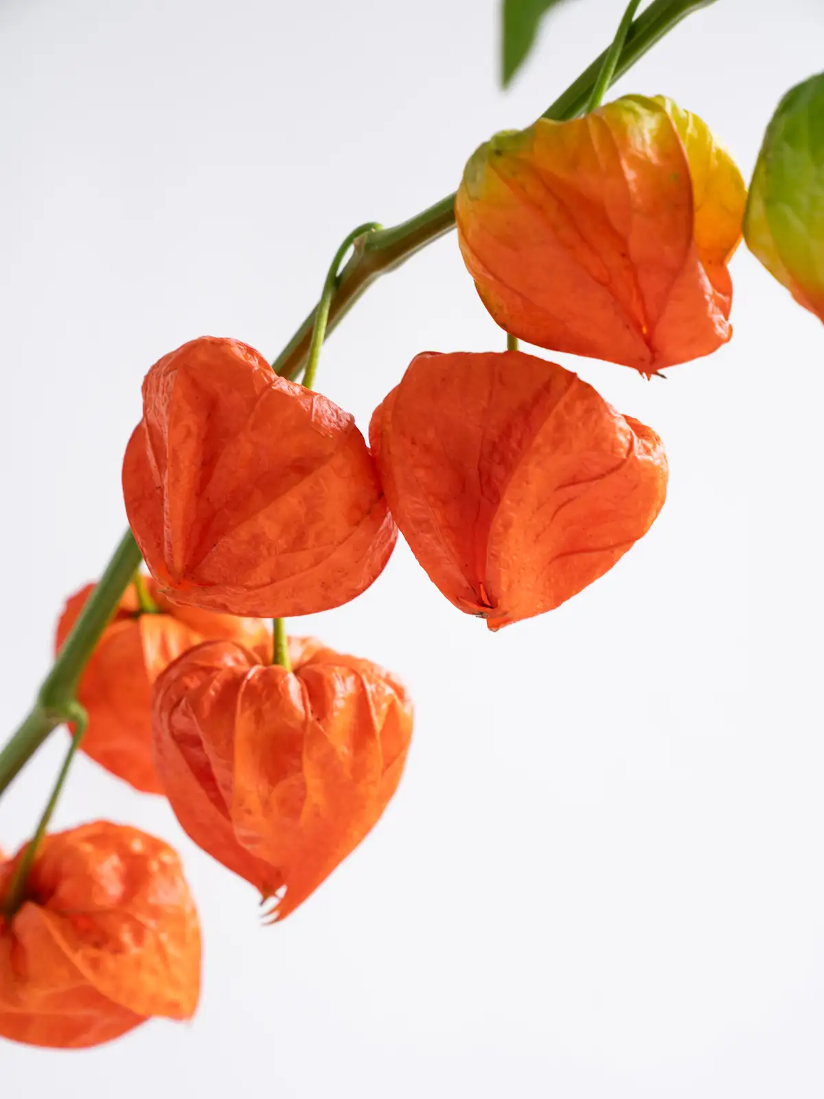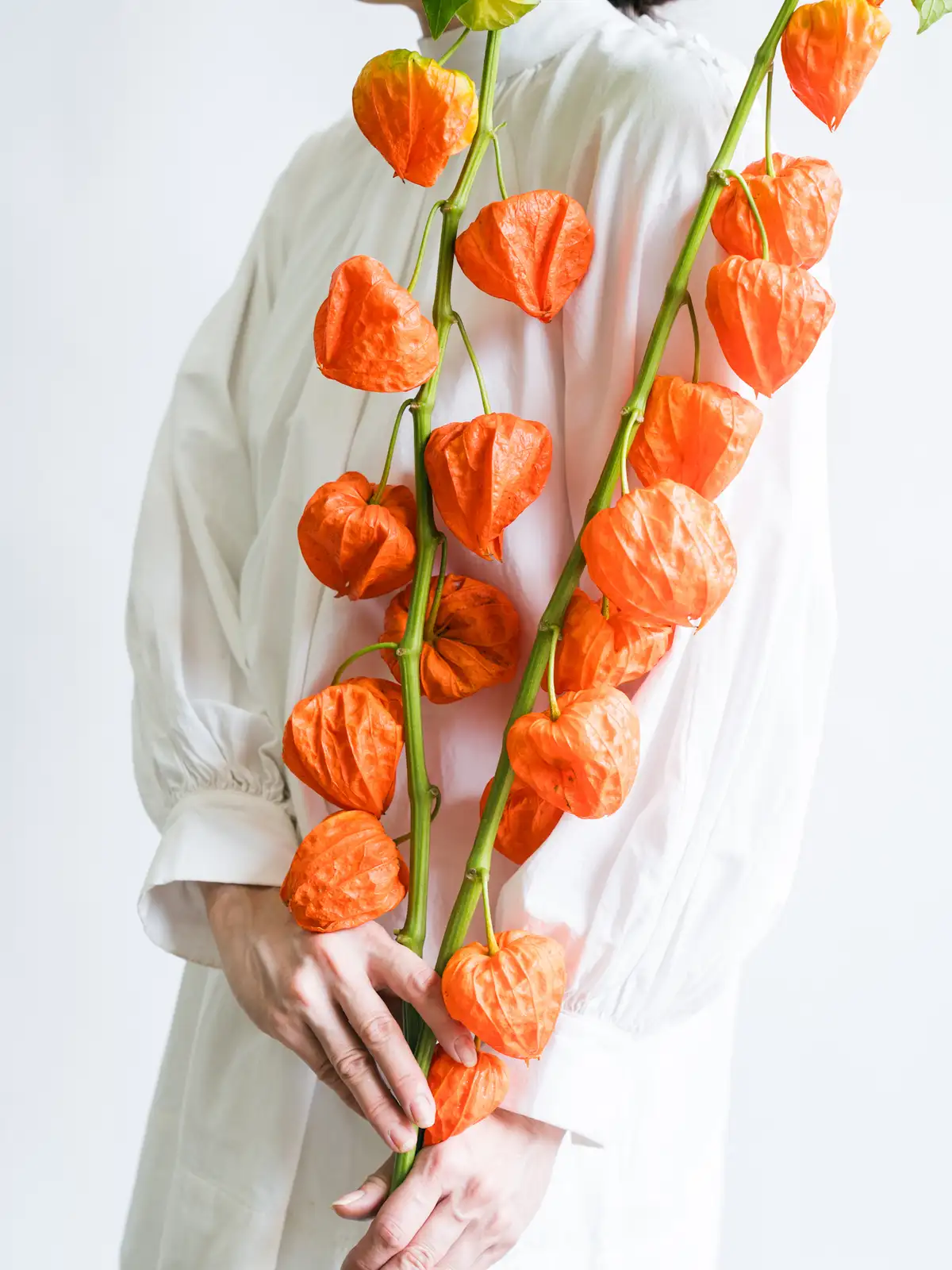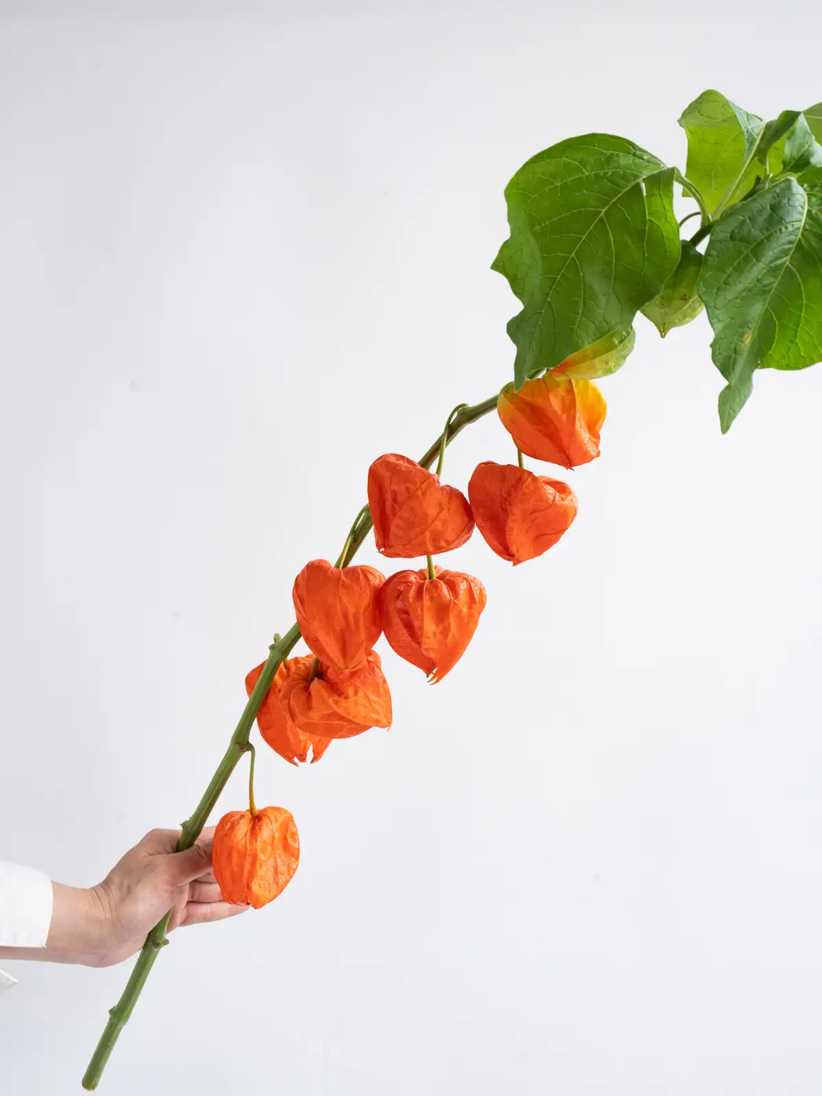 鮮やかな橙色の袋状の実が特徴のホオズキ。夏から秋にかけての装飾にぴったりです。