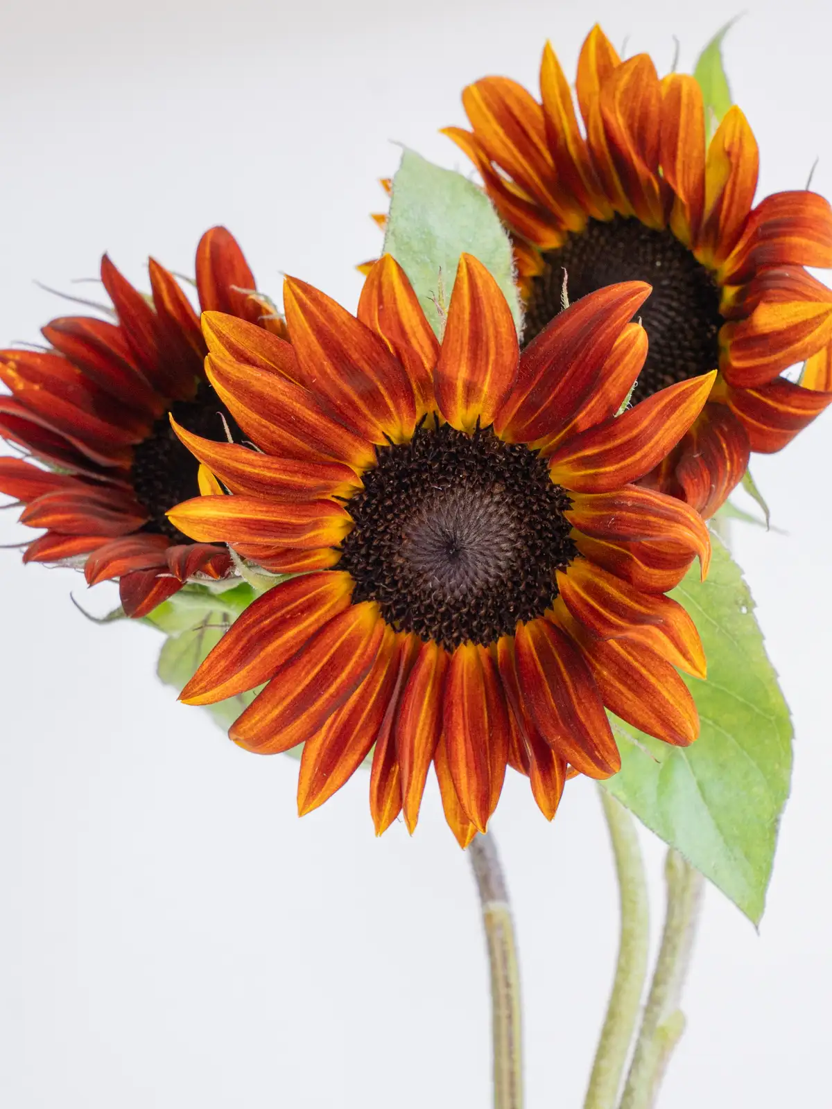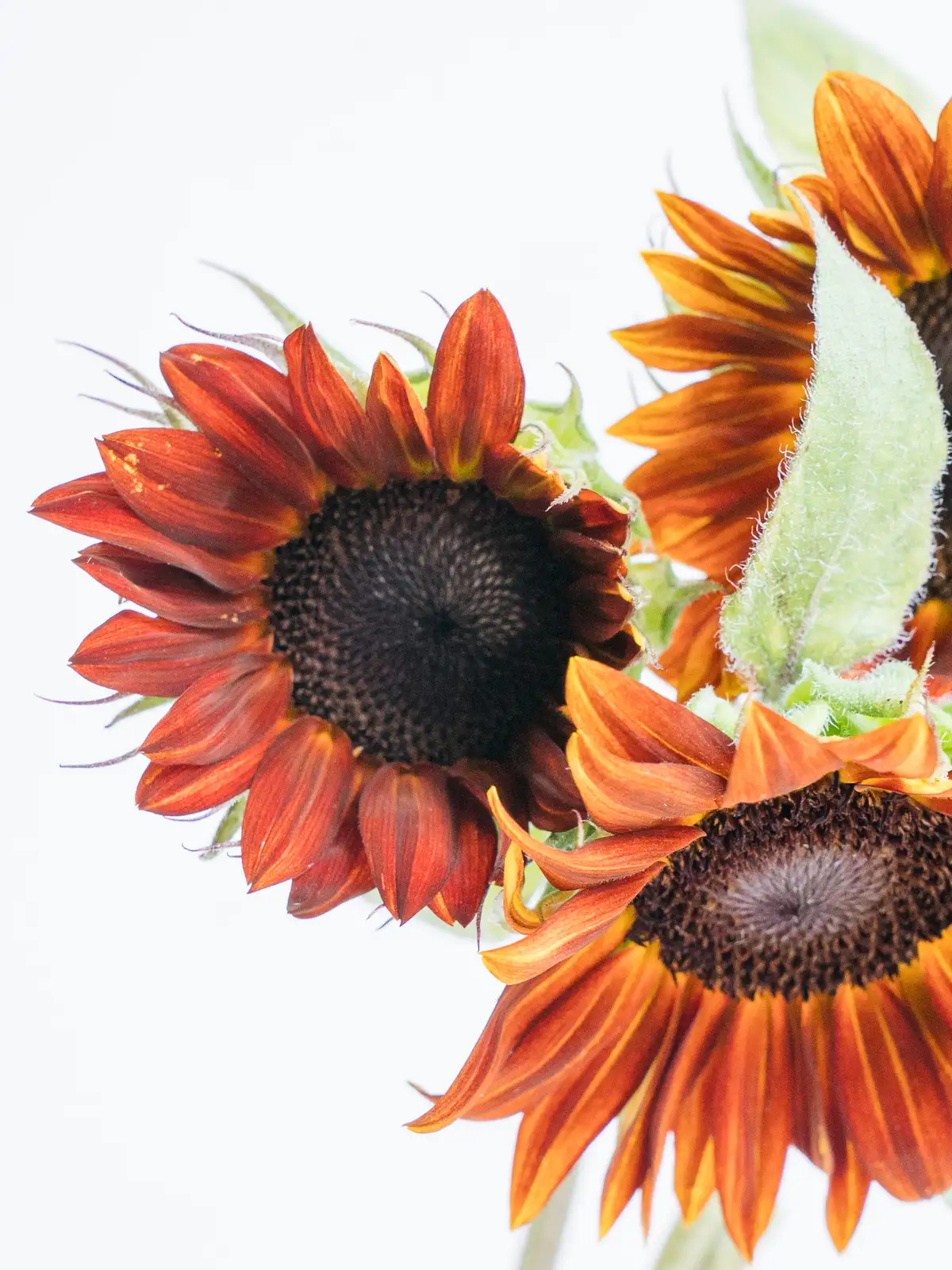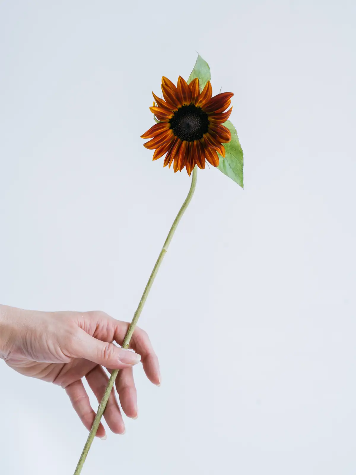 深い赤茶色の花弁が印象的なひまわり。個性的な演出におすすめの品種です。