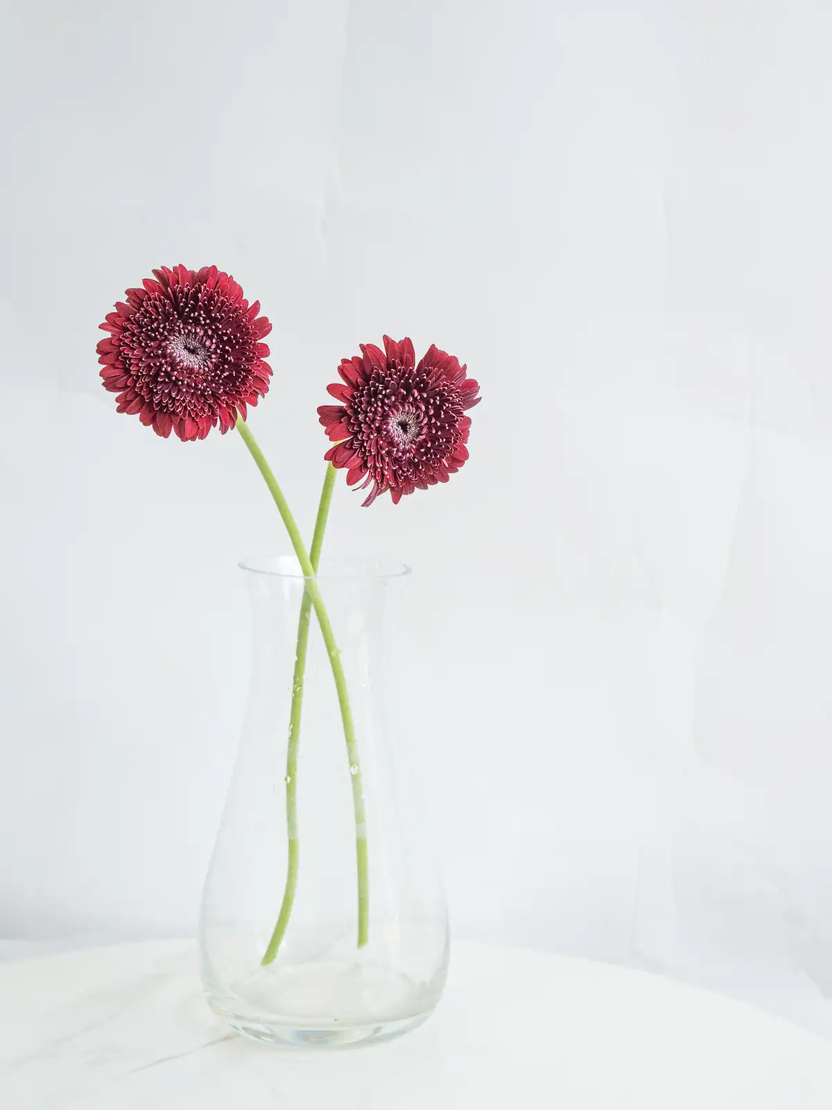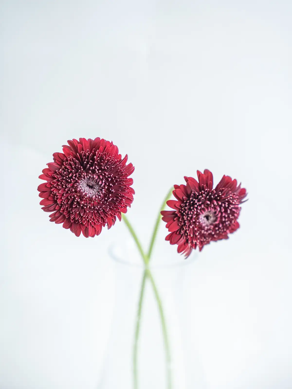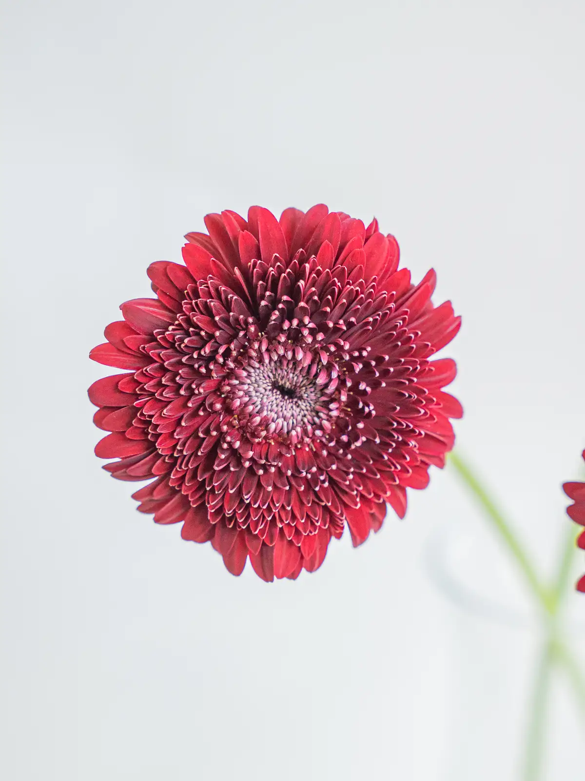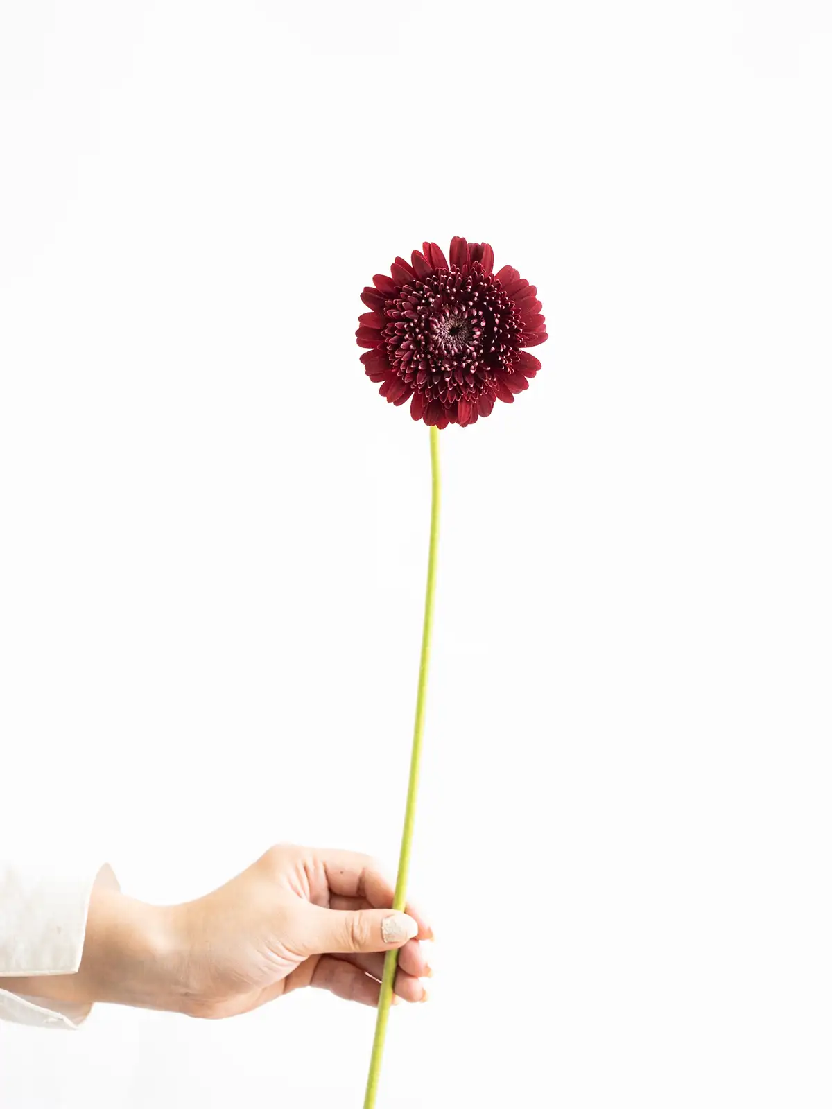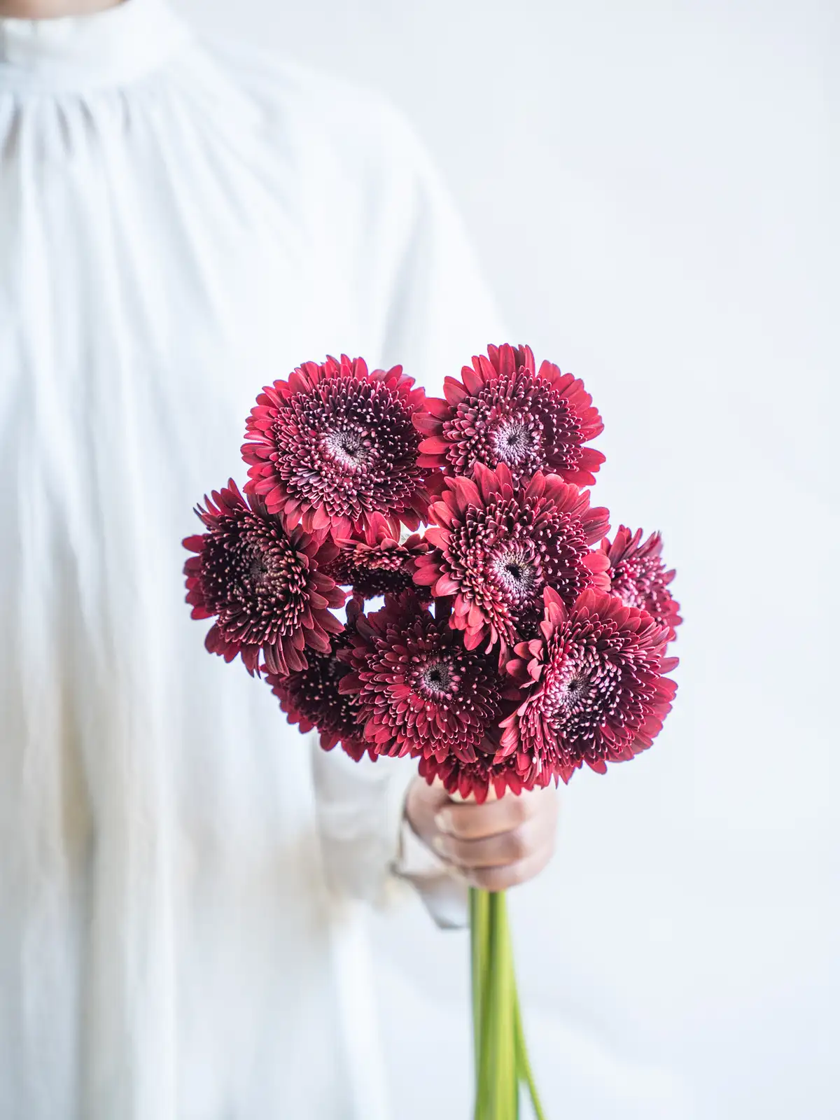 深紅の花弁にダークアイが際立つシックな印象。ギフトやフォトジェニックなアレンジの主役に。
