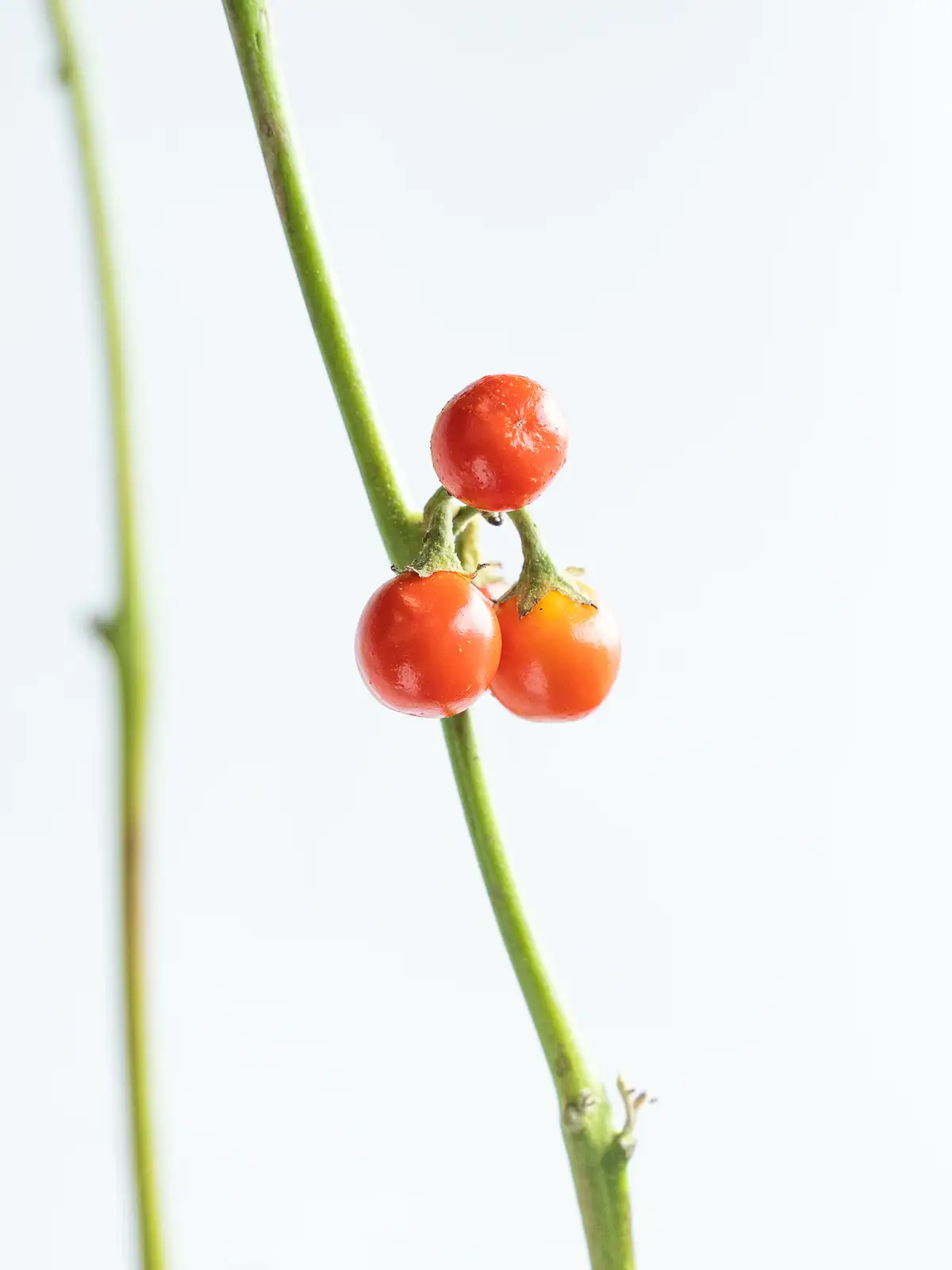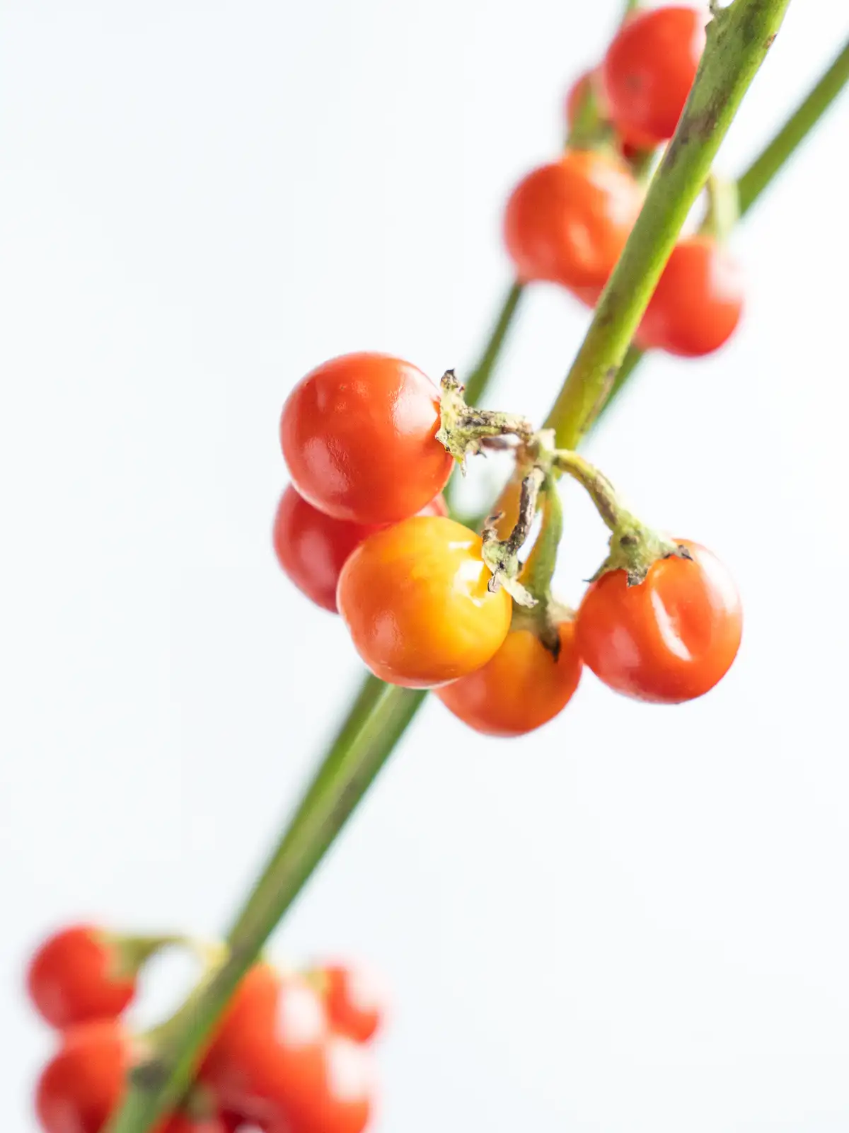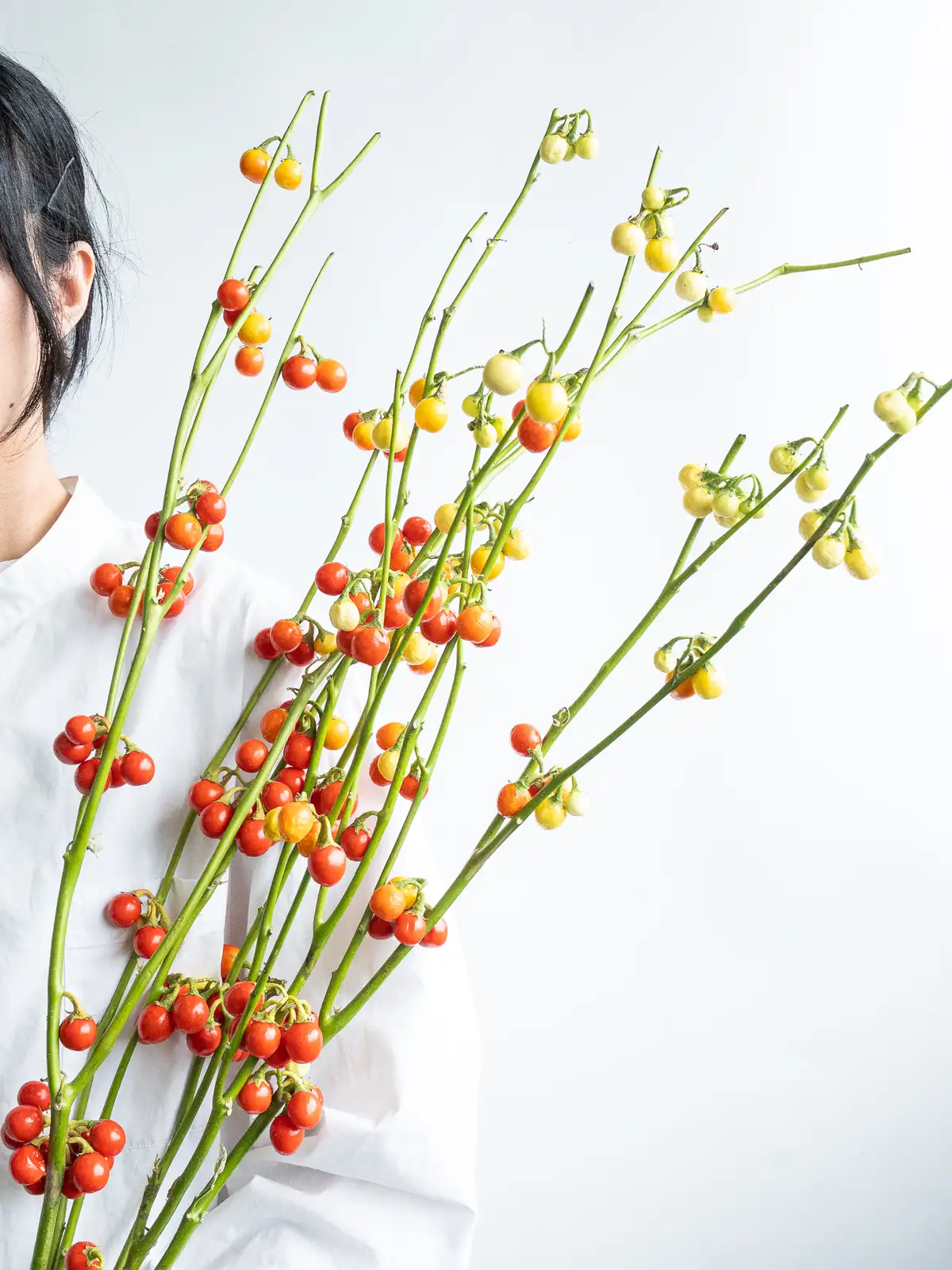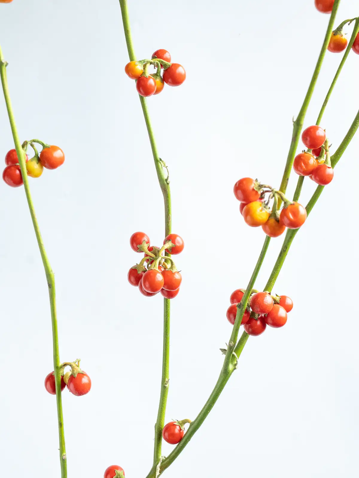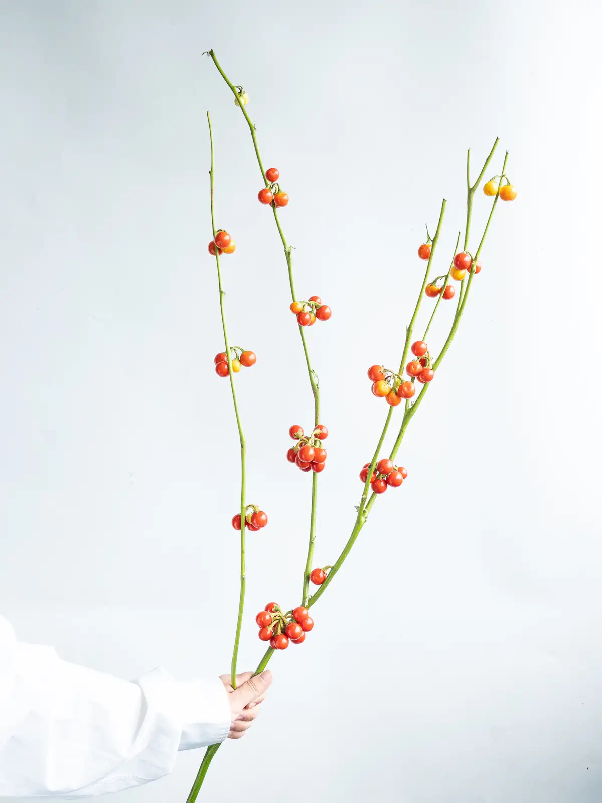オレンジ色の実が愛らしい花ナス「スパークラブ」。アレンジやリースの素材に使うと、季節感のある彩りを添えます。