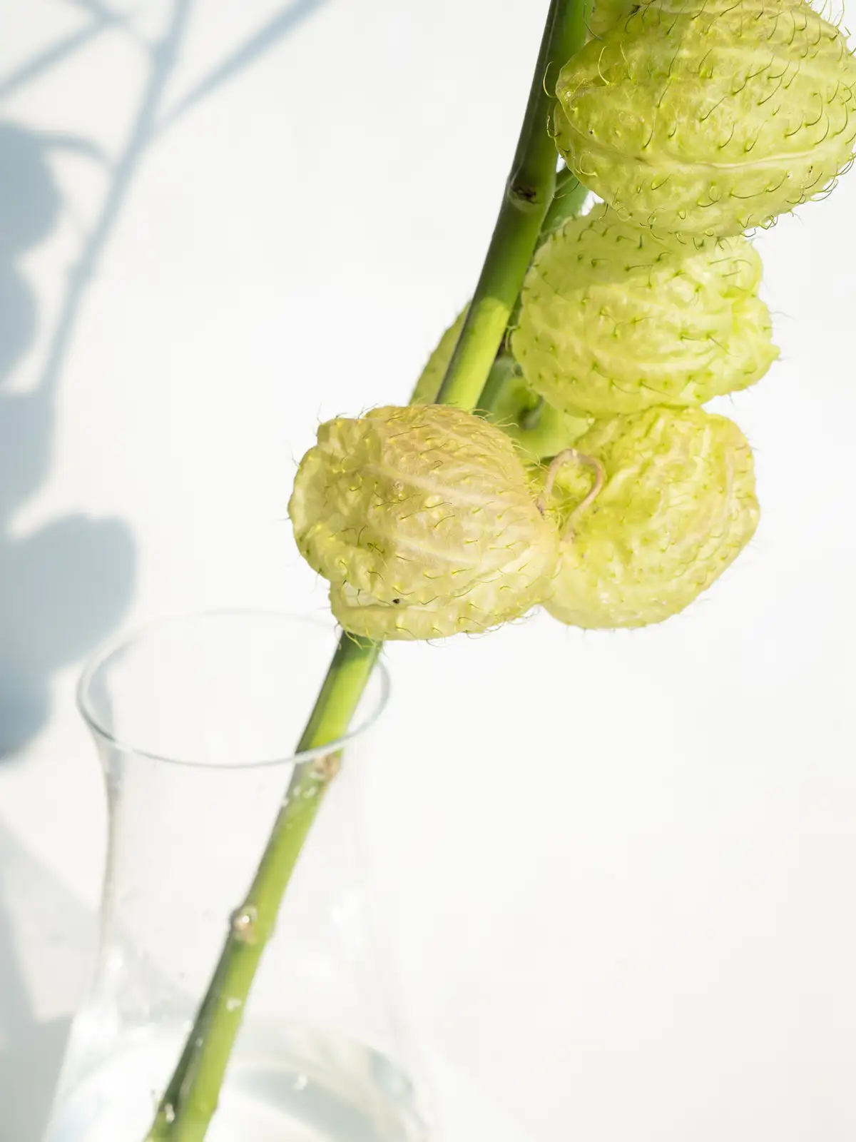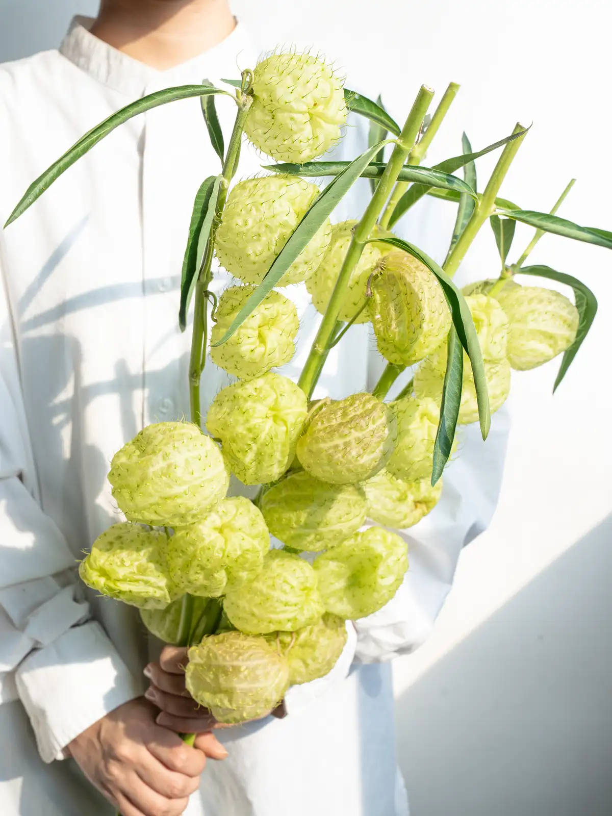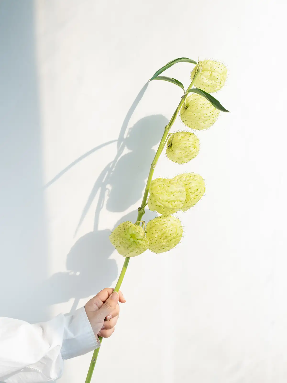 黄緑色~淡緑色の風船形の実(袋果)。4〜7cmほどの丸く膨らんだ実が特徴で、トゲ状の突起は柔らかく痛くありません。ドライにもなりやすく、秋の枝ものアレンジに個性を添えるアイテムです。