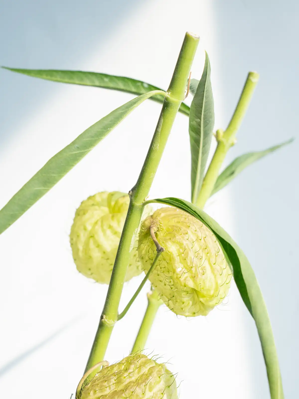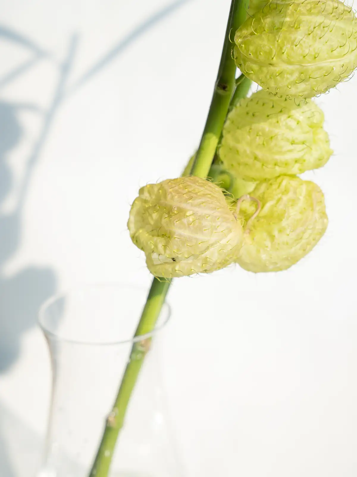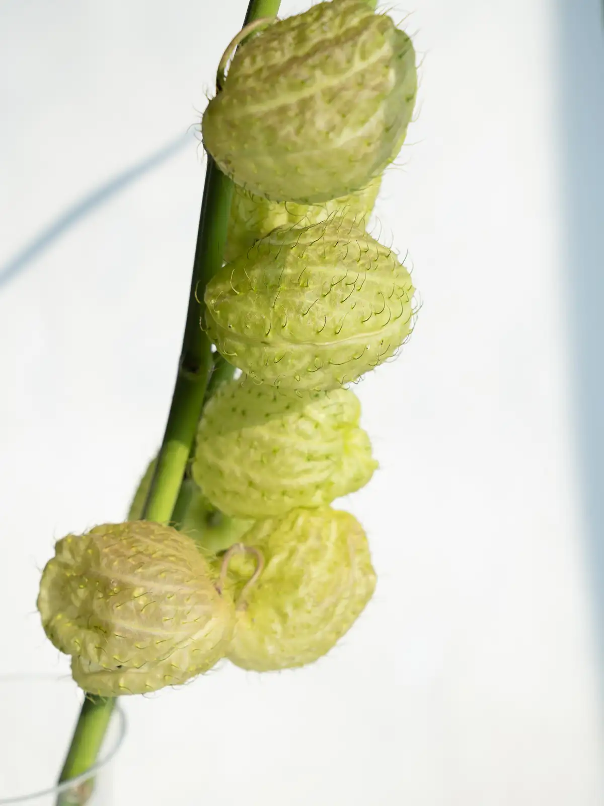 黄緑色~淡緑色の風船形の実(袋果)。4〜7cmほどの丸く膨らんだ実が特徴で、トゲ状の突起は柔らかく痛くありません。ドライにもなりやすく、秋の枝ものアレンジに個性を添えるアイテムです。