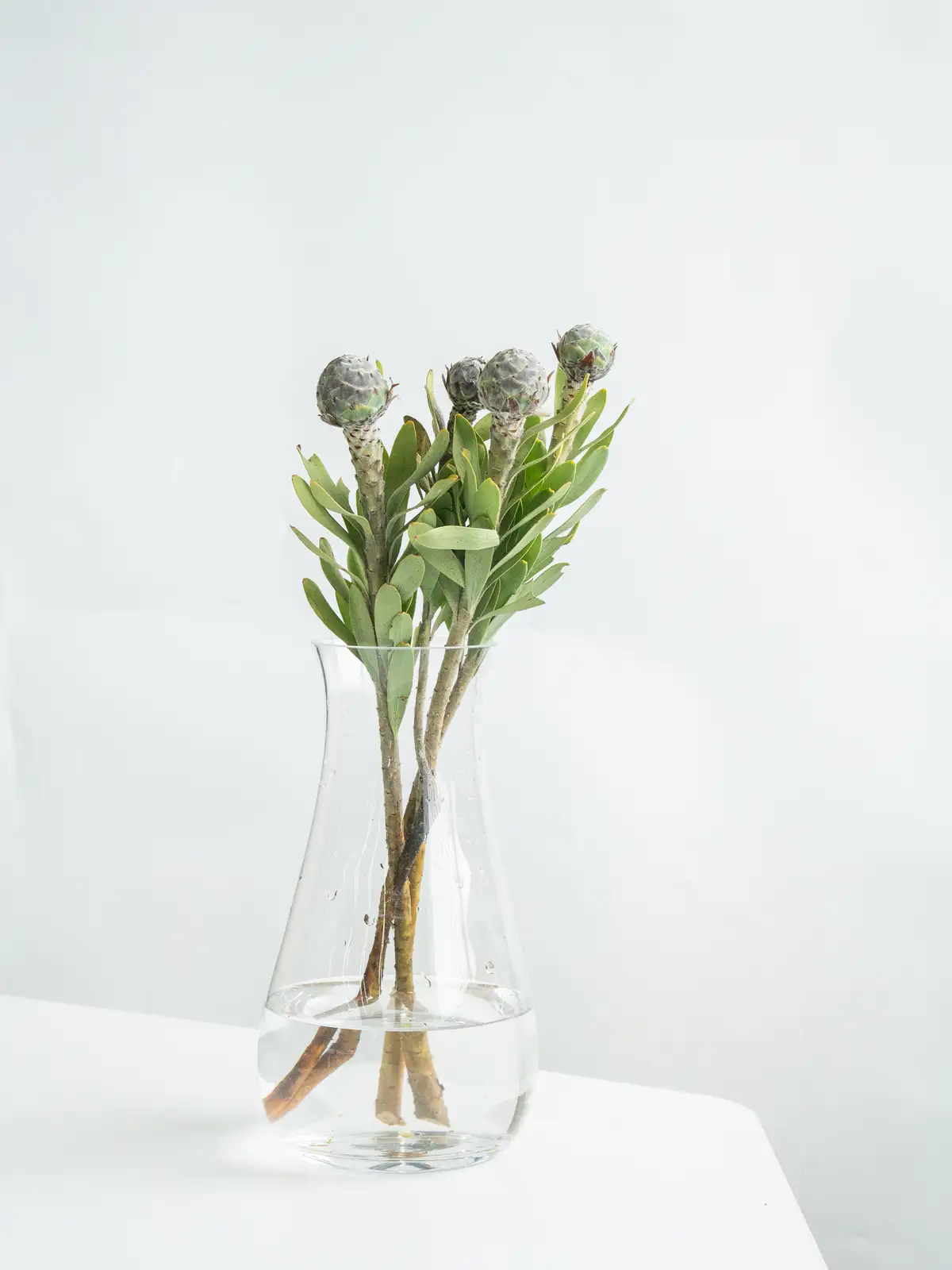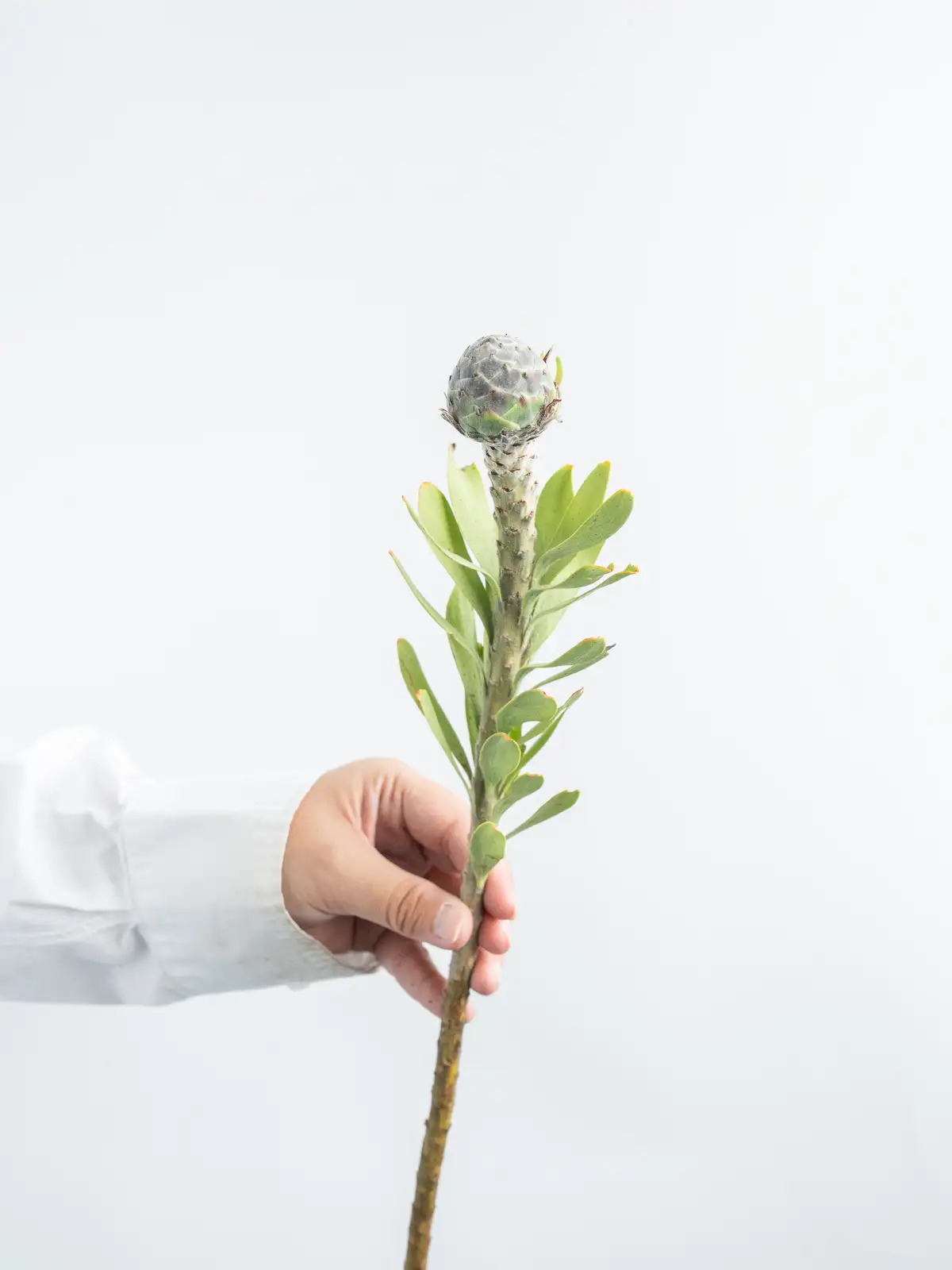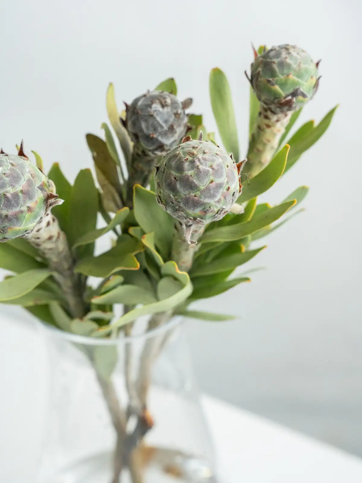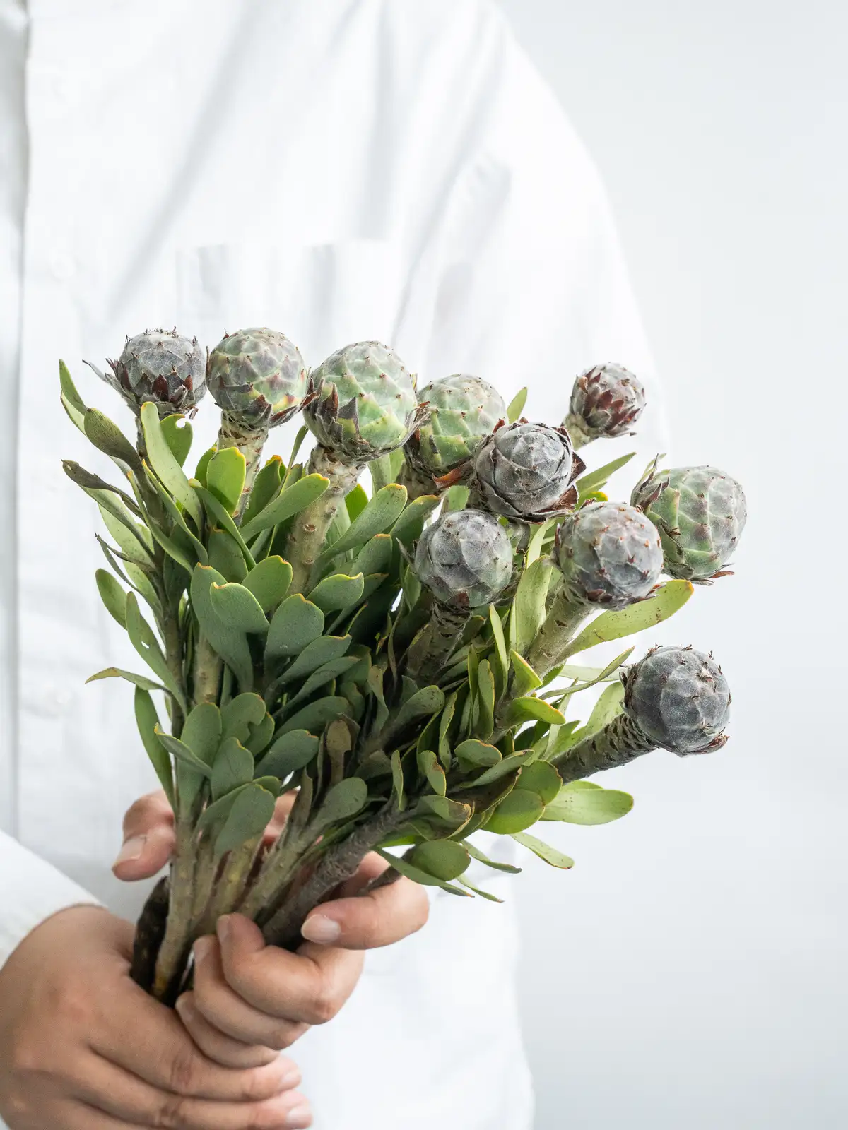 シックな黒みを帯びた花苞が特徴のリューカデンドロ。深みのある色合いがアレンジに重厚感を与えます。