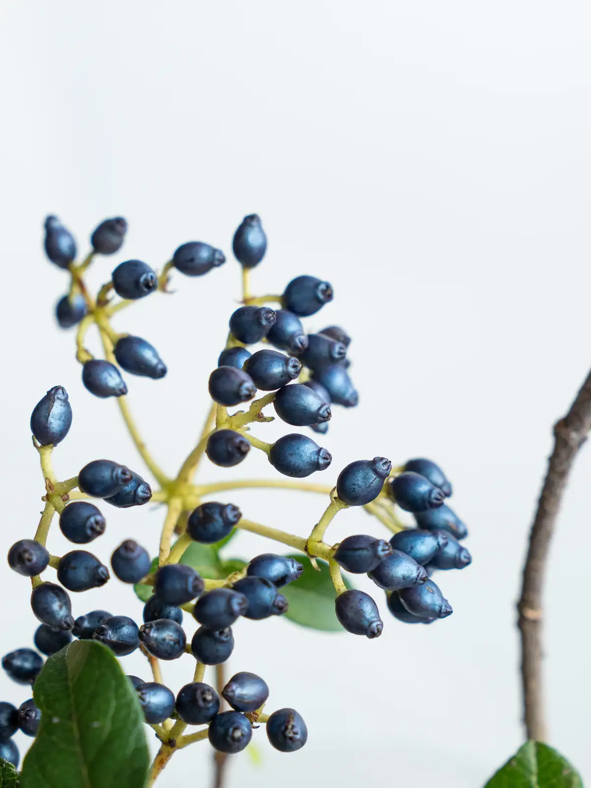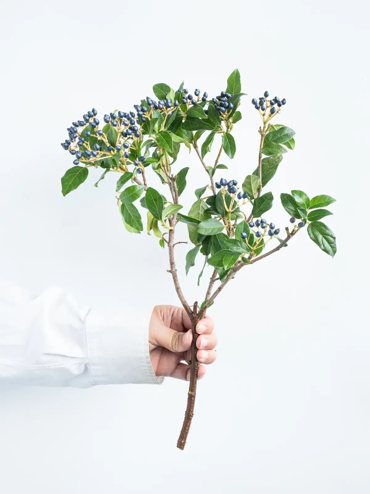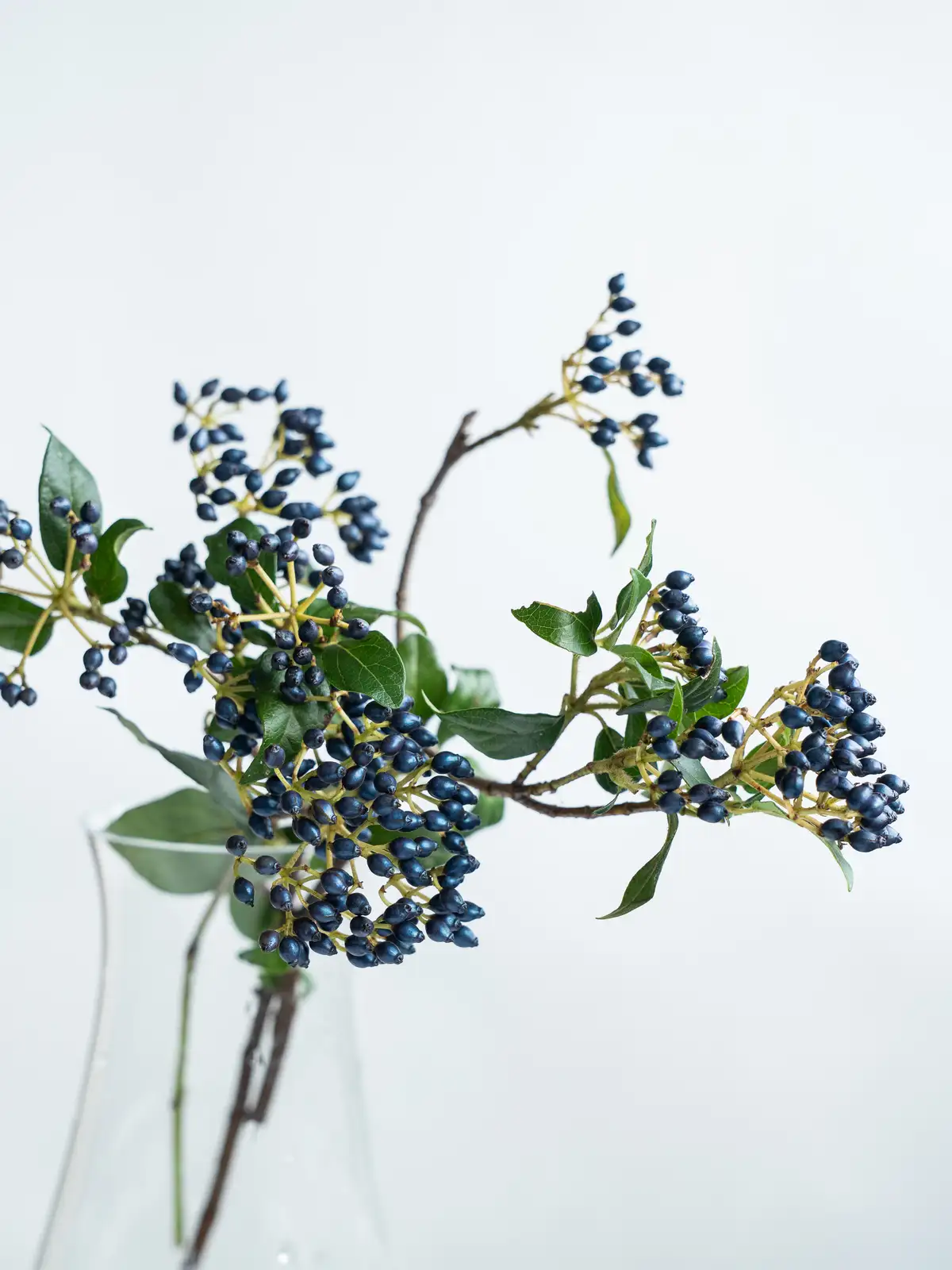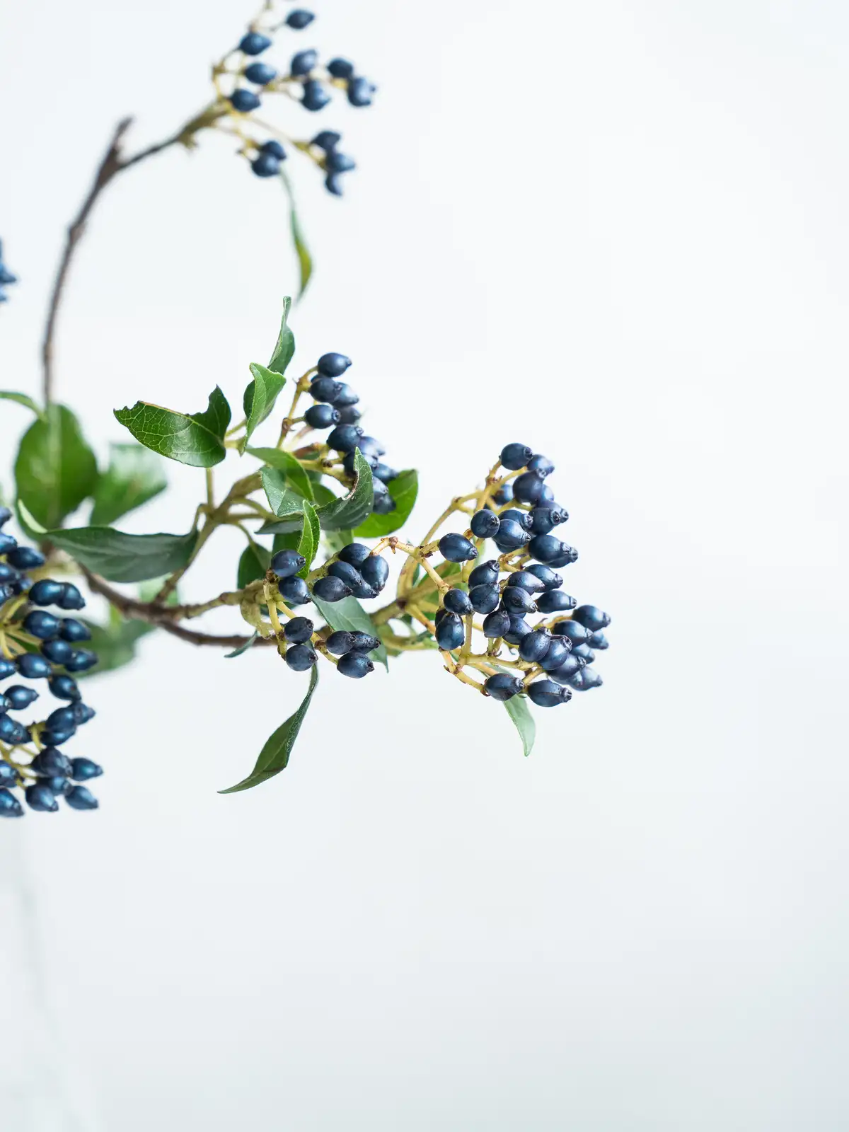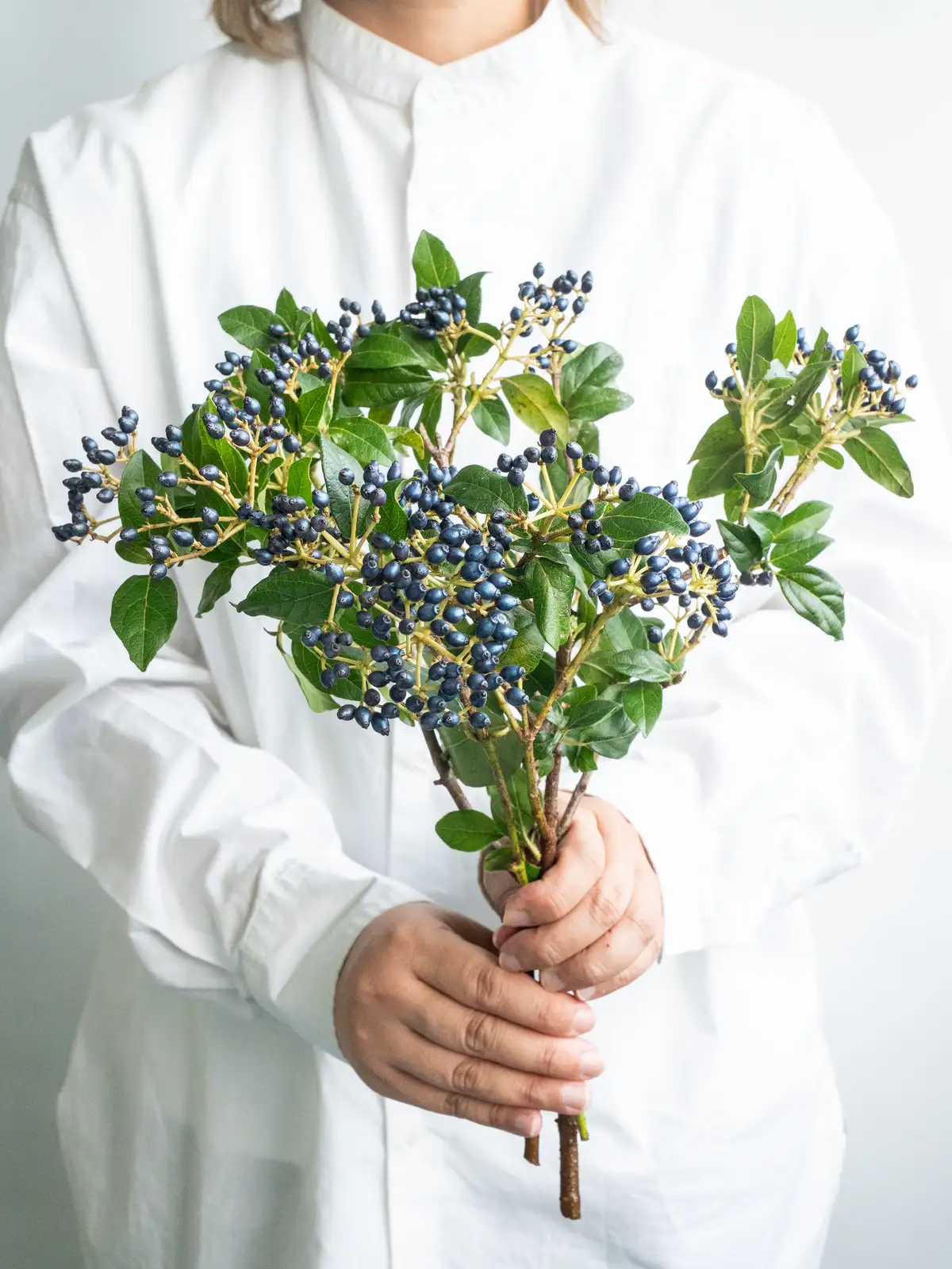 深緑の葉と小さな緑の実が魅力。クラシカルな雰囲気を持ち、アレンジメントに自然なニュアンスを加えます。