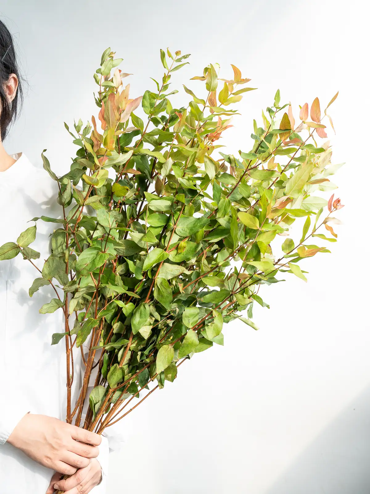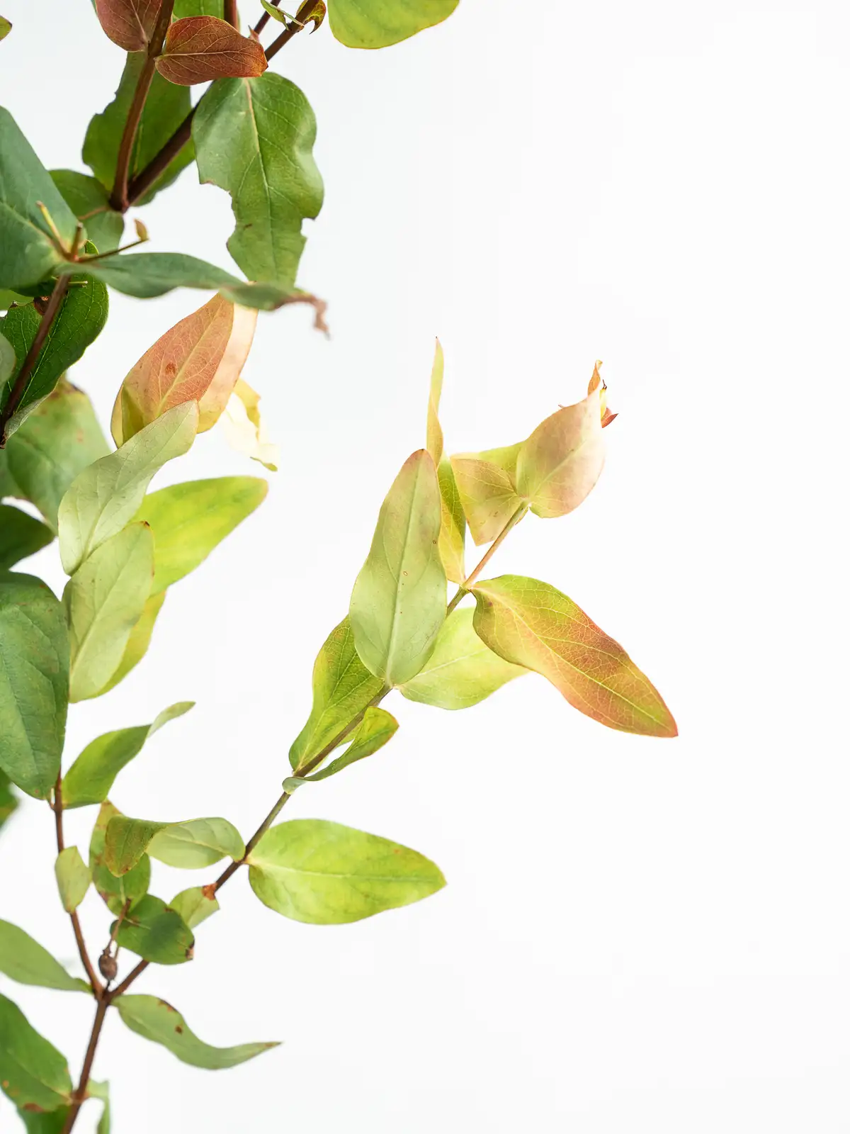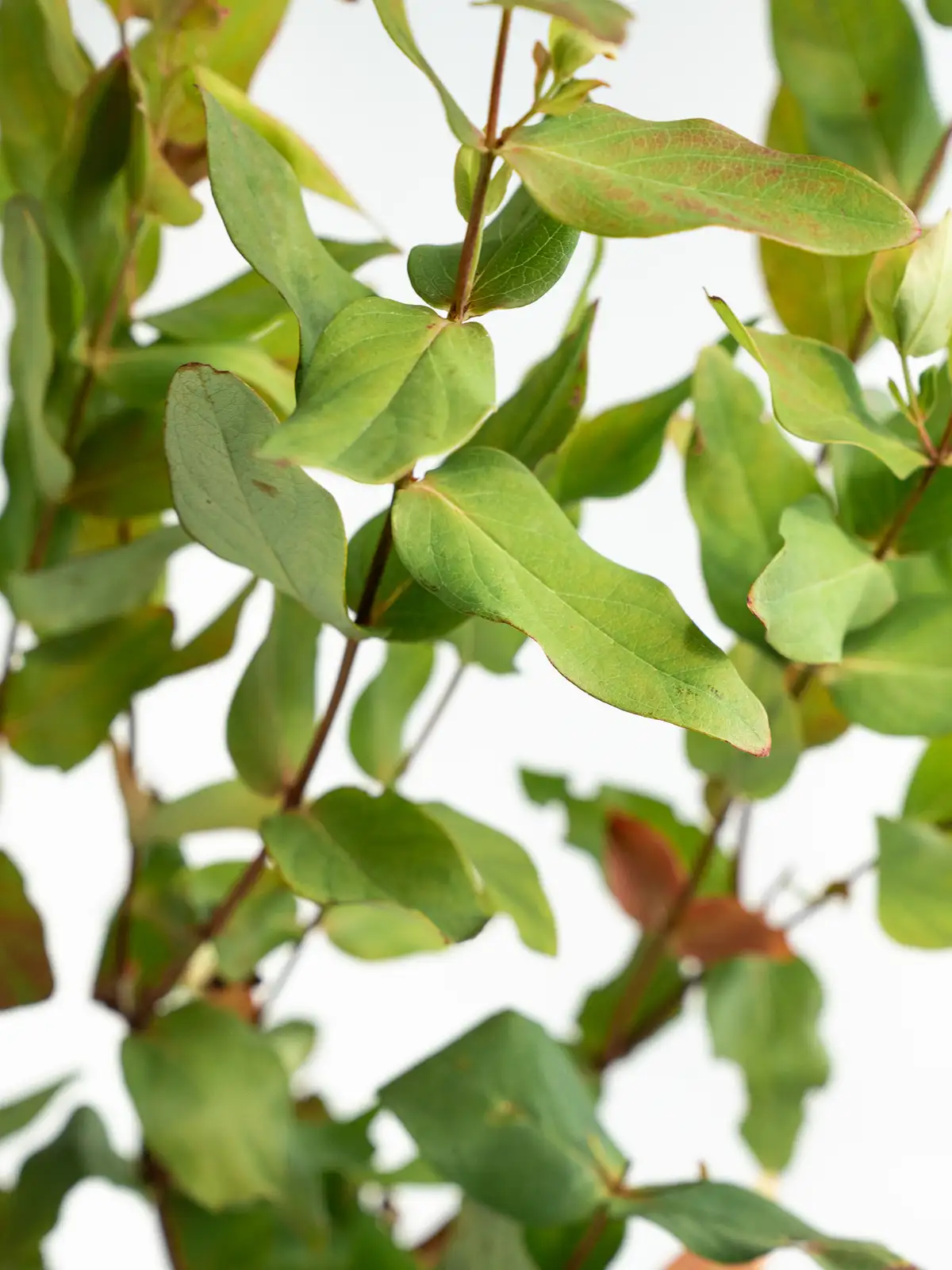 紅葉した葉が赤やオレンジに染まり、実も含めて多彩な色の表情を持つヒペリカム。葉の形は楕円形で光沢があります。自然のもののため、葉に痛みや虫食いが見られる場合がございますが、風合いとしてお楽しみください。