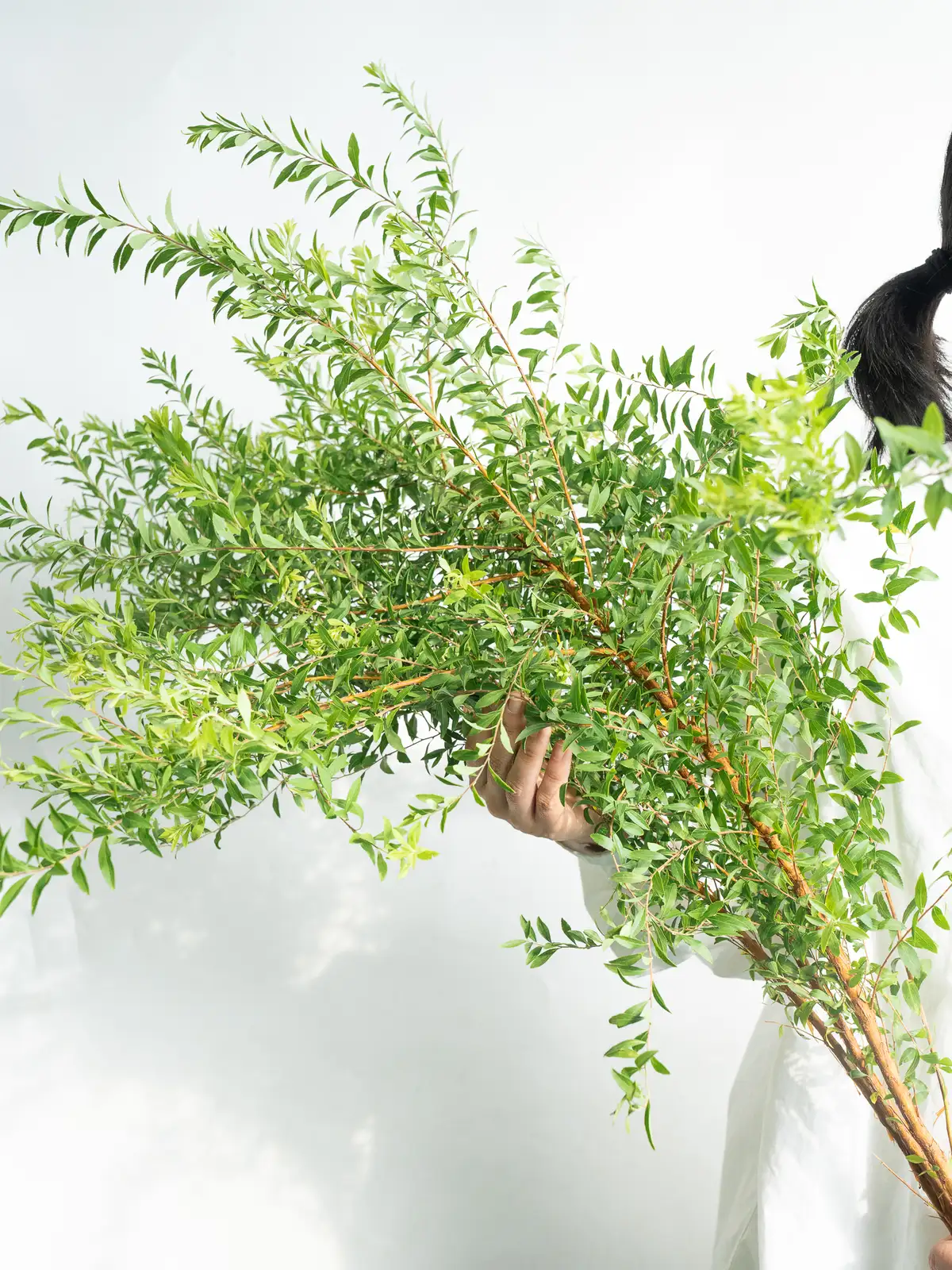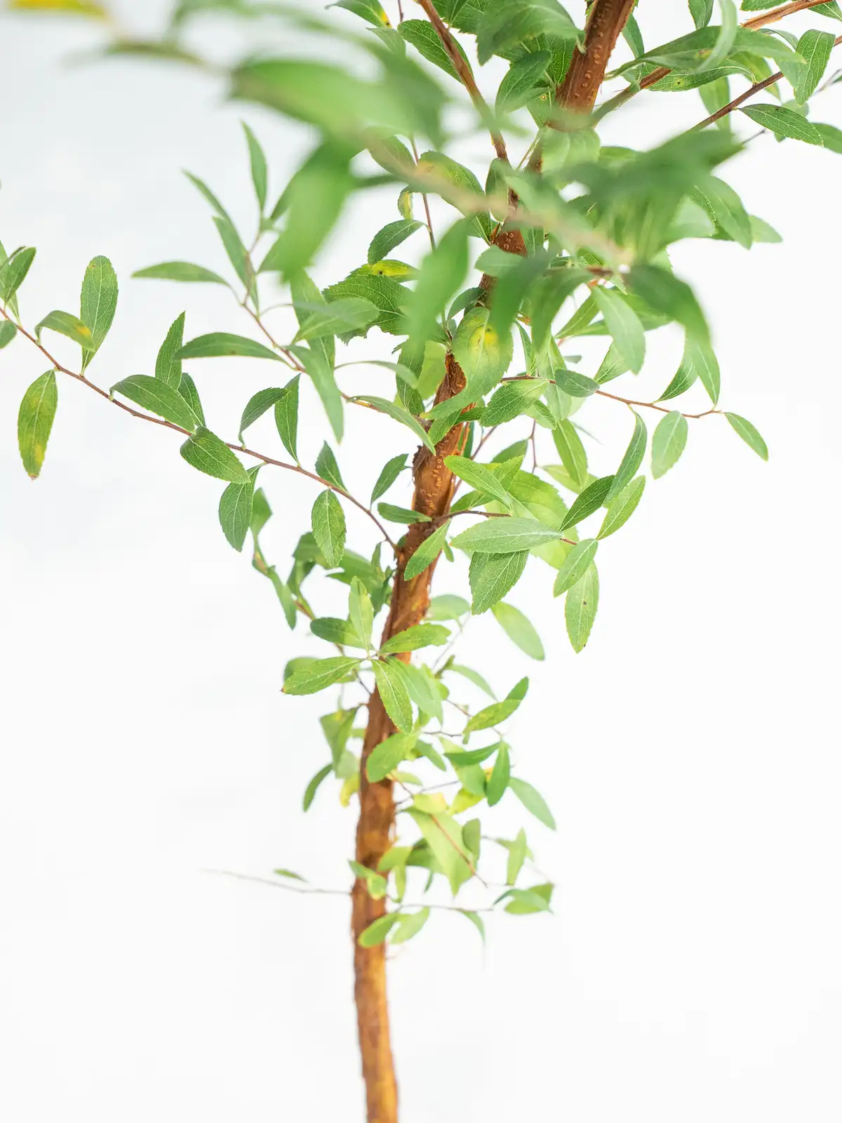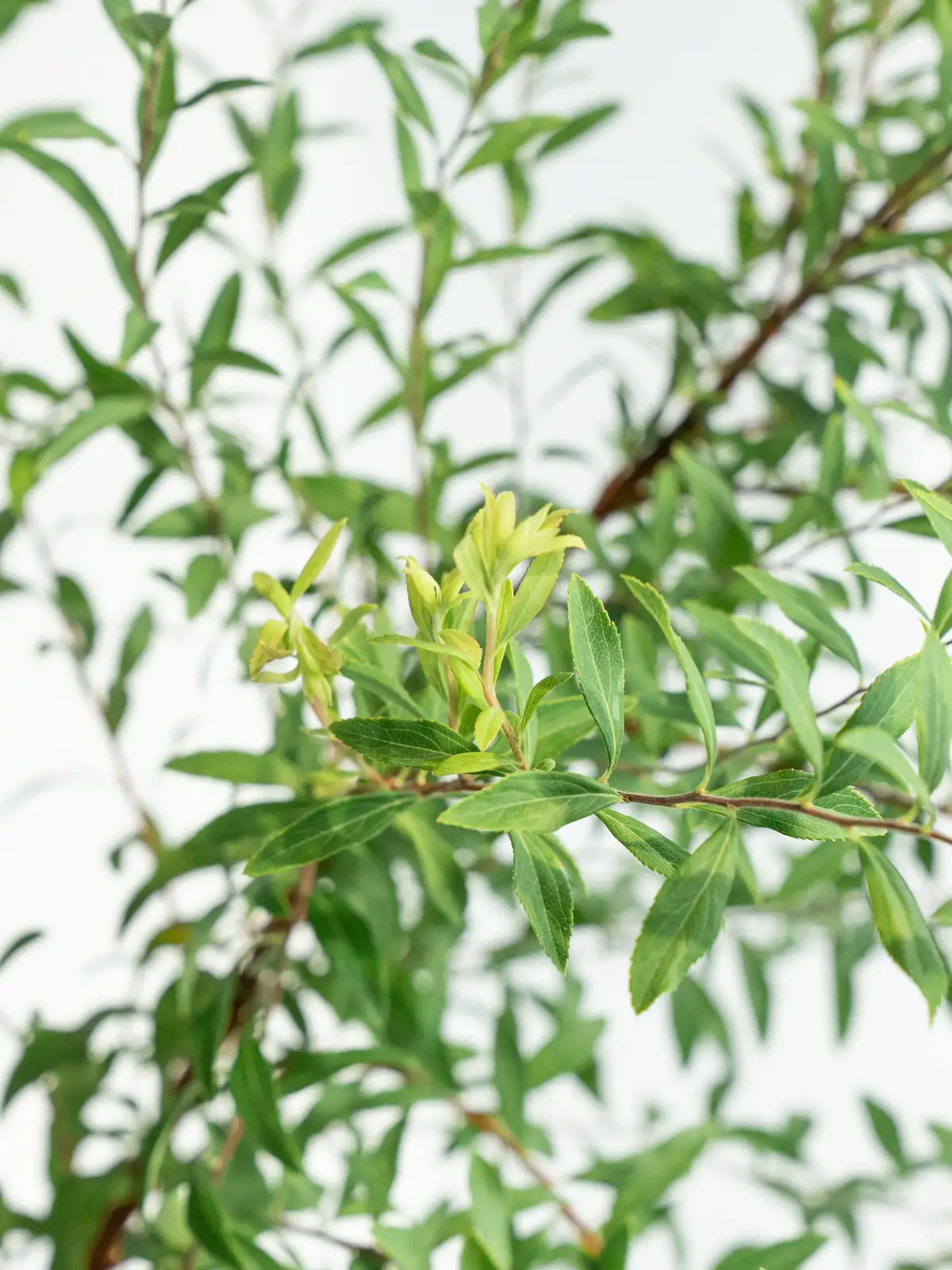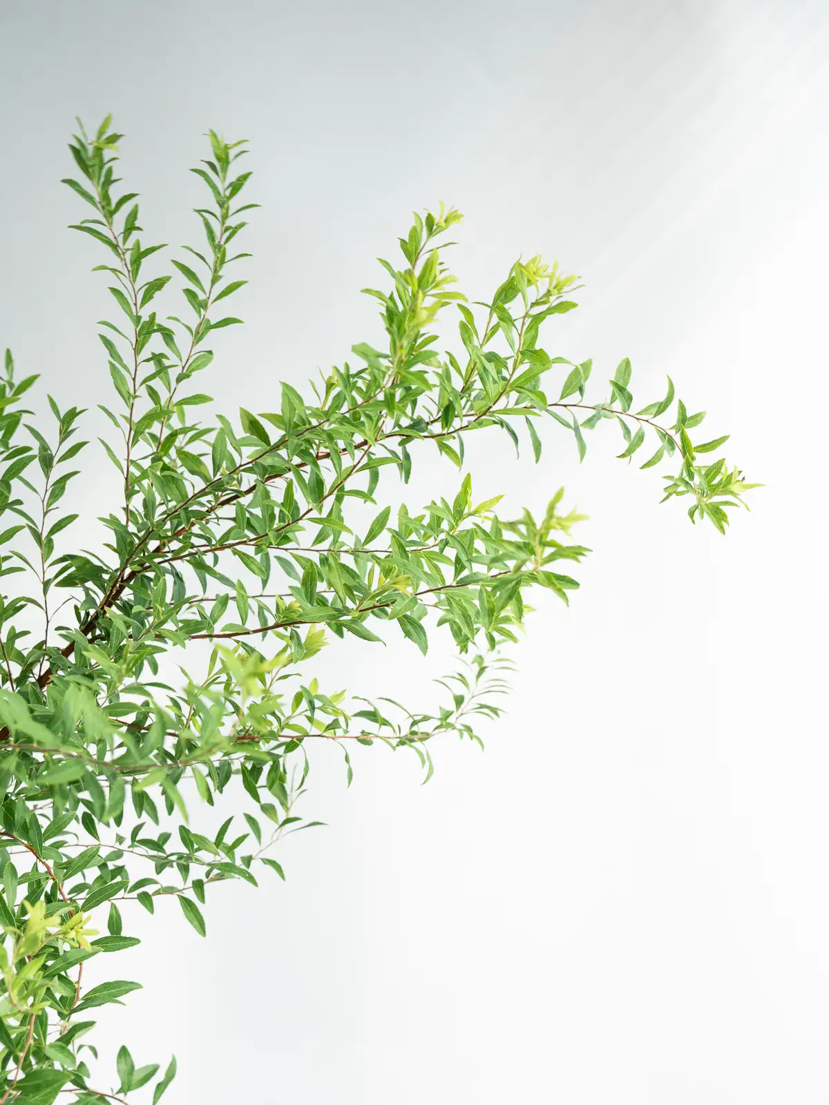 細長い枝にかかる小さな白い花と淡緑の葉。開花期にはふんわりと軽い印象を与える枝物です。