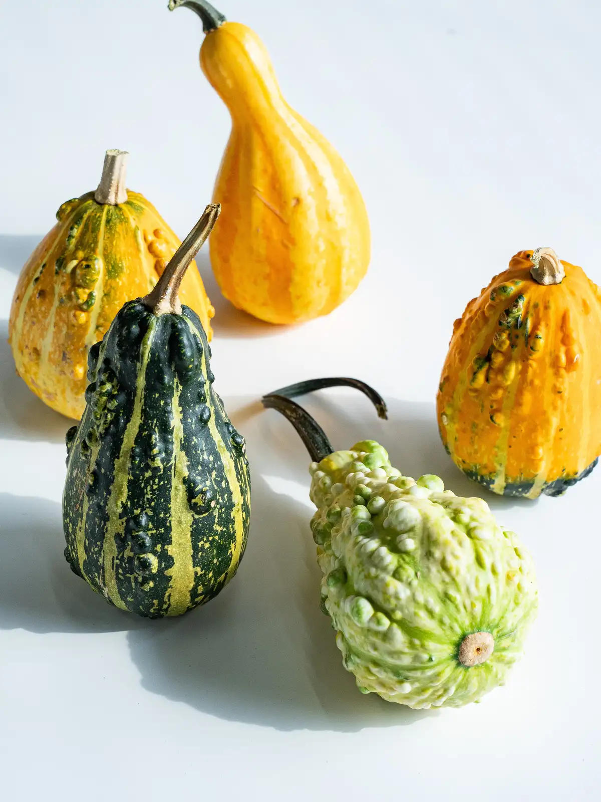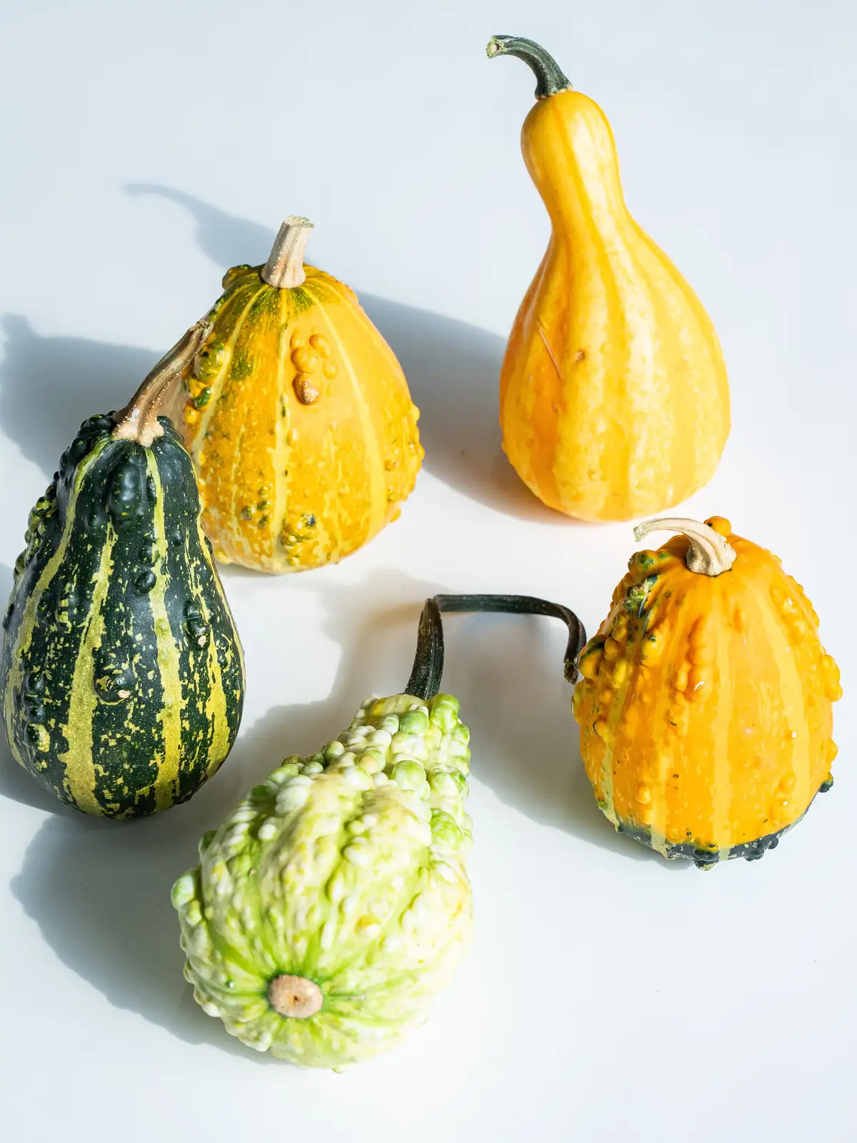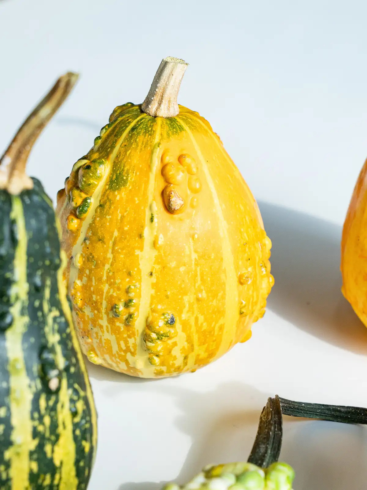 白・オレンジ・緑などの複色模様が入った観賞用のかぼちゃ。形や色に個体差があります。