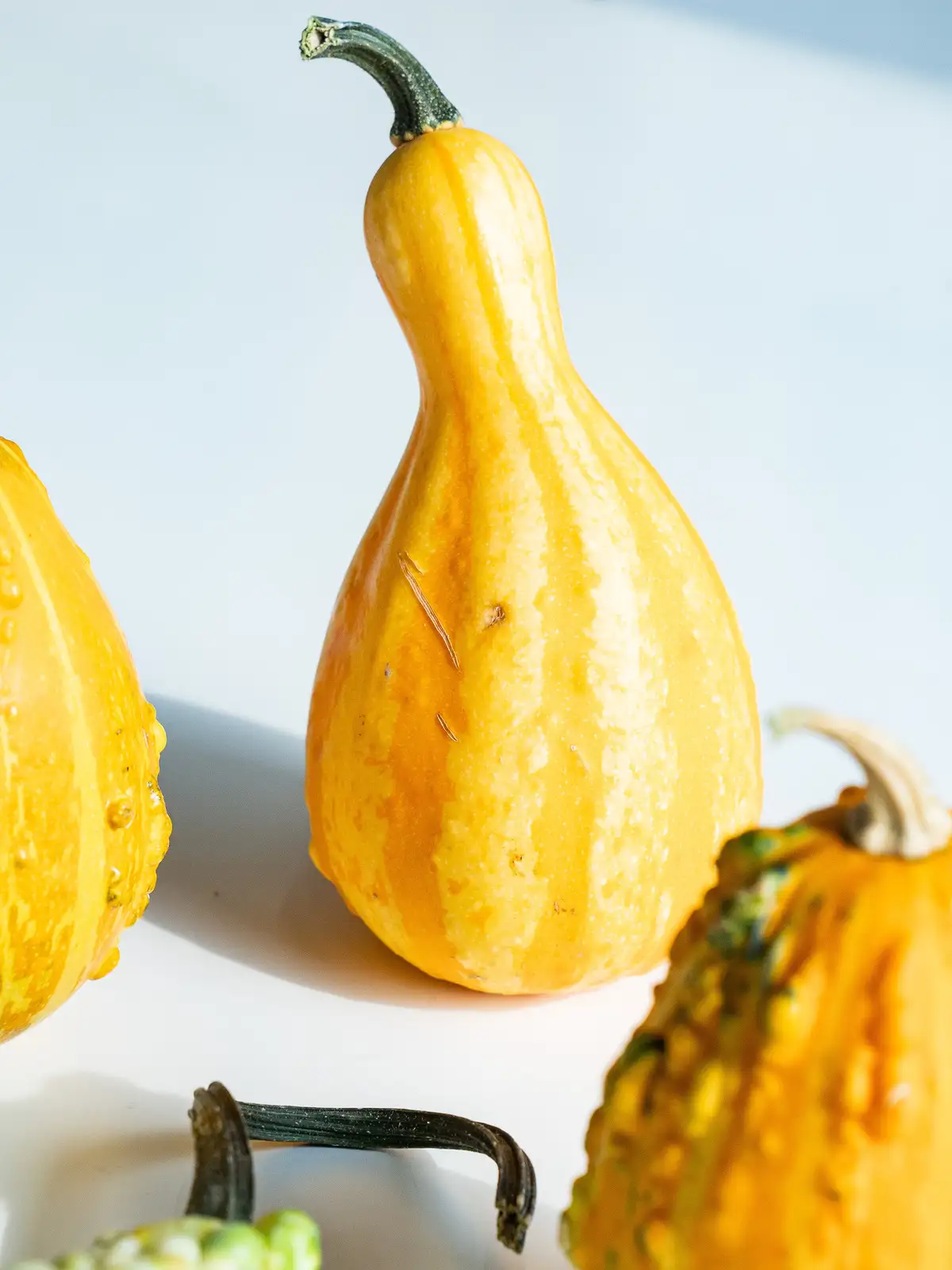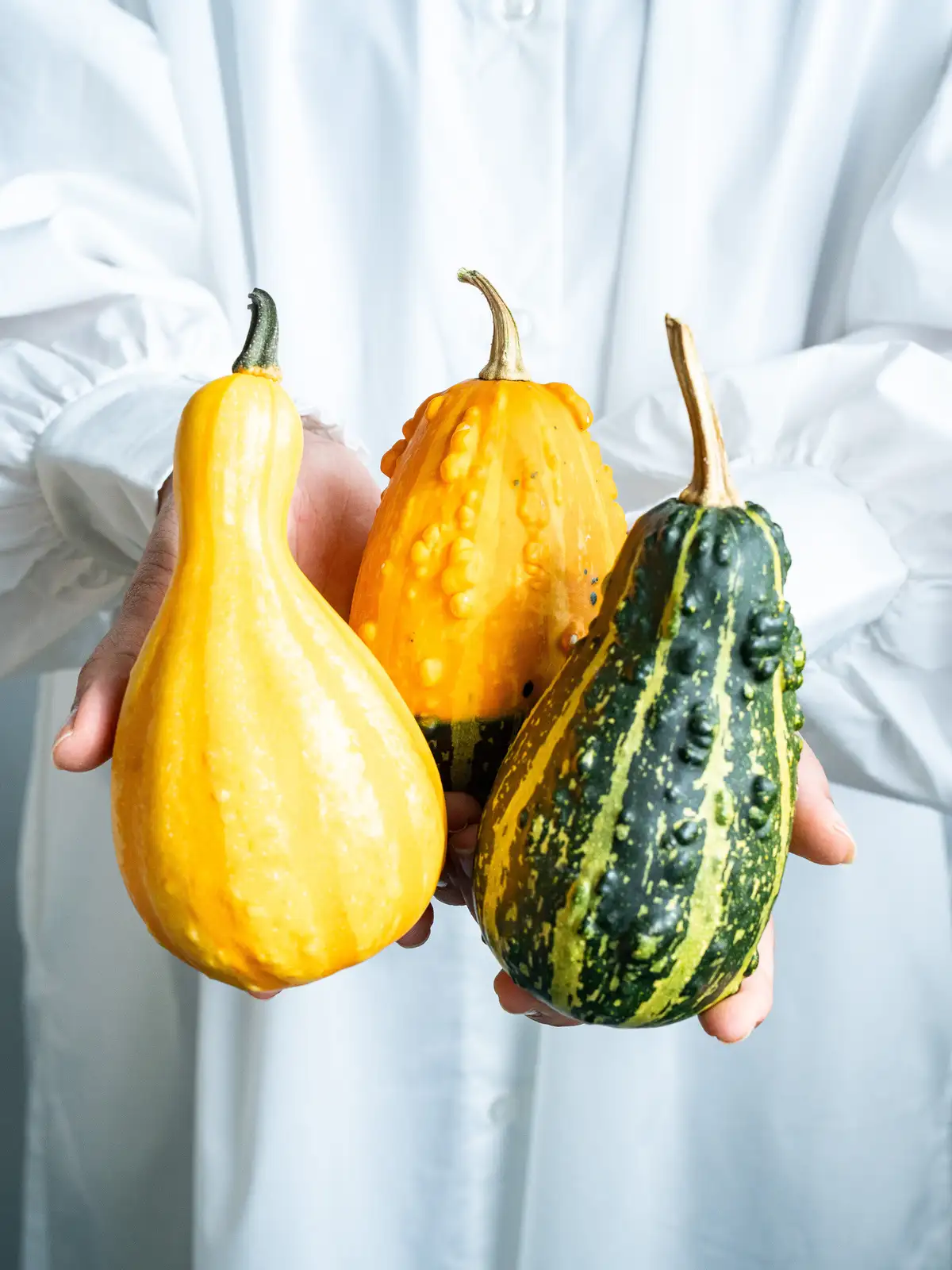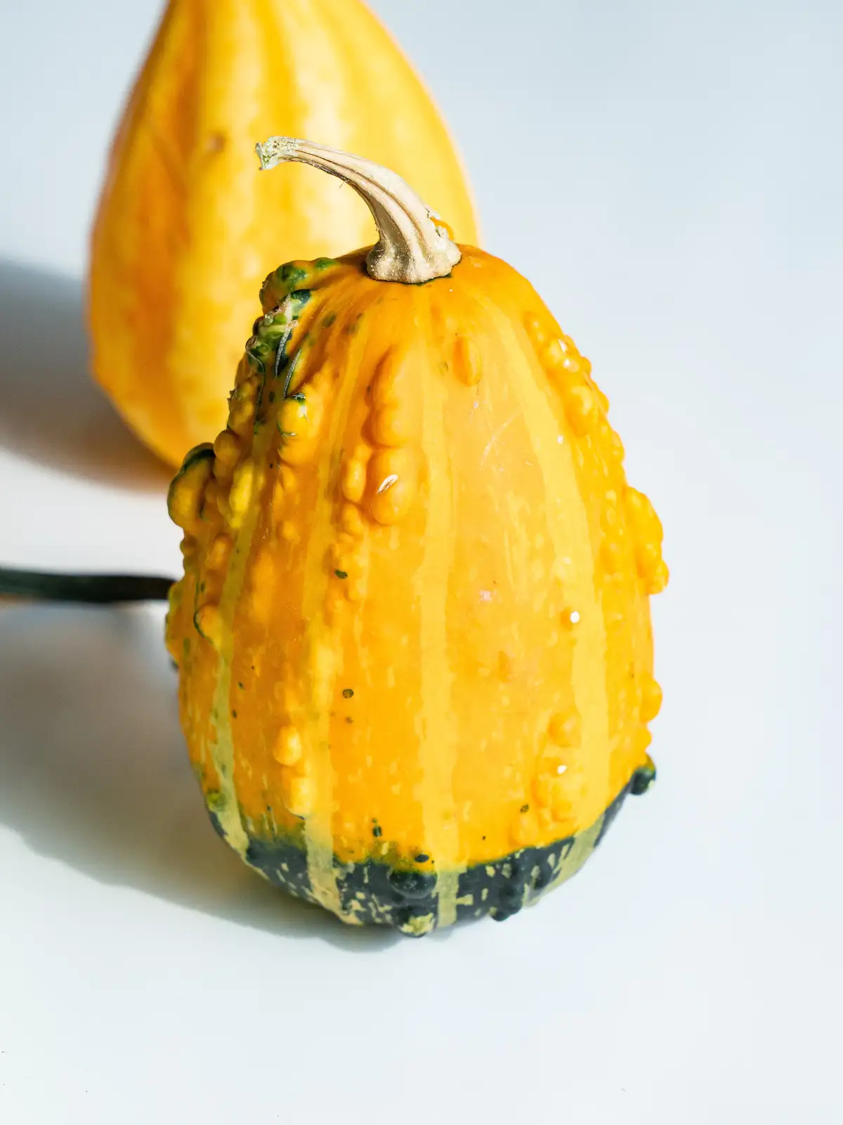 白・オレンジ・緑などの複色模様が入った観賞用のかぼちゃ。形や色に個体差があります。