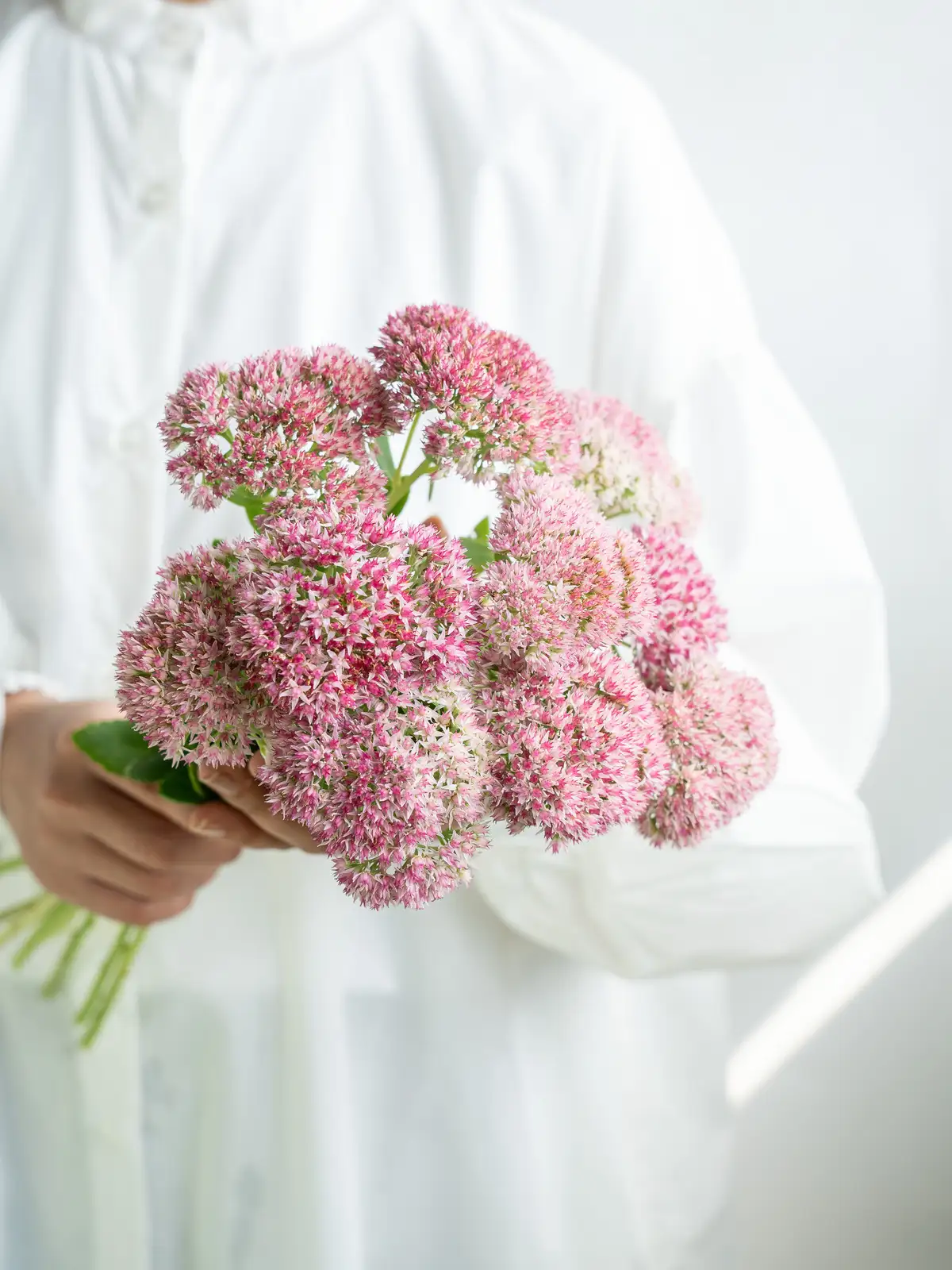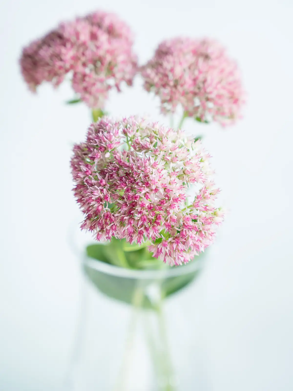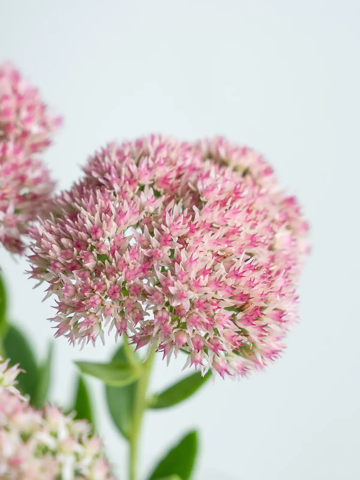 淡いピンクから濃いピンクへと色づく花房。小花が密に集まり、肉厚の多肉質な茎葉を持ちます。