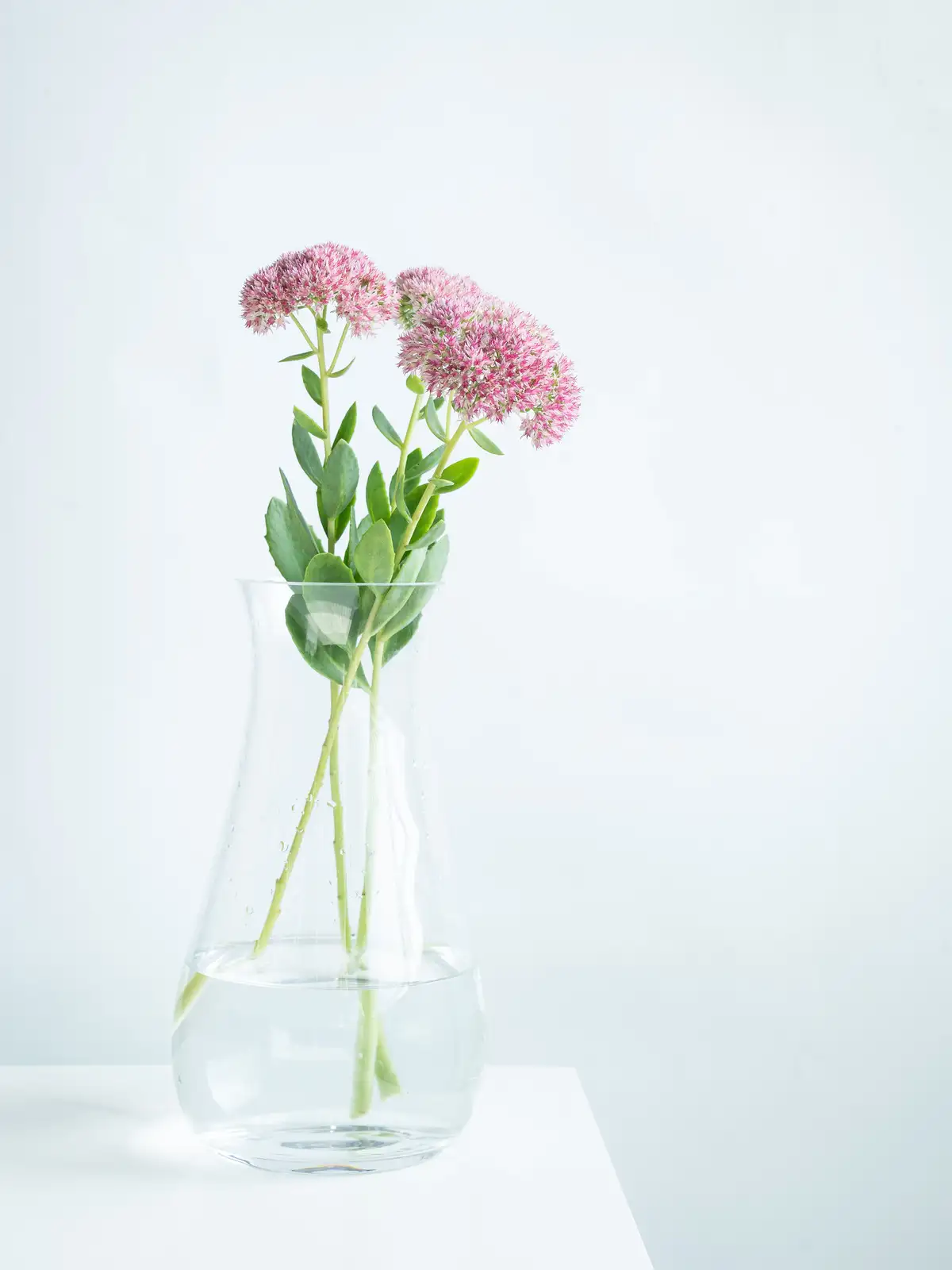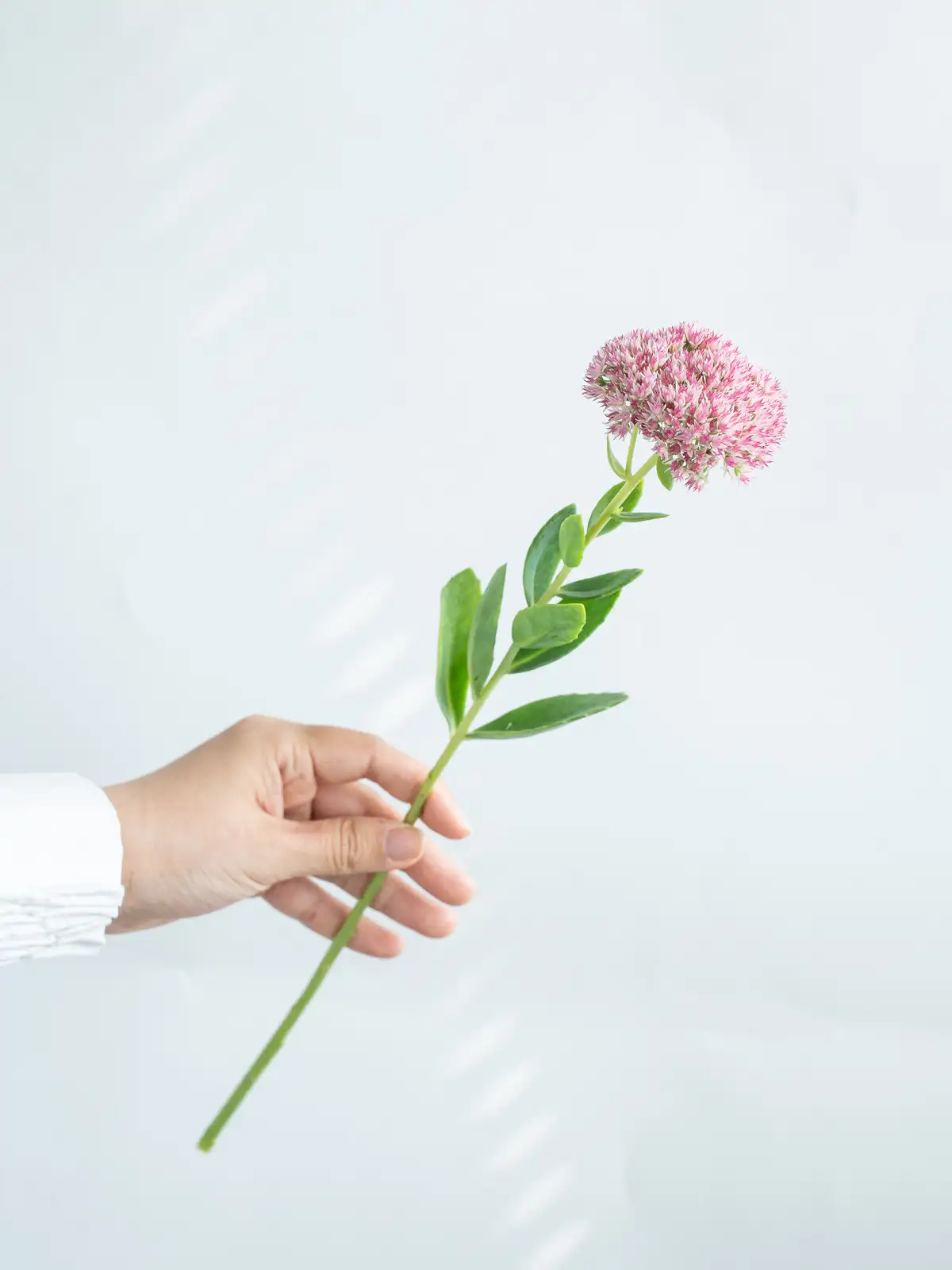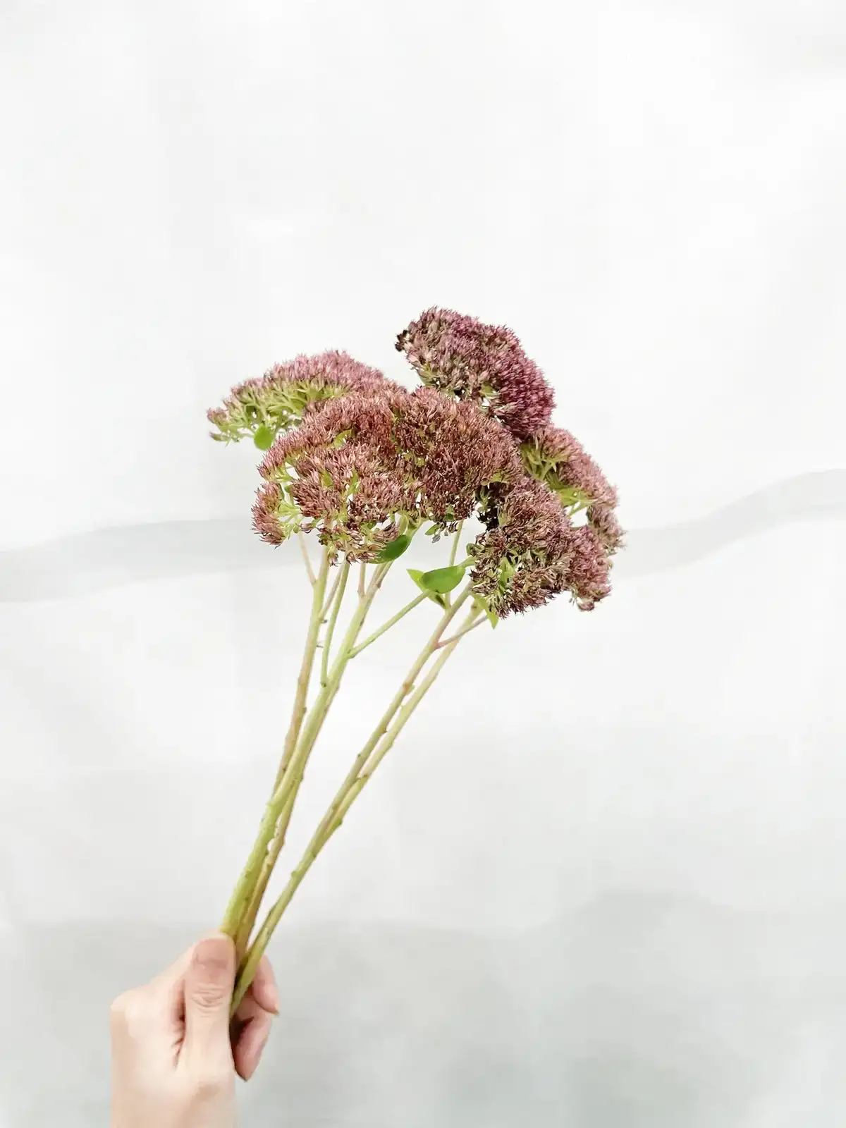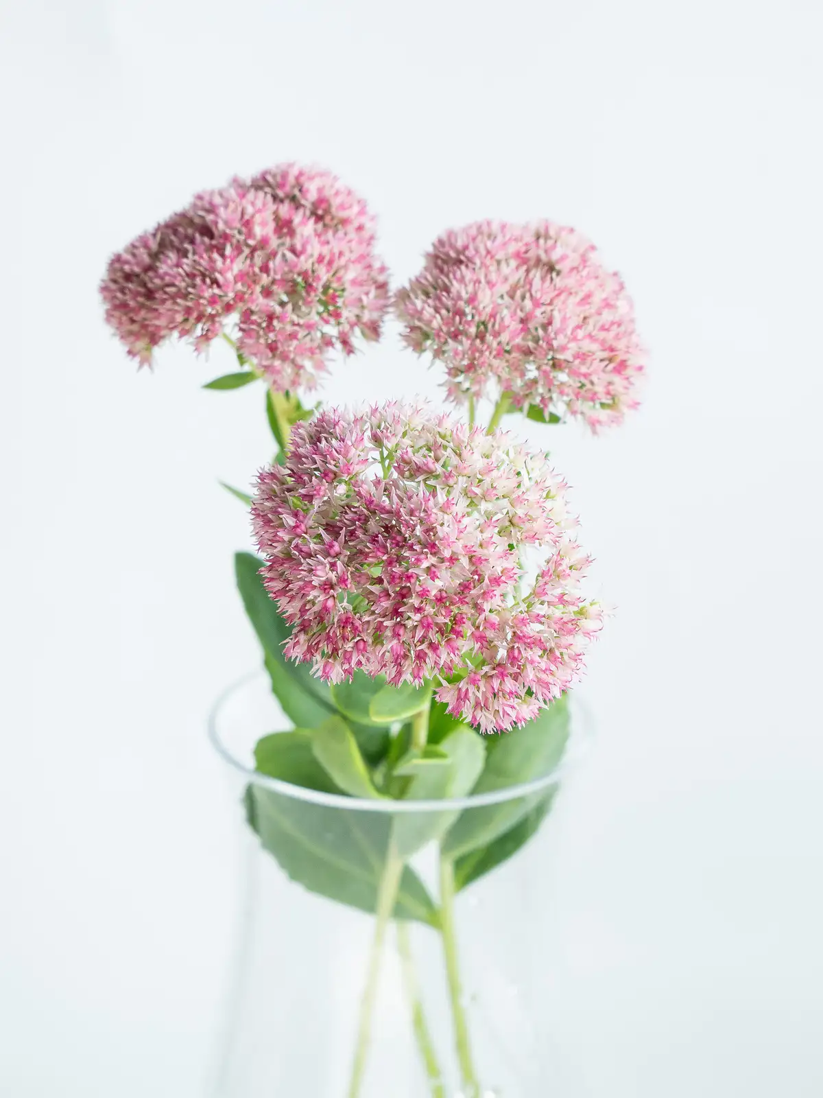 淡いピンクから濃いピンクへと色づく花房。小花が密に集まり、肉厚の多肉質な茎葉を持ちます。