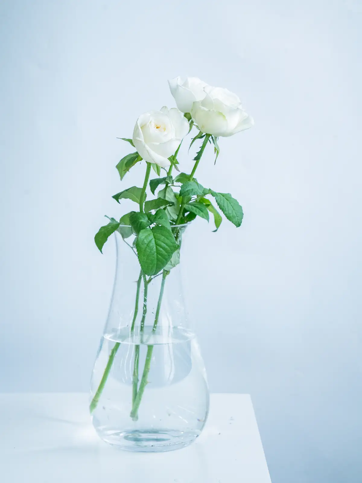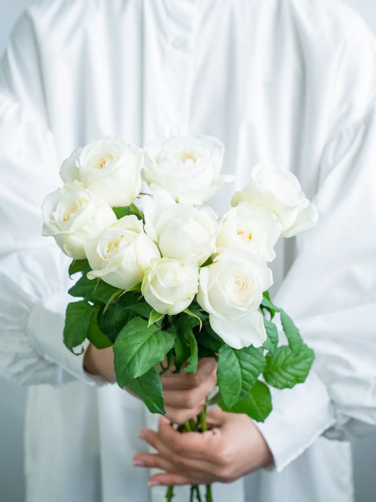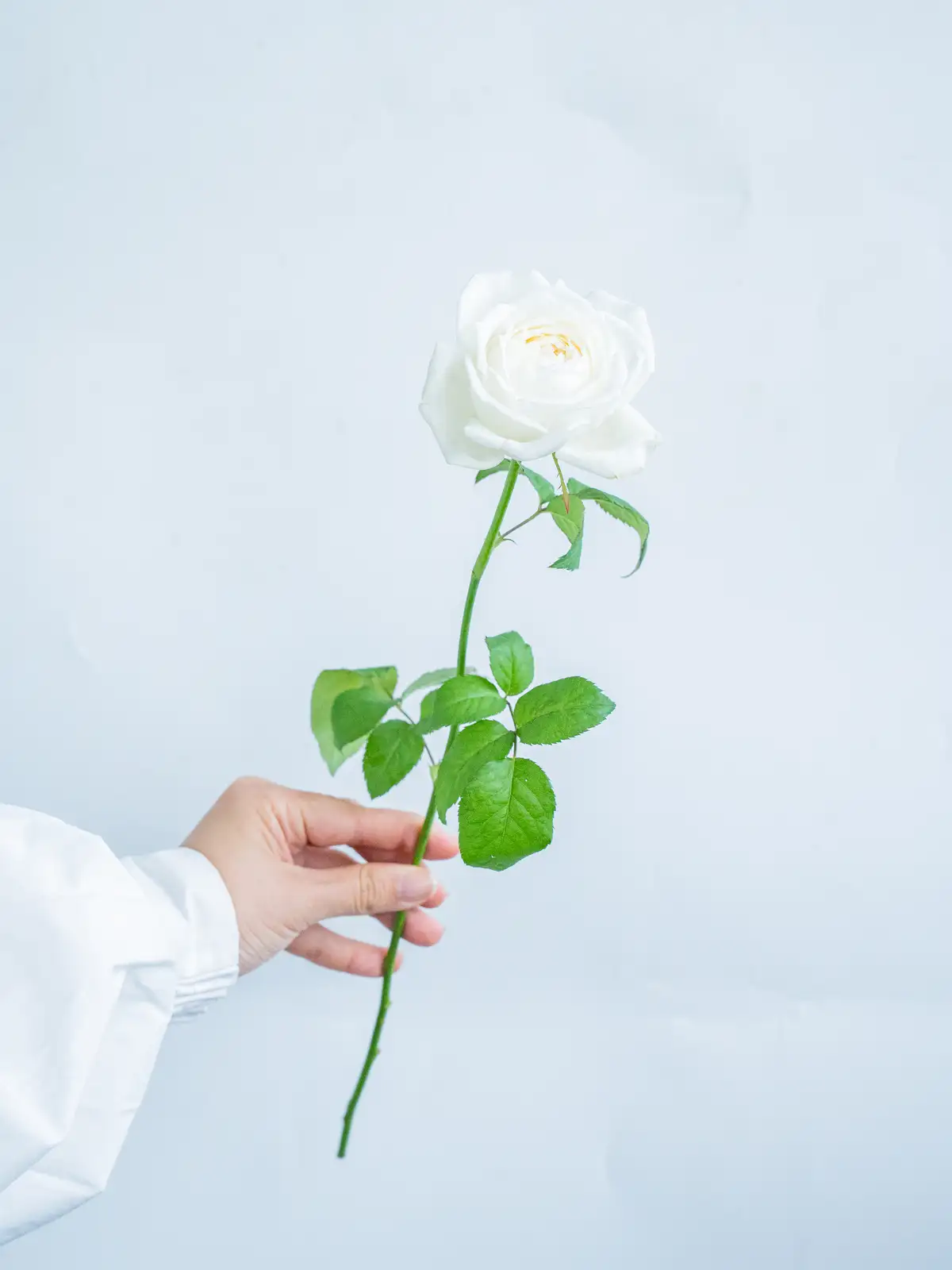 透明感のある純白の花色。花形は整った剣弁高芯咲きで、清楚で気品ある印象を持ちます。