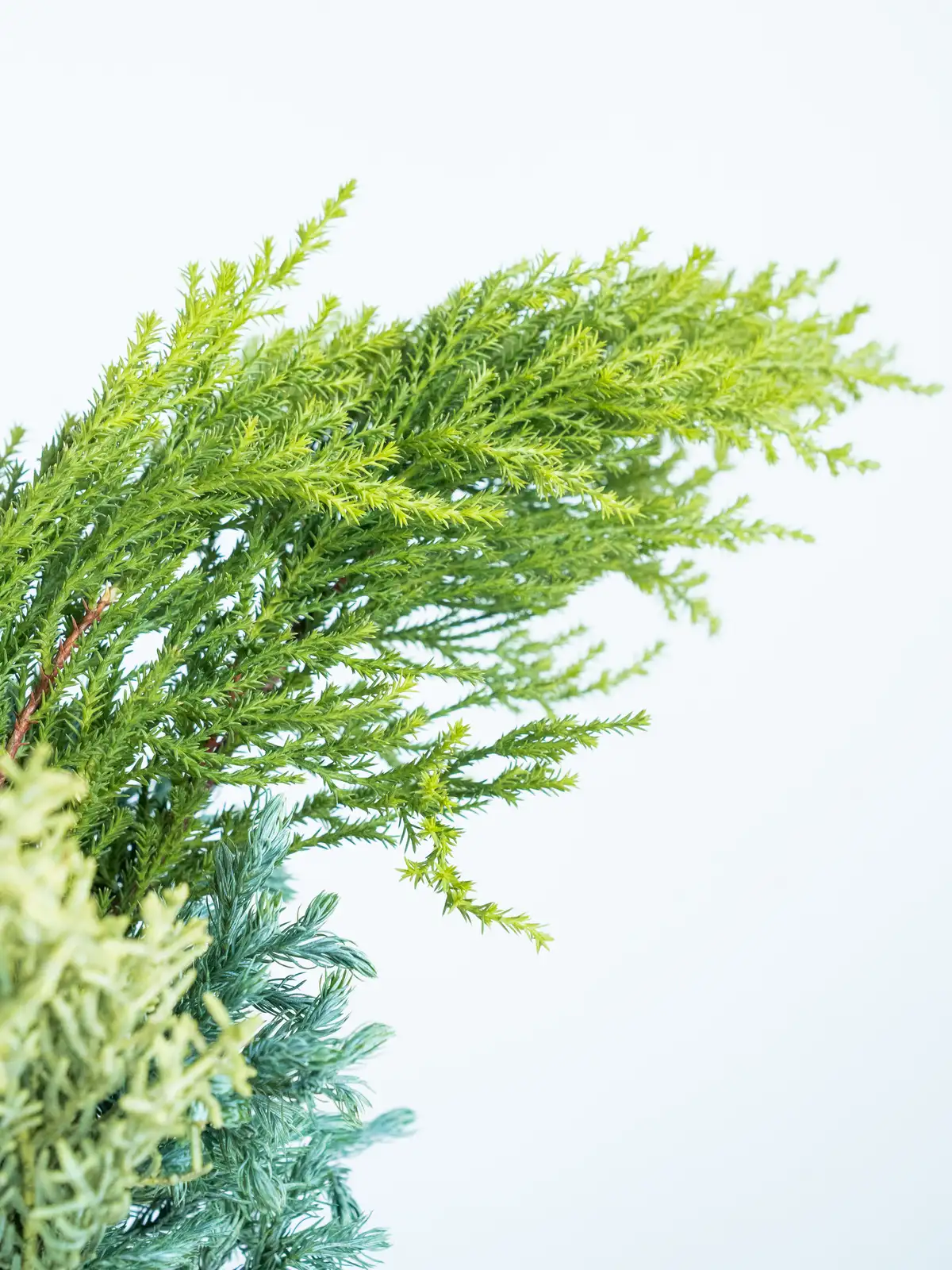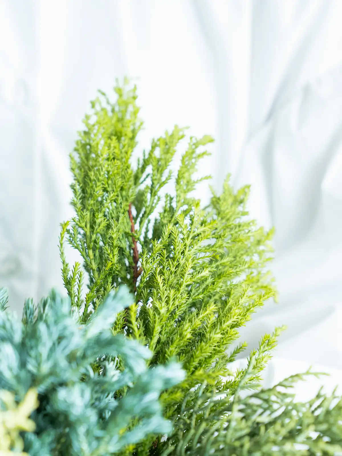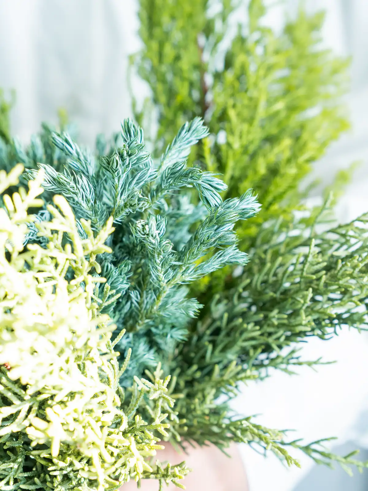 複数の種類のコニファーを組み合わせたグリーン素材。種類によって葉の形や緑の濃淡が異なり、自然な奥行きが生まれます。