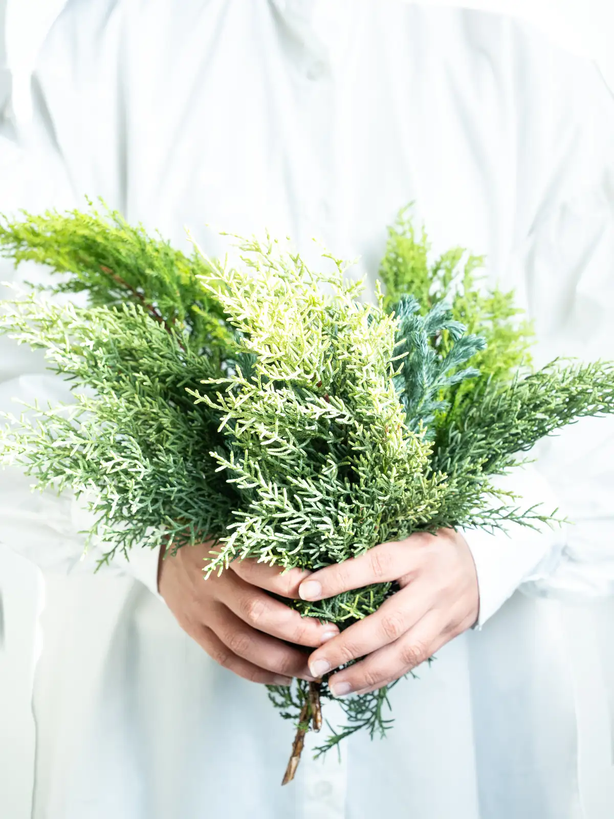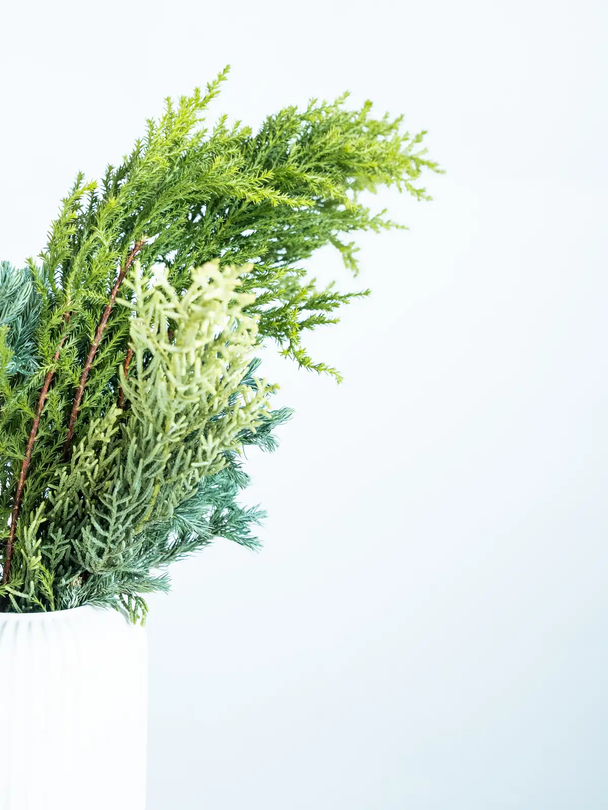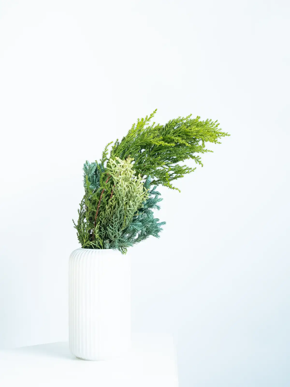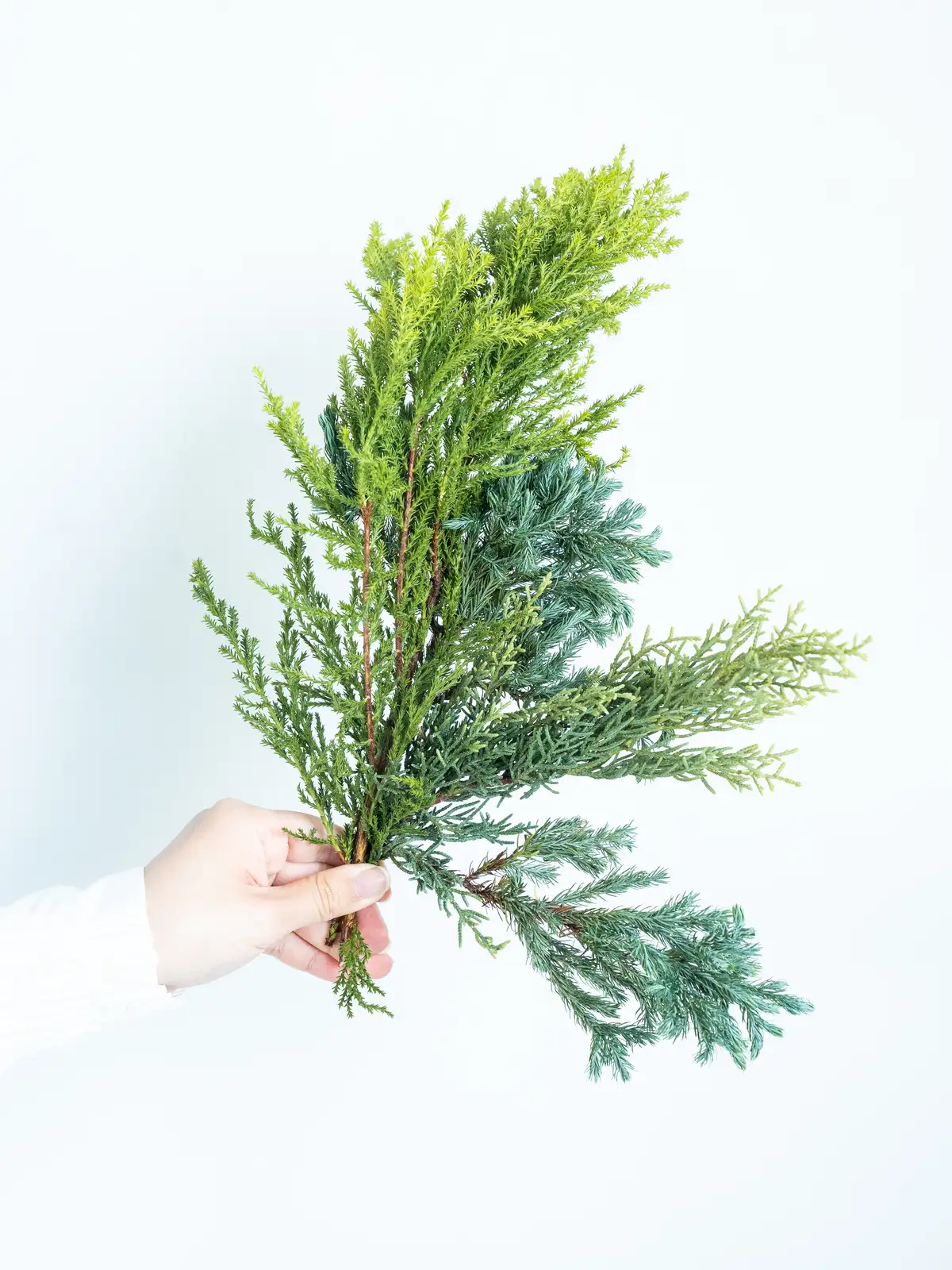 複数の種類のコニファーを組み合わせたグリーン素材。種類によって葉の形や緑の濃淡が異なり、自然な奥行きが生まれます。