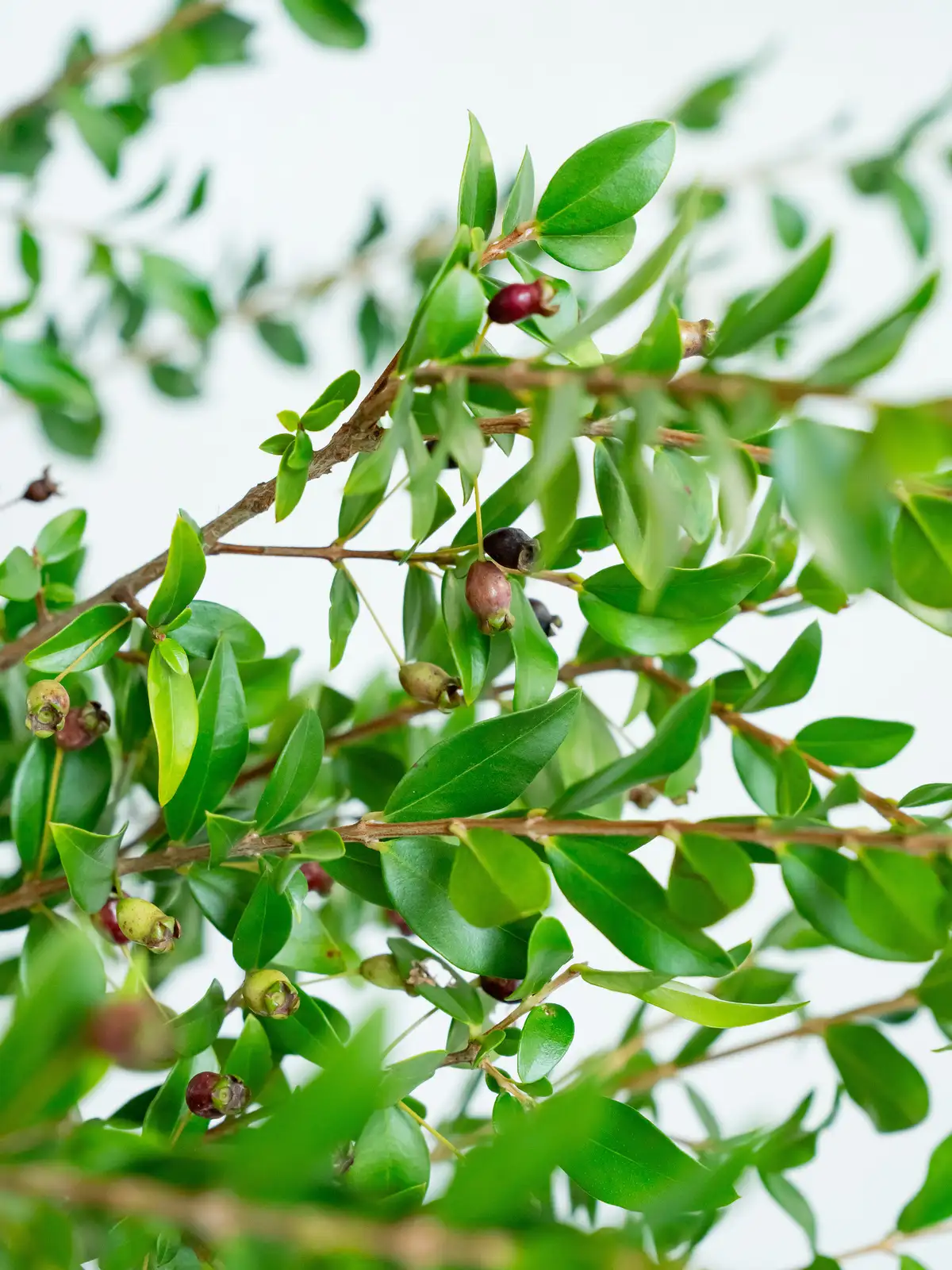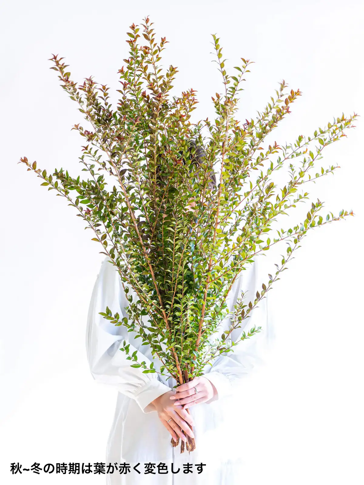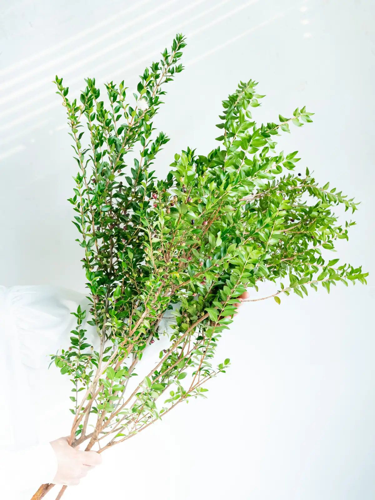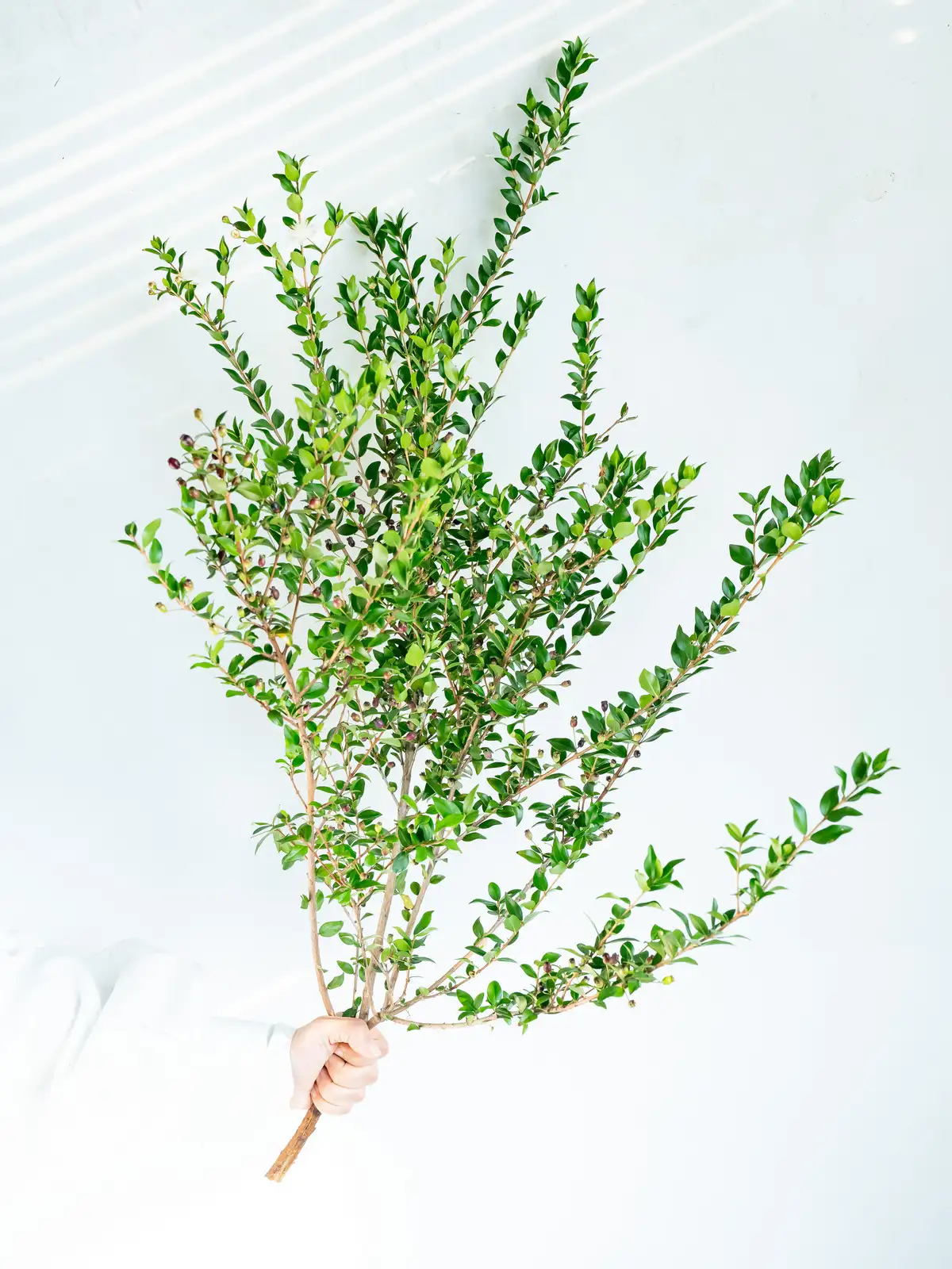 つやのある濃緑色の葉と枝が特徴の枝物。枝ぶりがしっかりしており、生命力を感じる質感を持ちます。