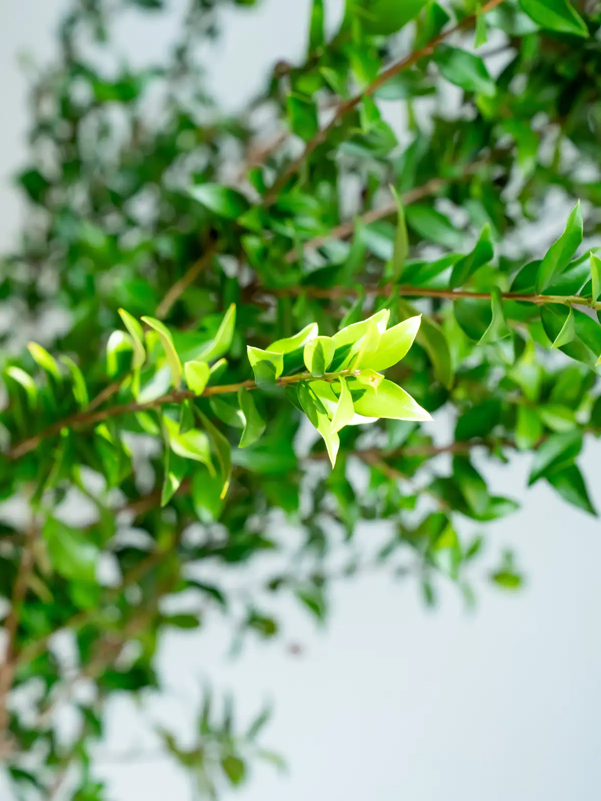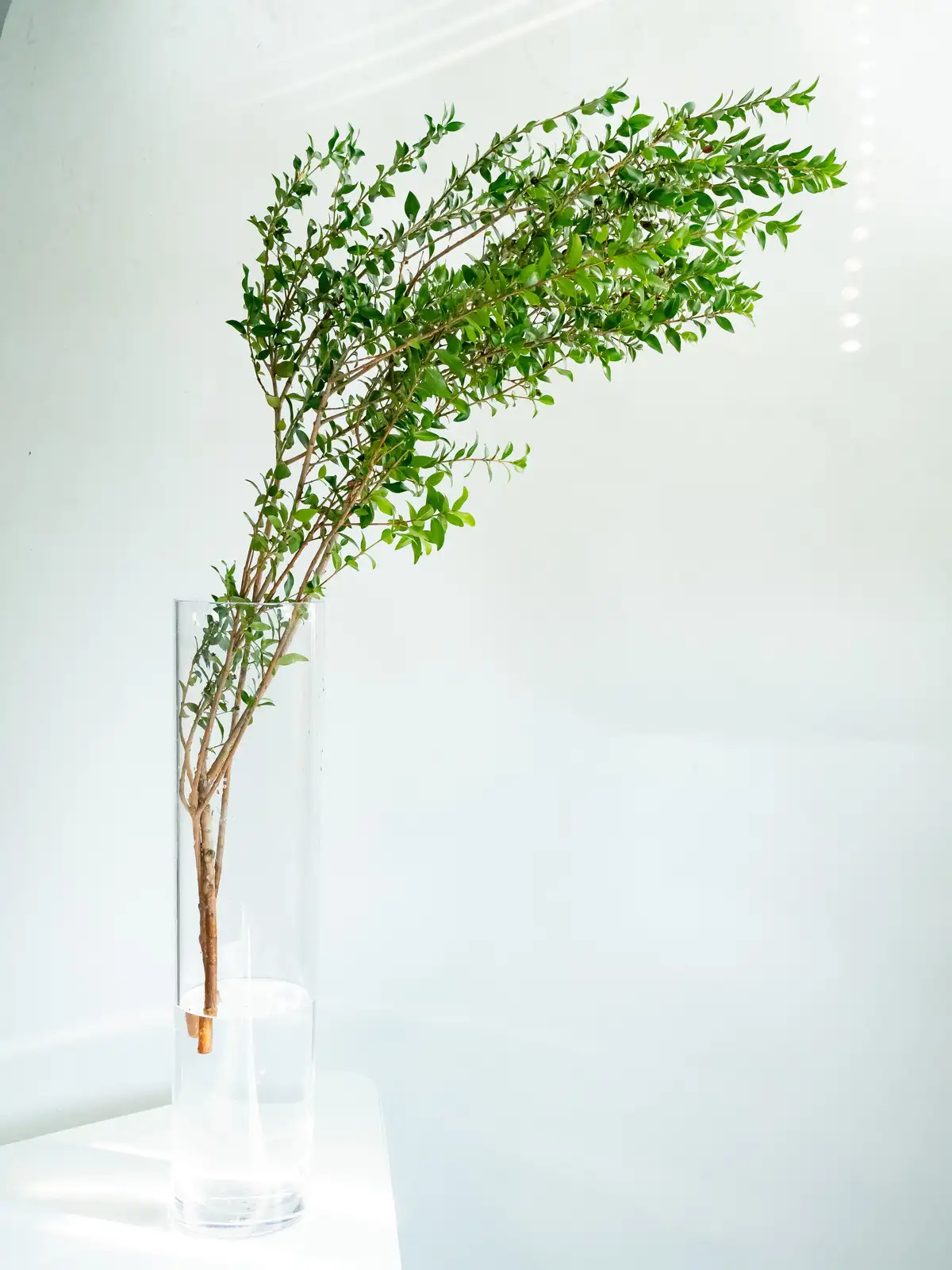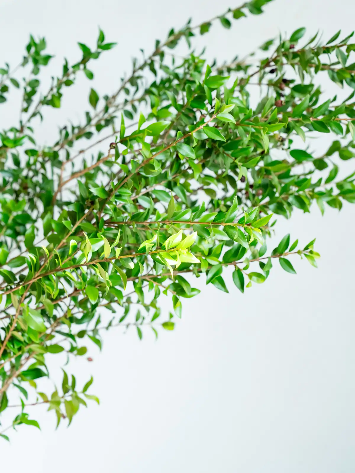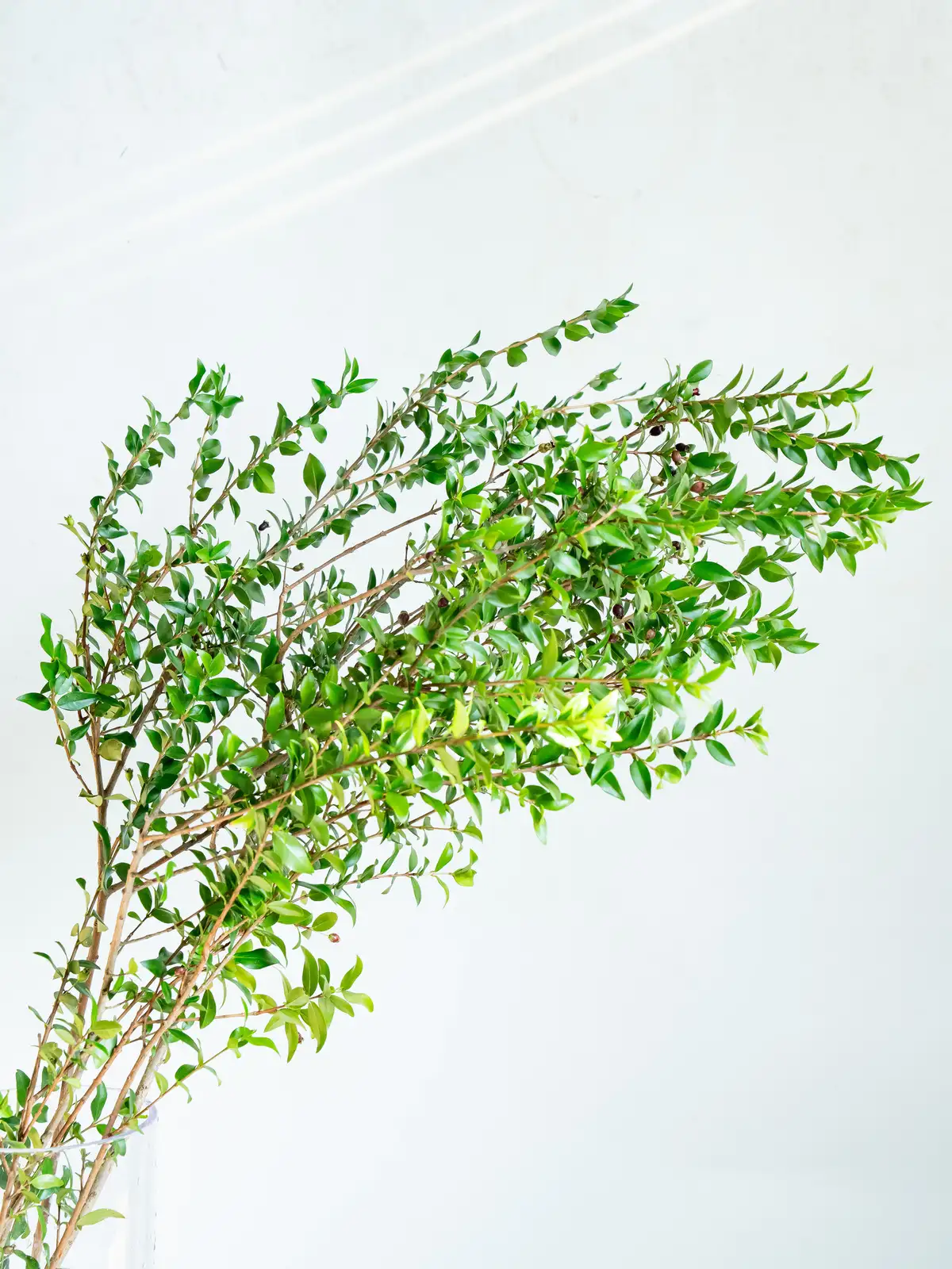 つやのある濃緑色の葉と枝が特徴の枝物。枝ぶりがしっかりしており、生命力を感じる質感を持ちます。