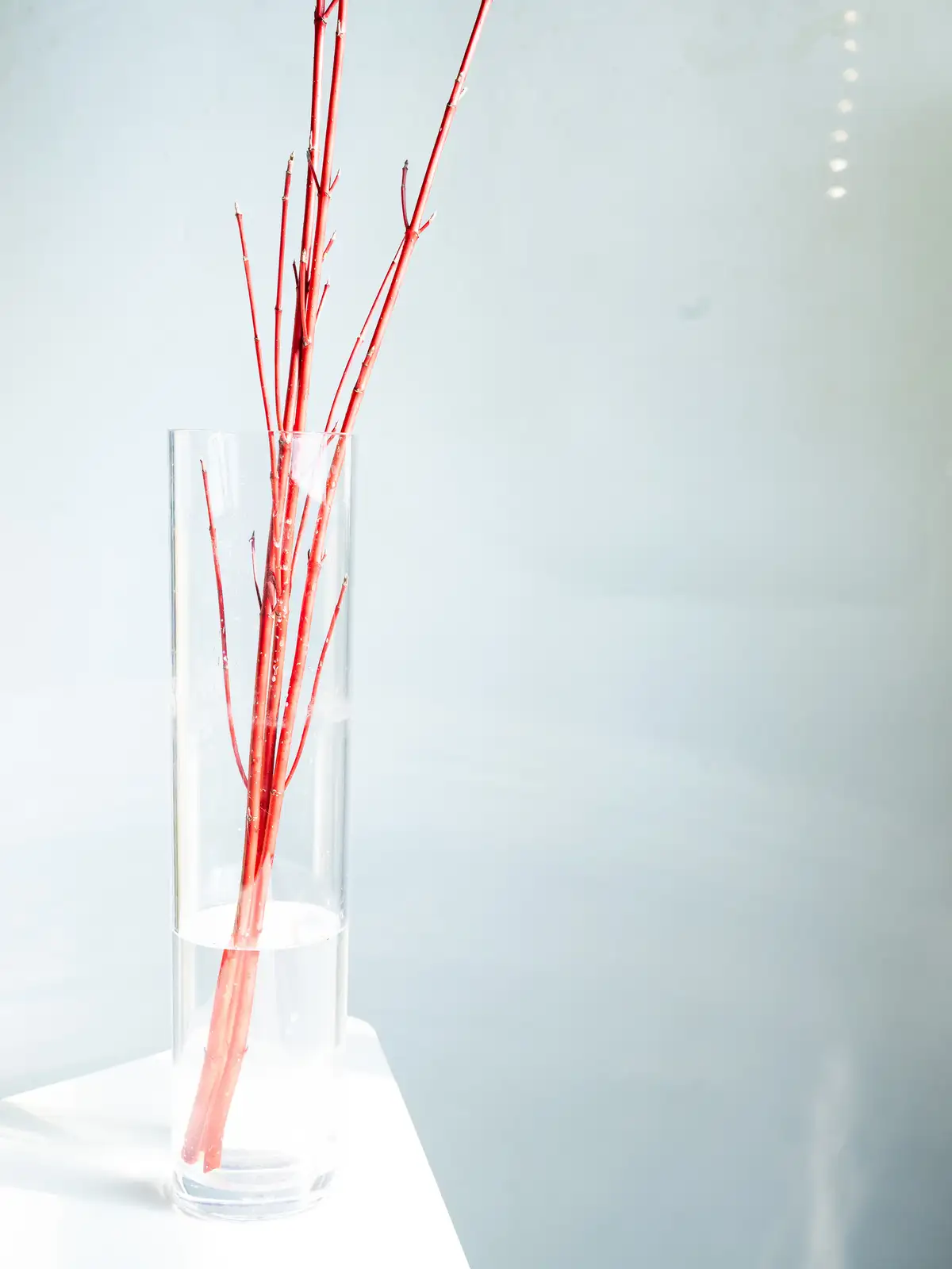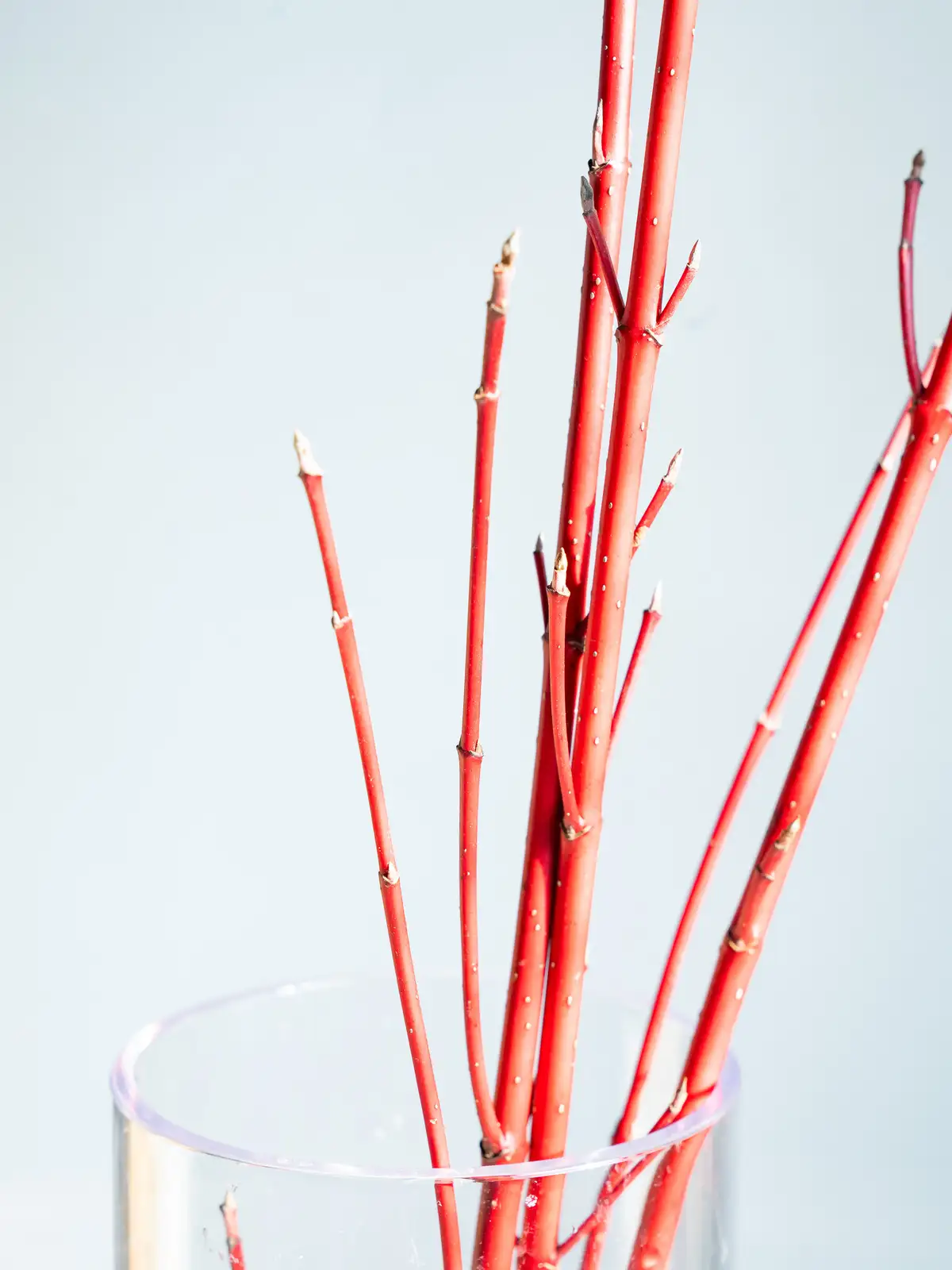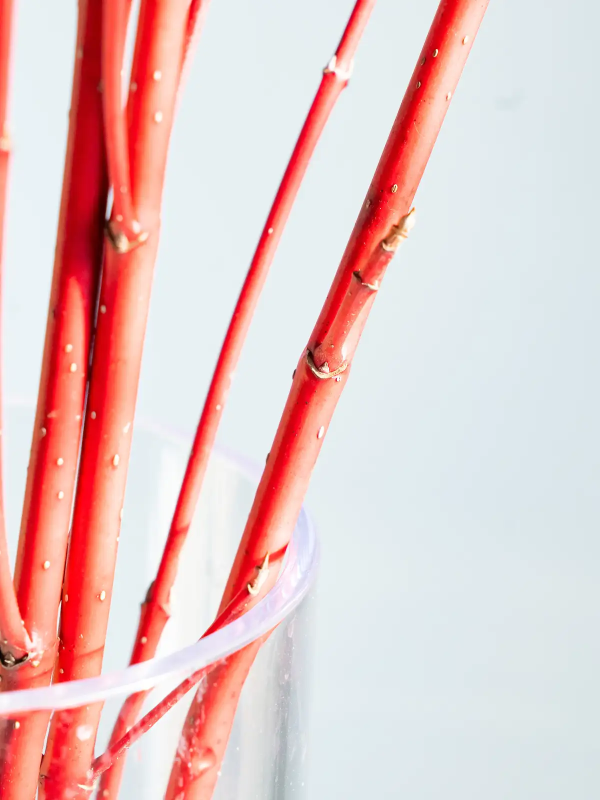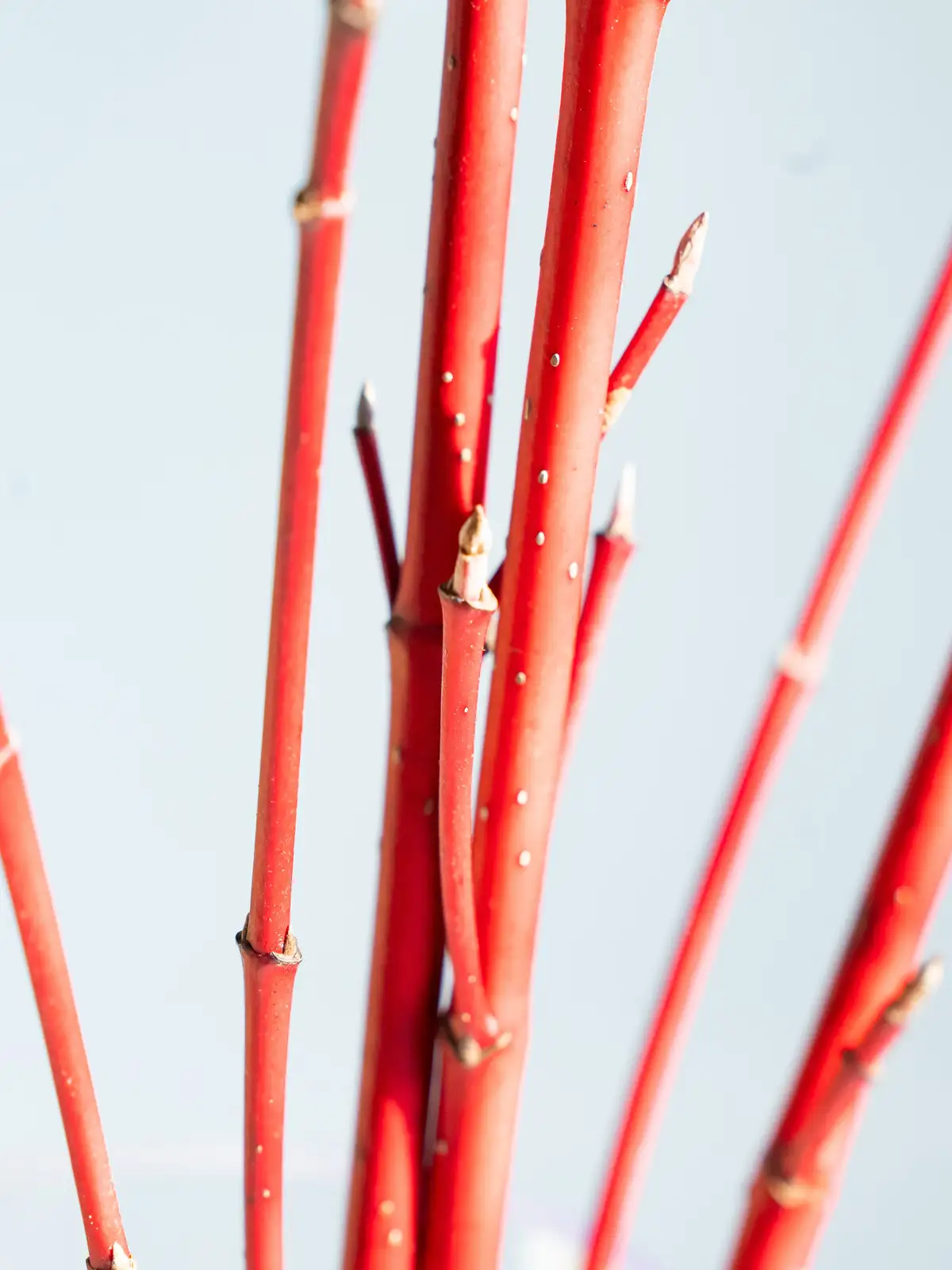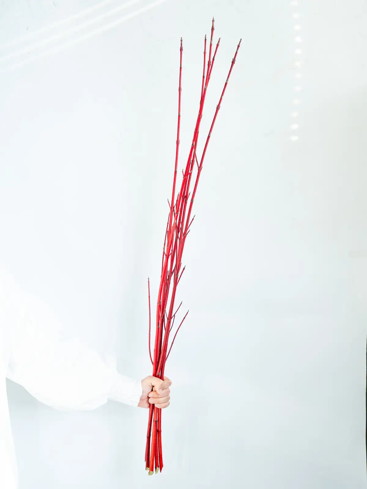 1束18本入りです。鮮やかな赤色の枝が特徴の落葉低木。冬季に葉を落とし、枝の色が際立つ装飾素材です。