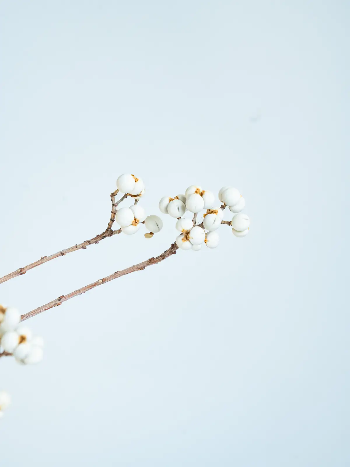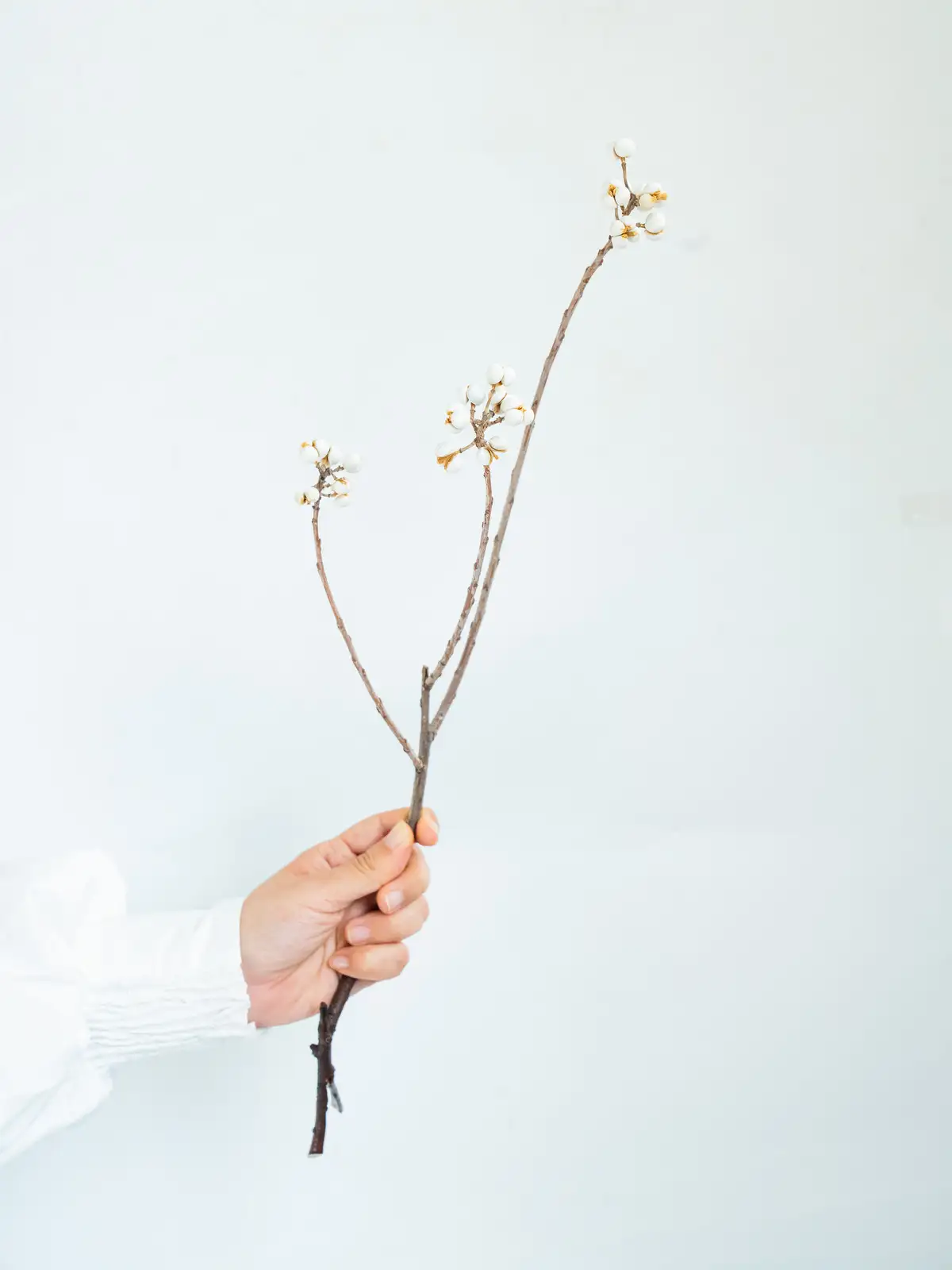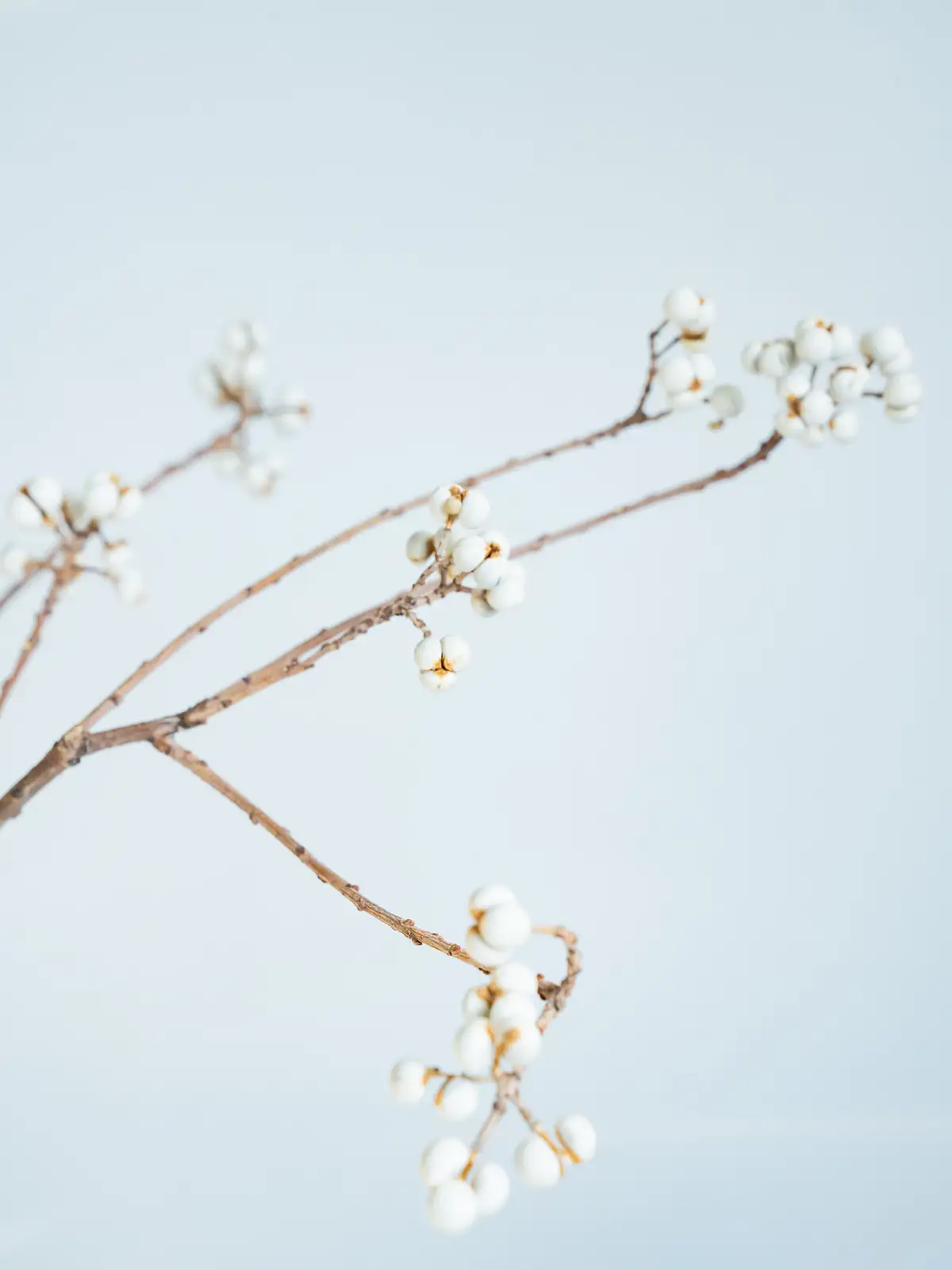 白い果実が房状につく枝物。果実は丸みがあり、ドライになるとクリーム色〜白色に変化します。