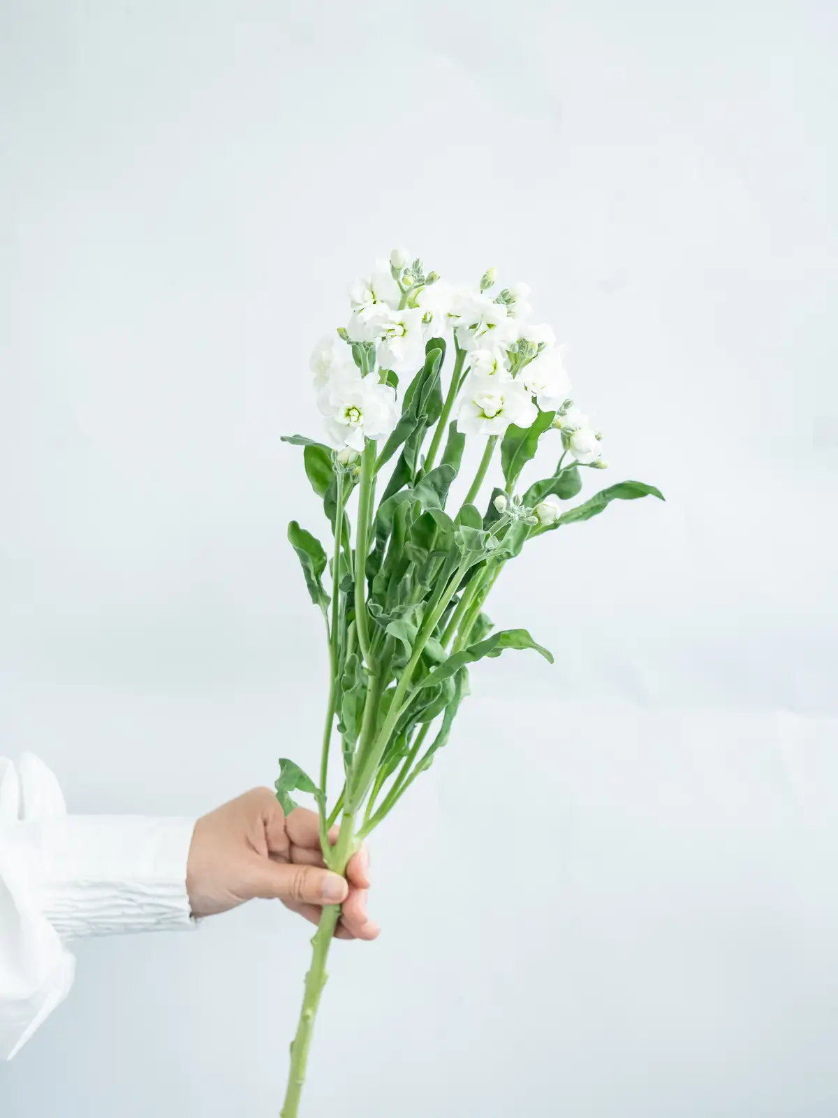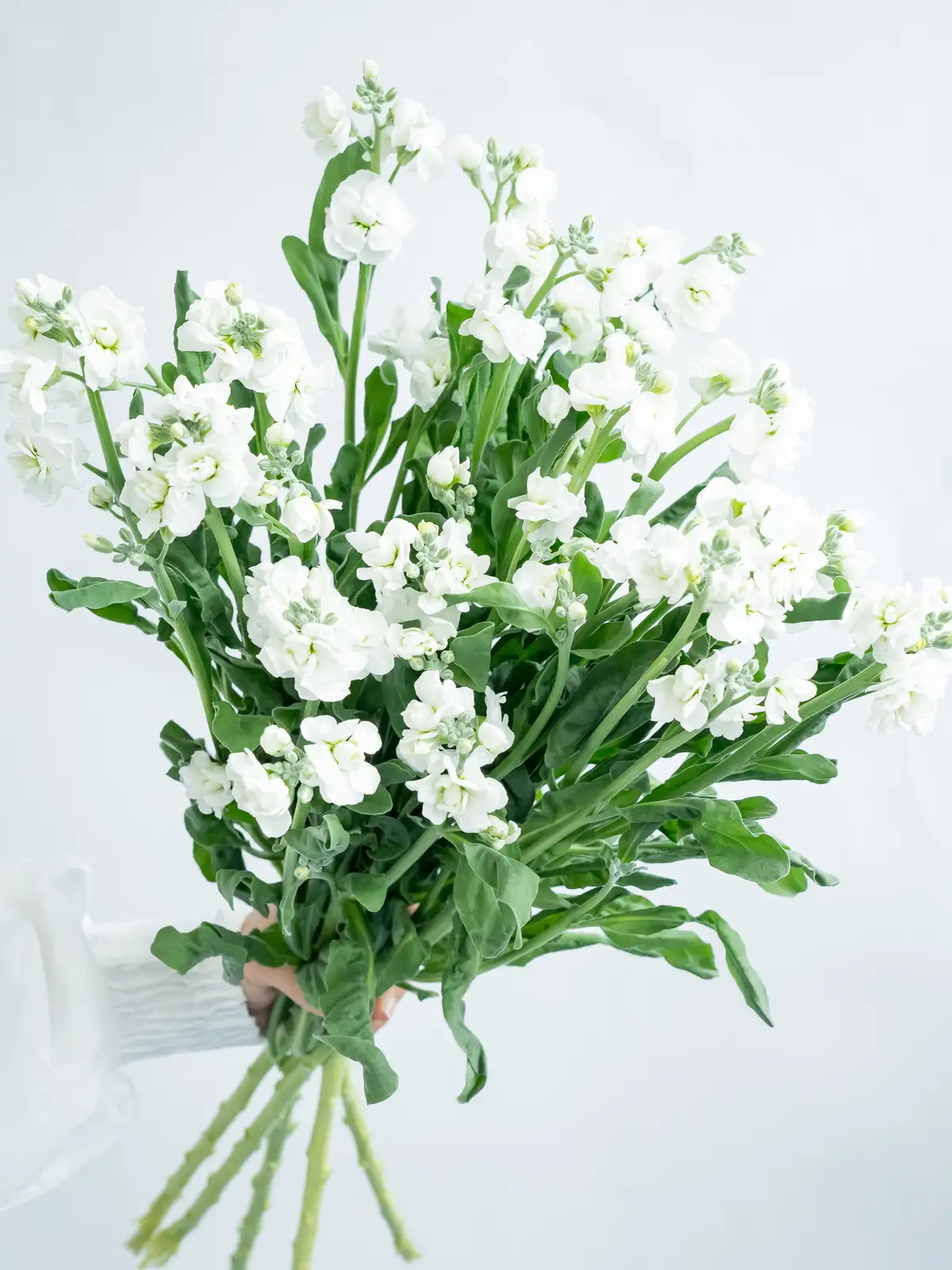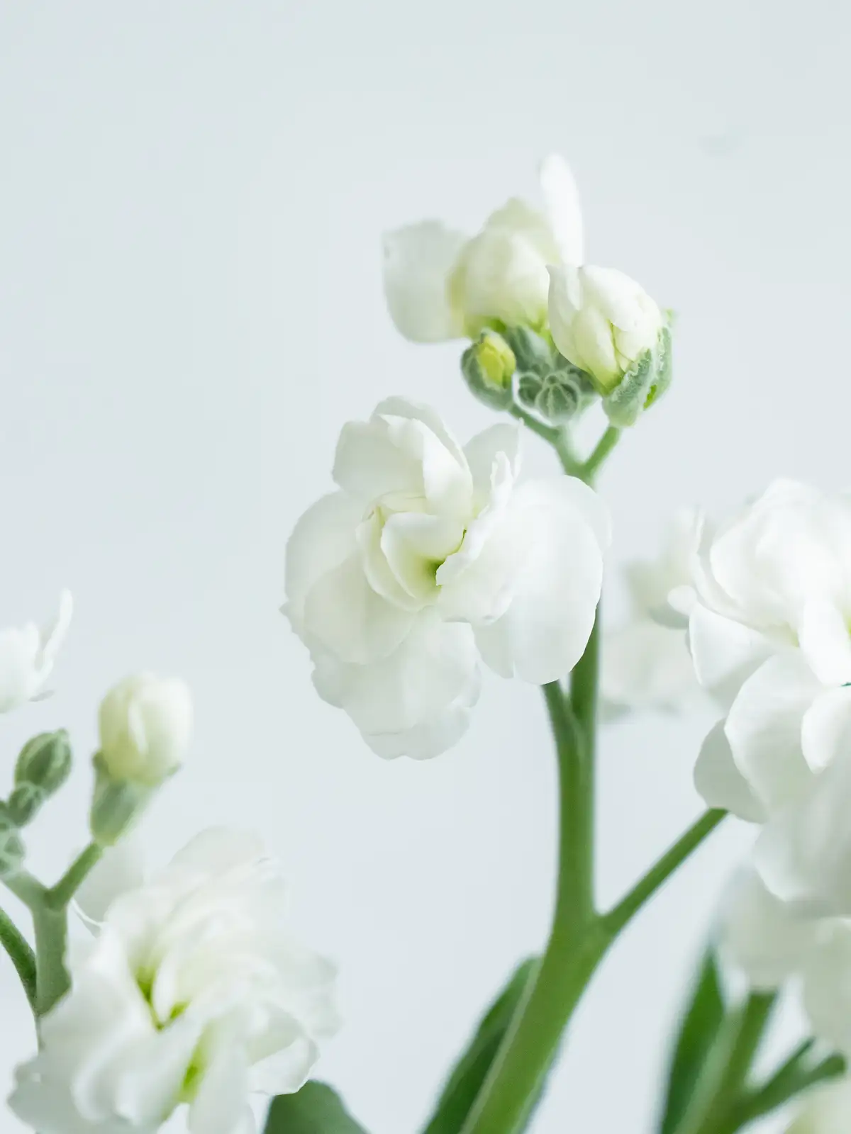 純白の八重咲きストック。花弁は大きく厚みがあり、清楚でボリュームのある花姿が特徴です。