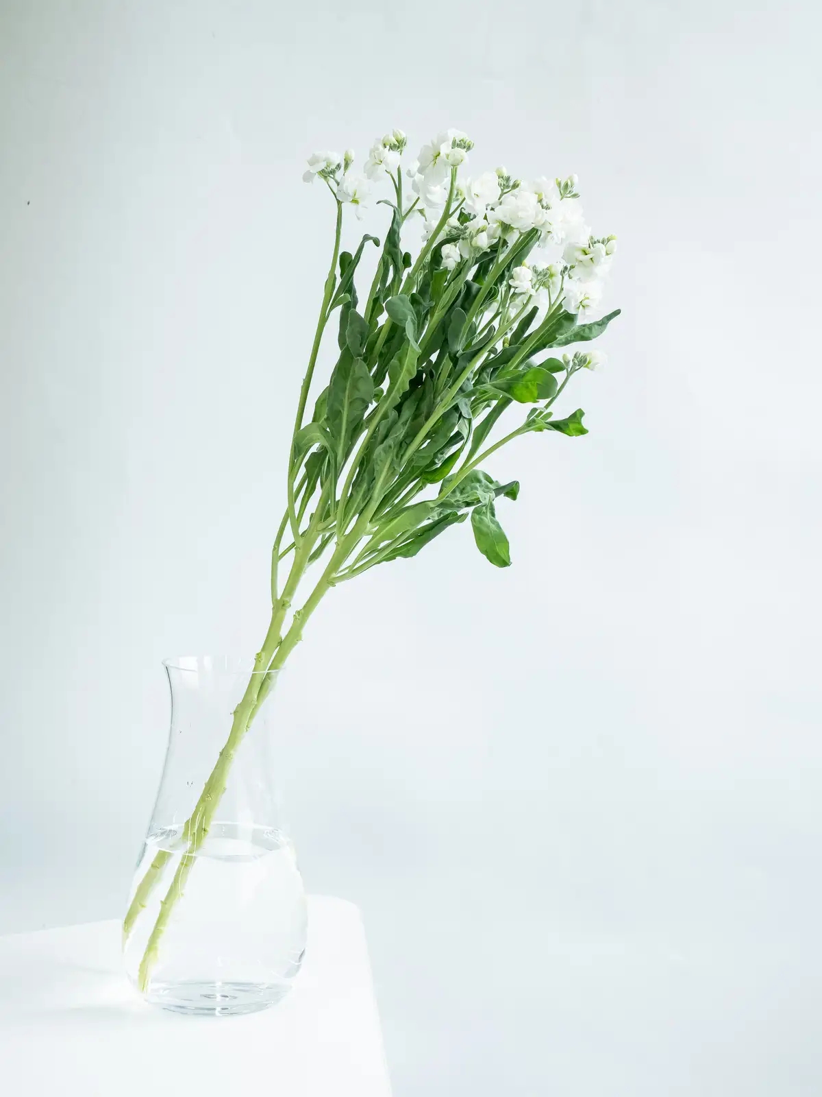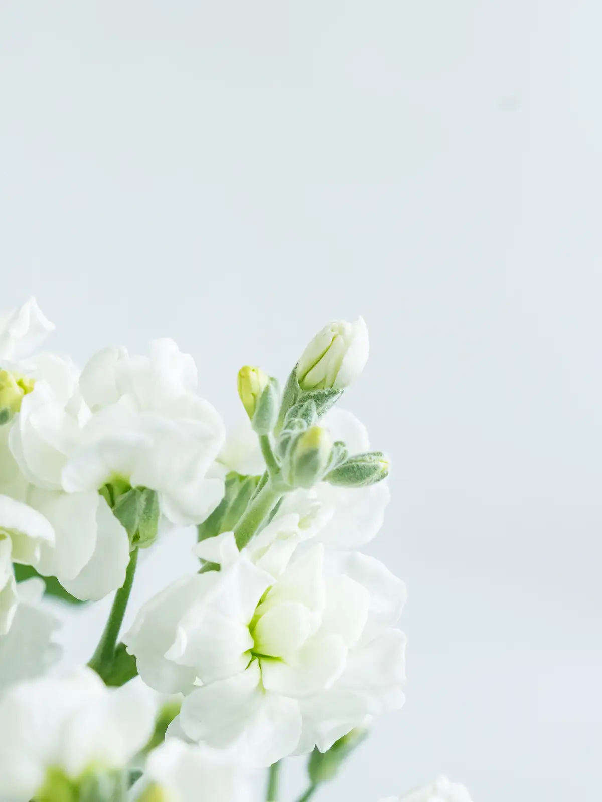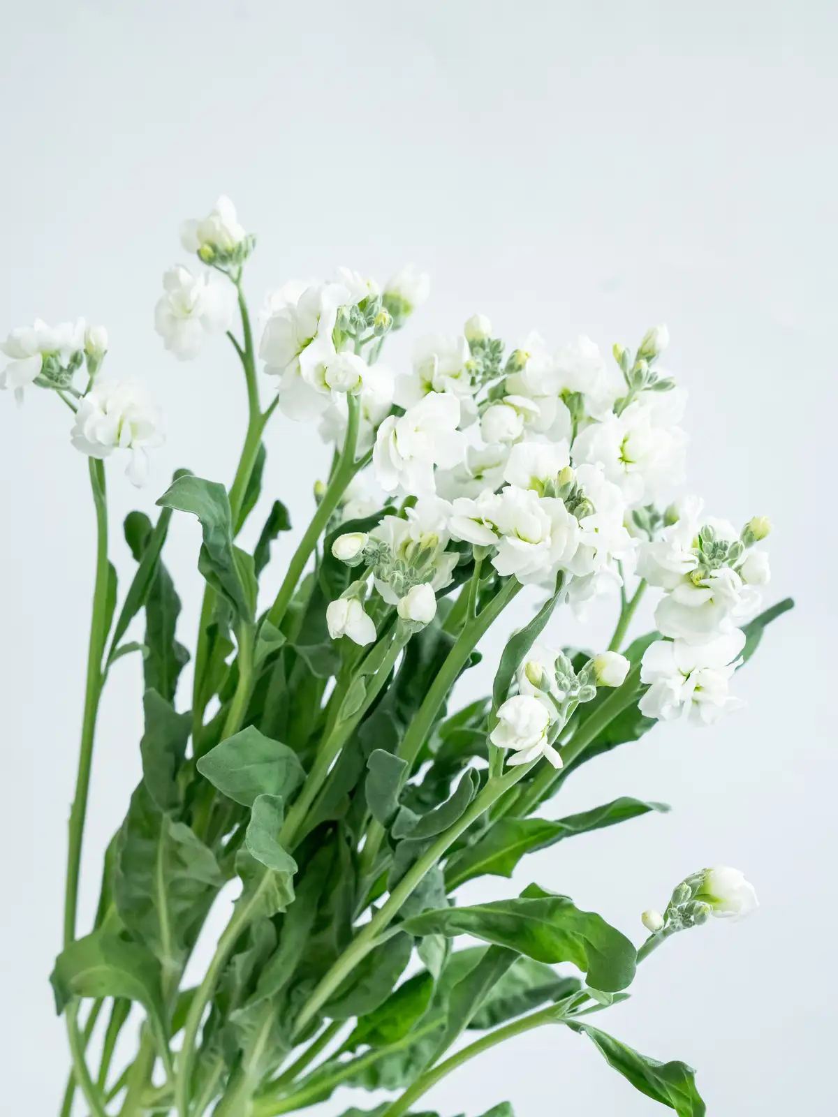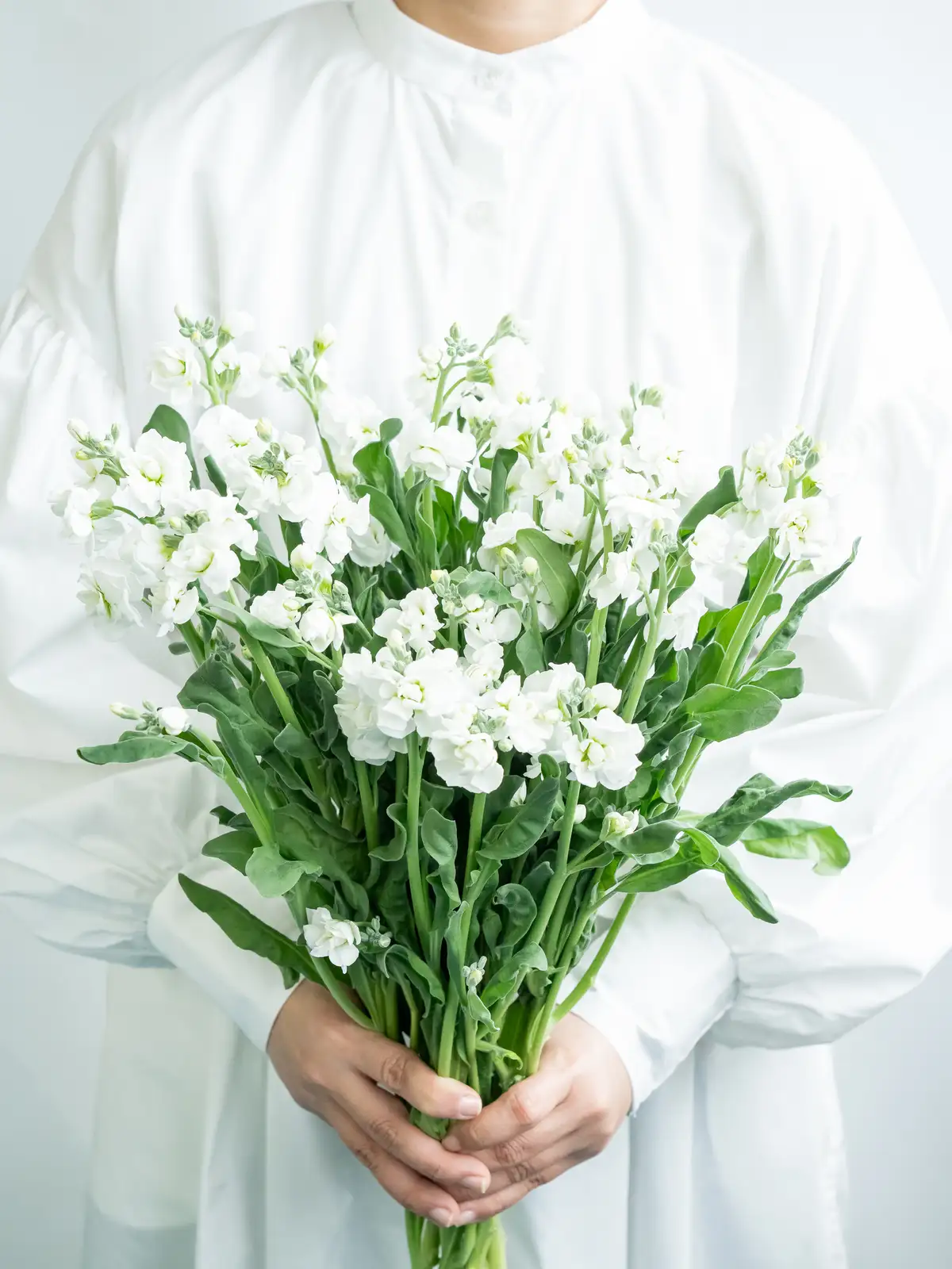 純白の八重咲きストック。花弁は大きく厚みがあり、清楚でボリュームのある花姿が特徴です。