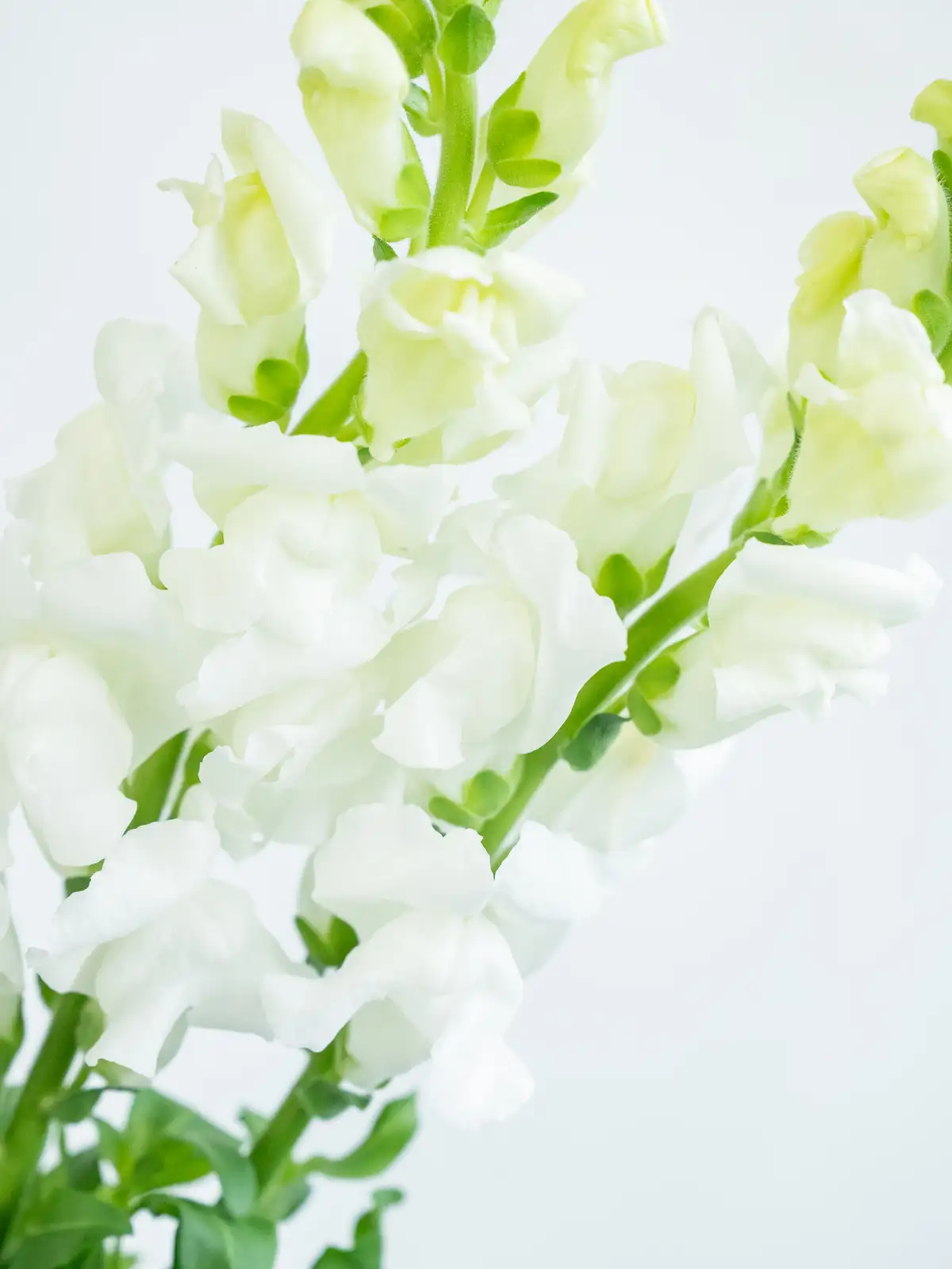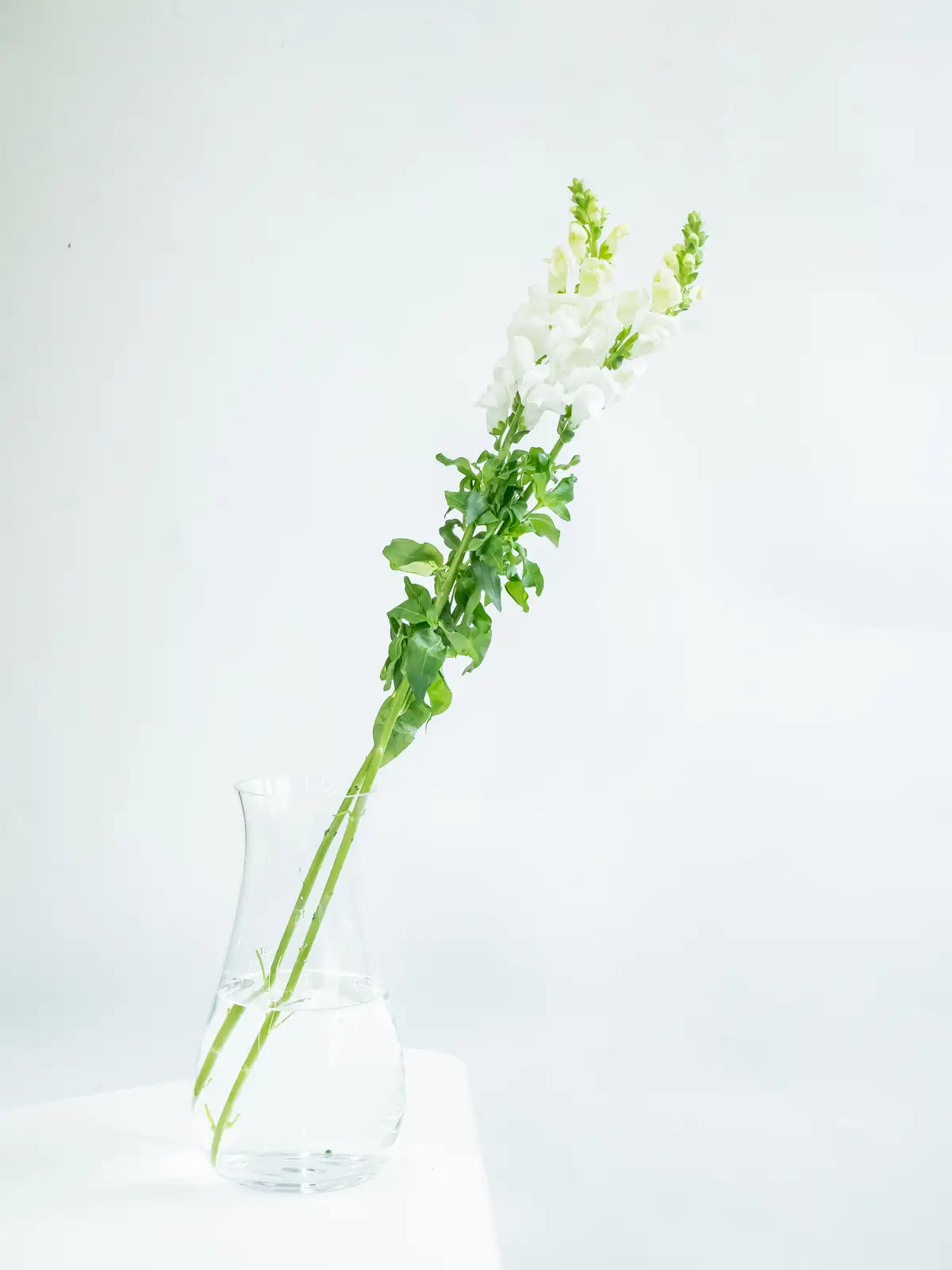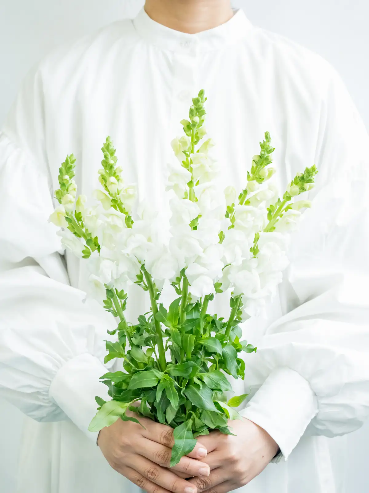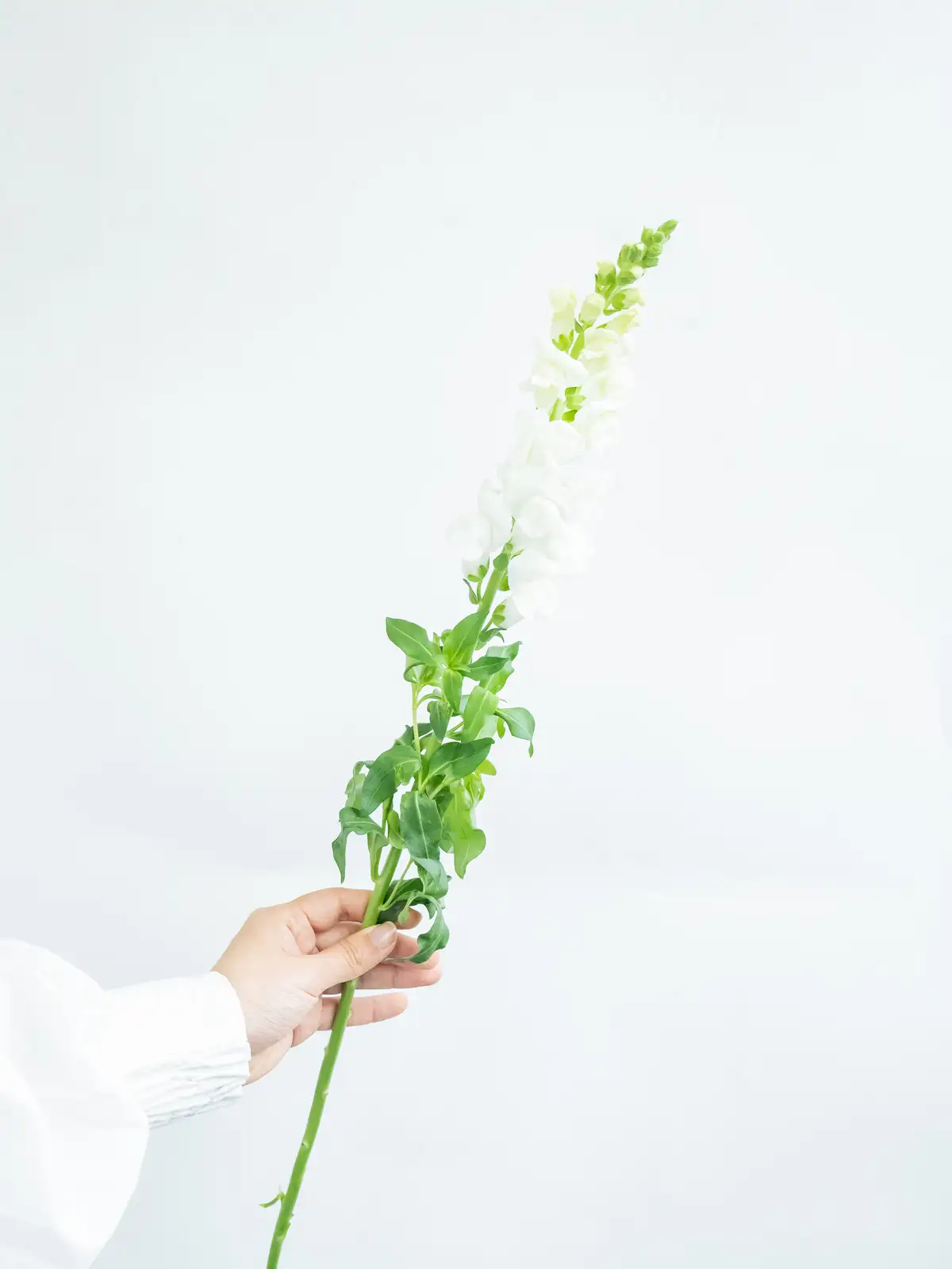 純白の花穂が清楚な印象を与える金魚草。花弁はやや厚く、しっかりとした茎に大きな花を咲かせます。