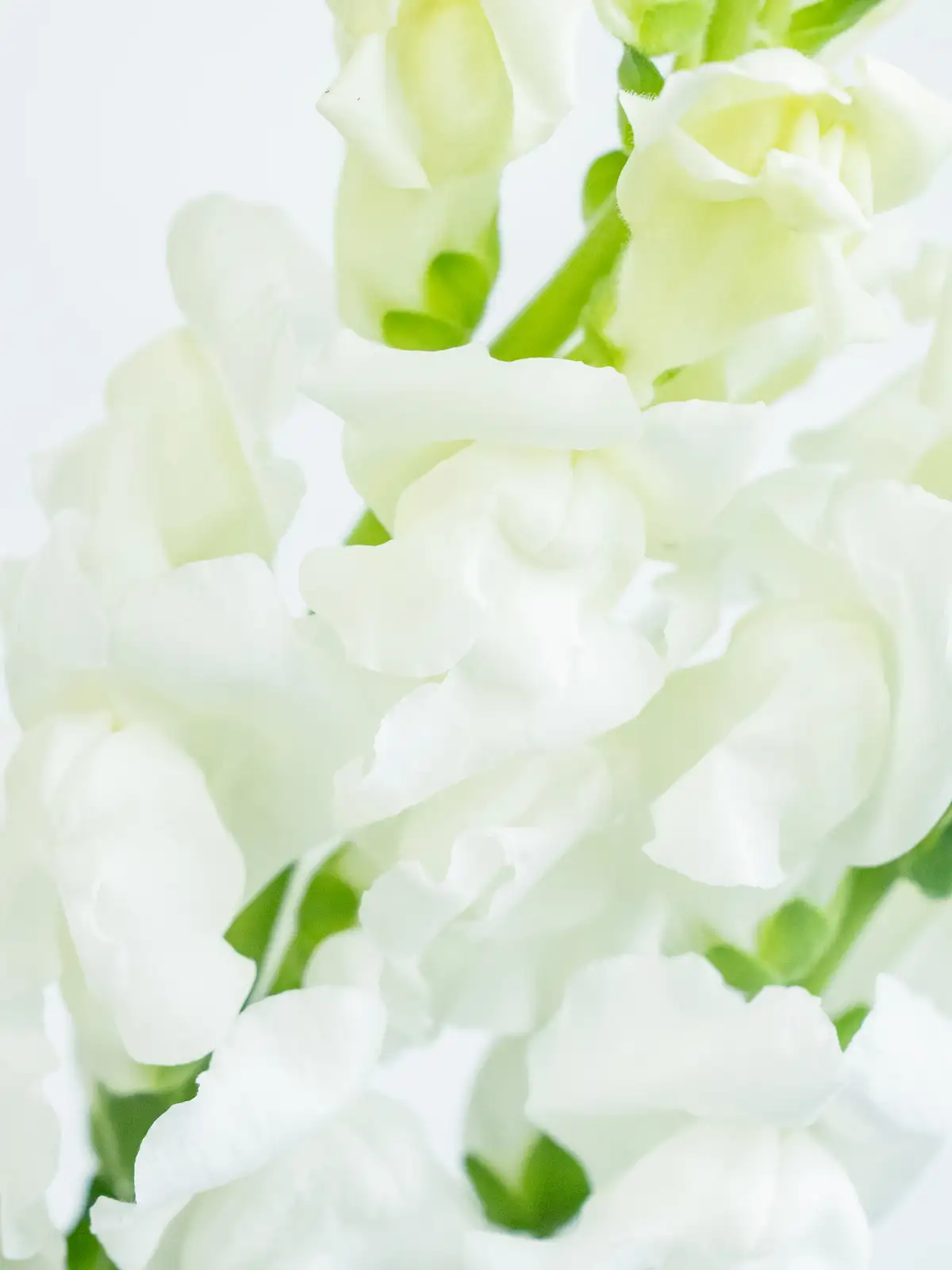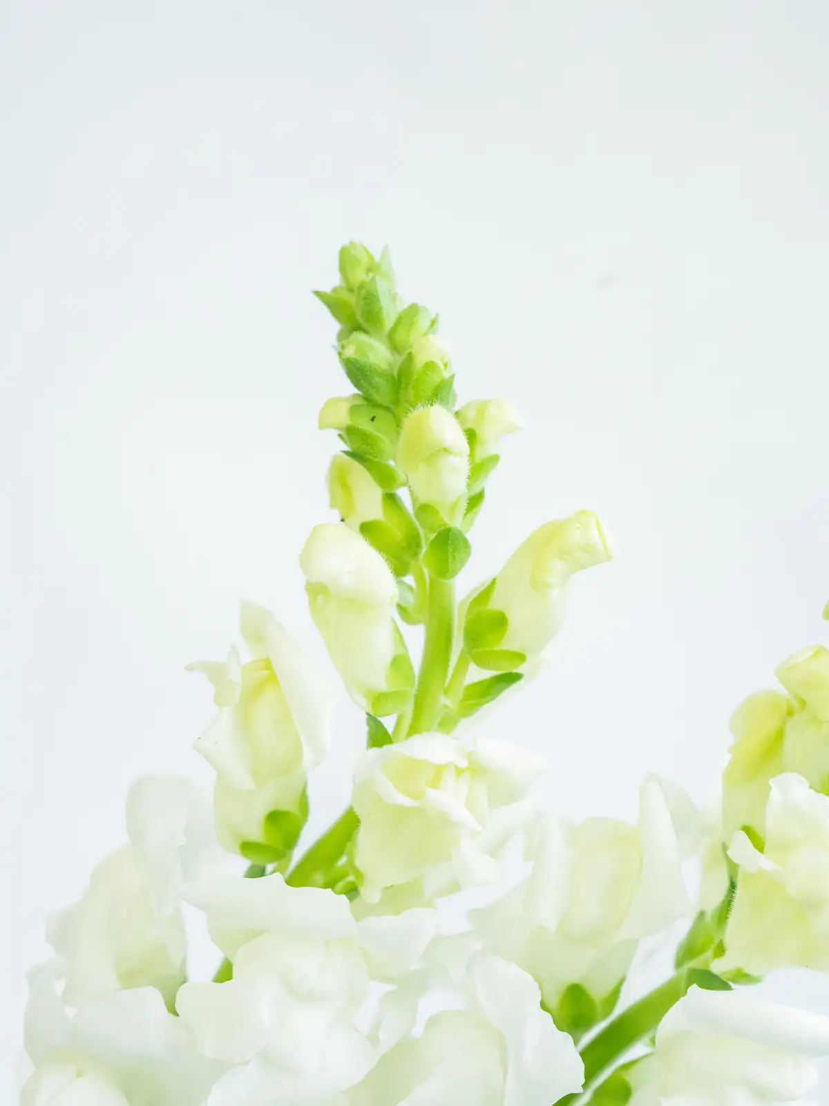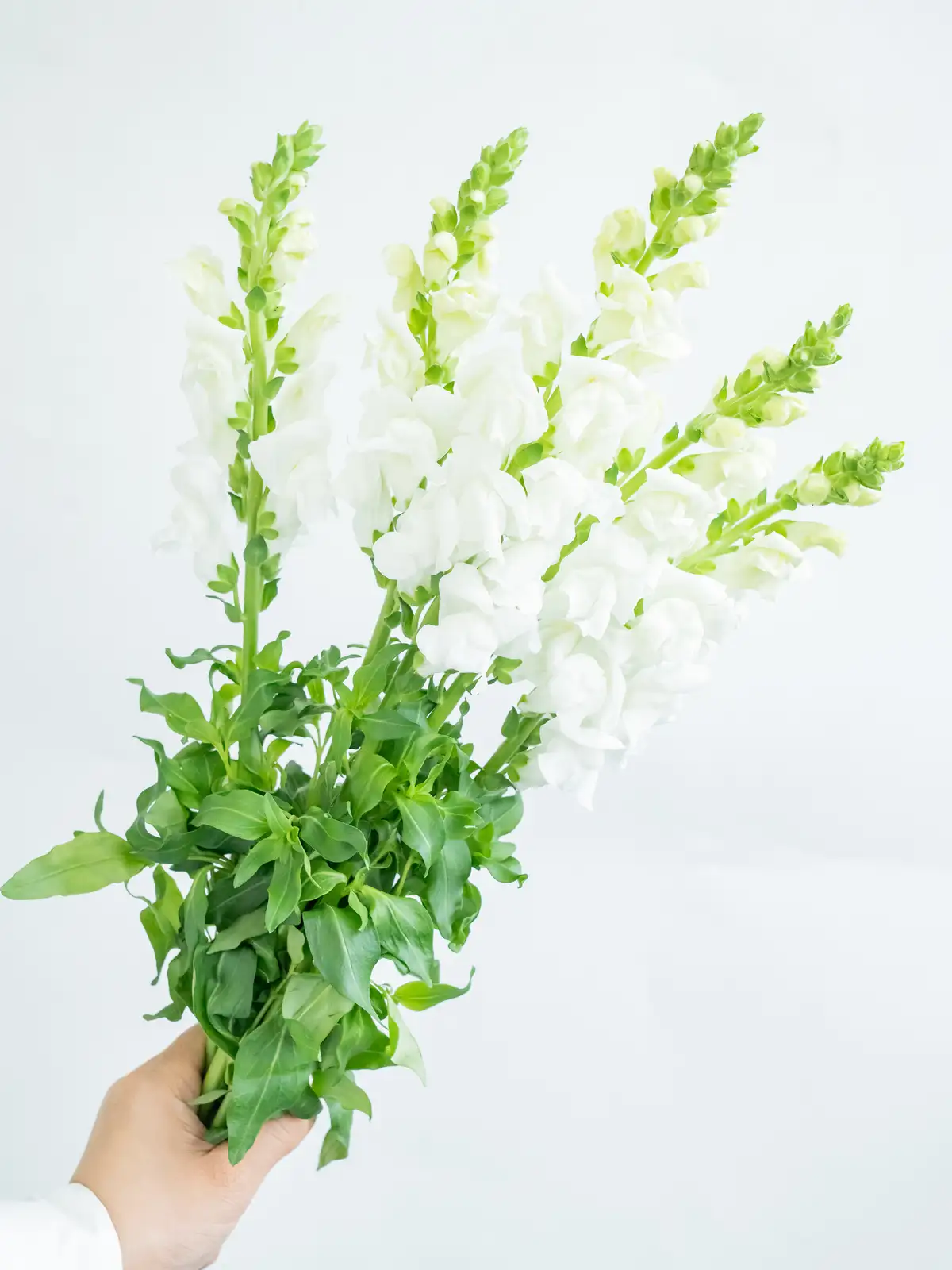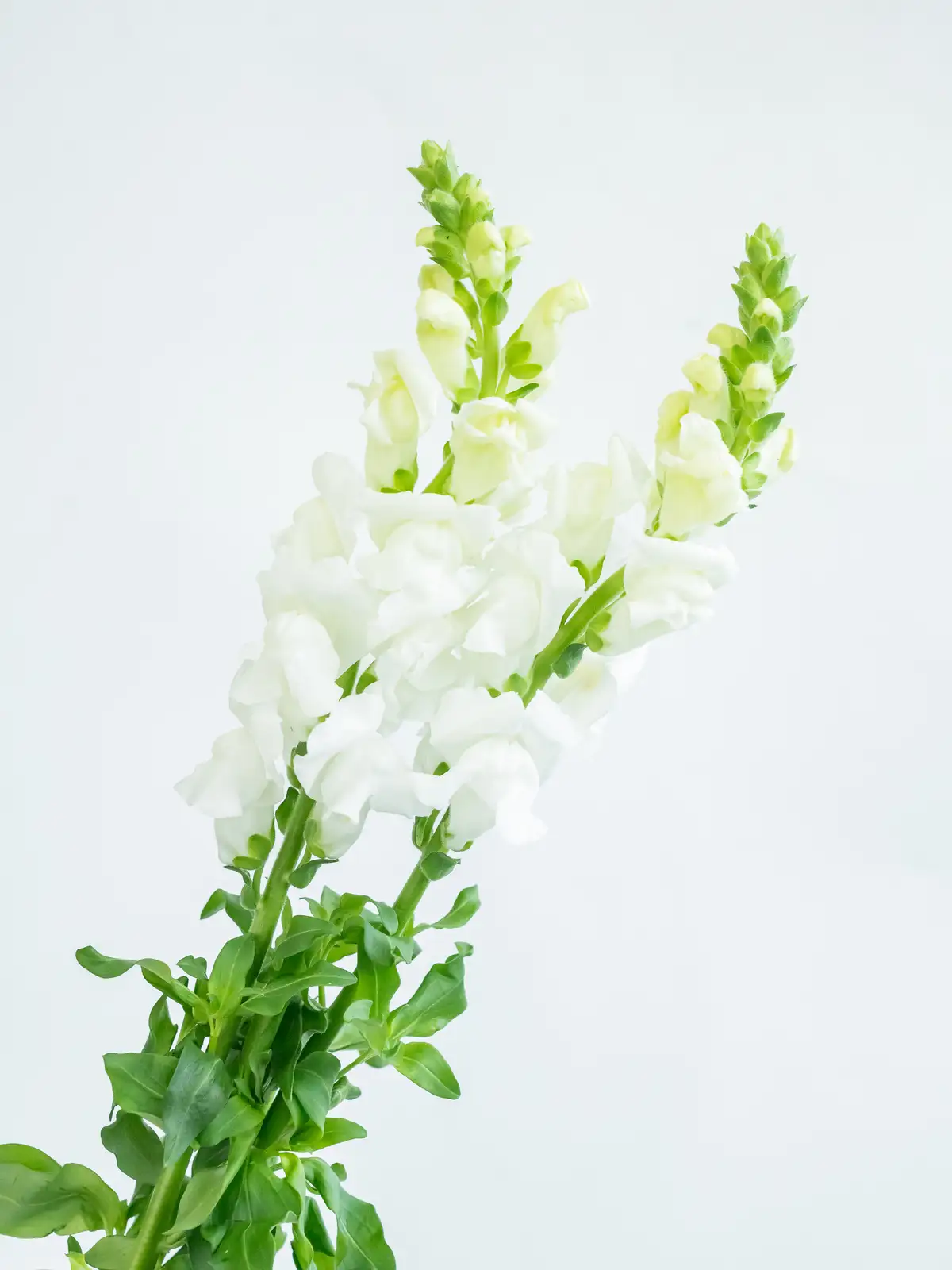 純白の花穂が清楚な印象を与える金魚草。花弁はやや厚く、しっかりとした茎に大きな花を咲かせます。