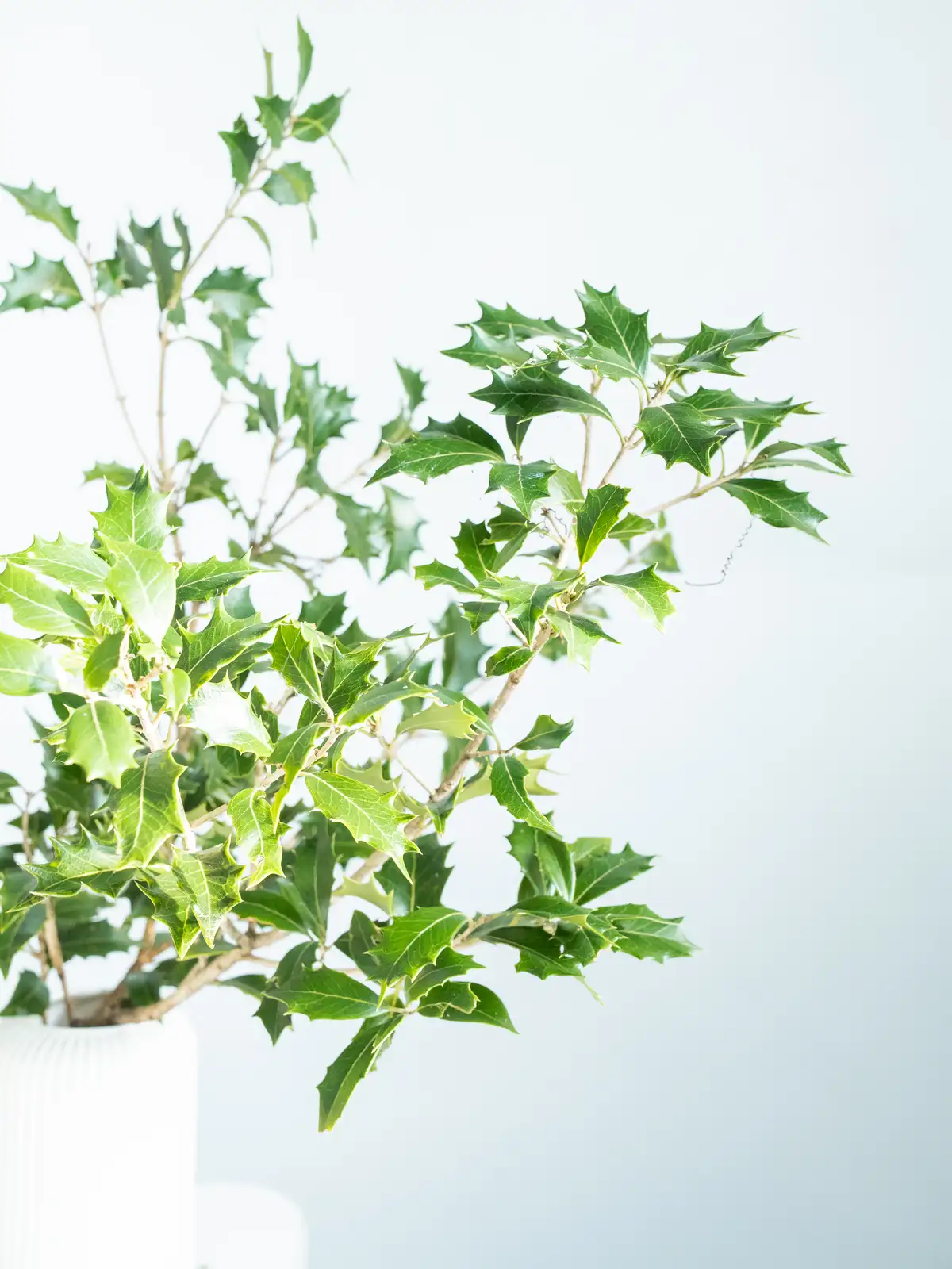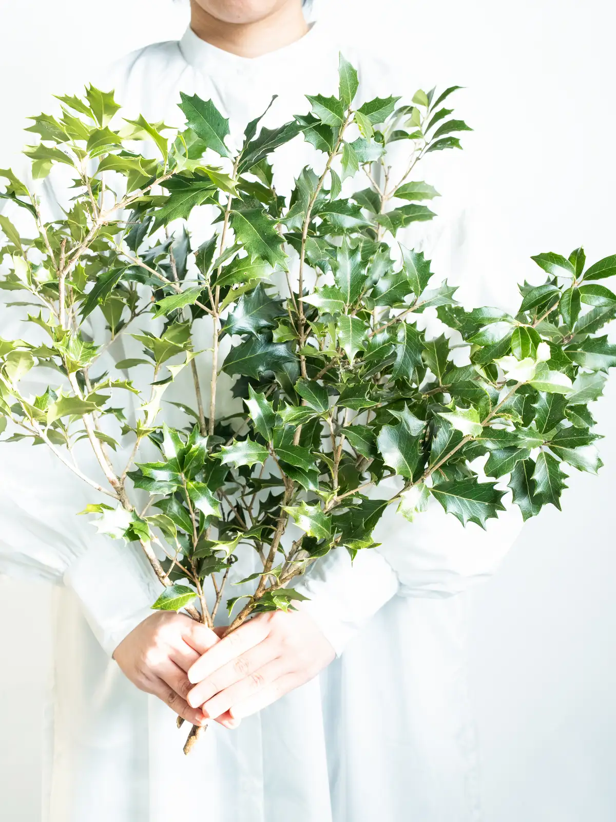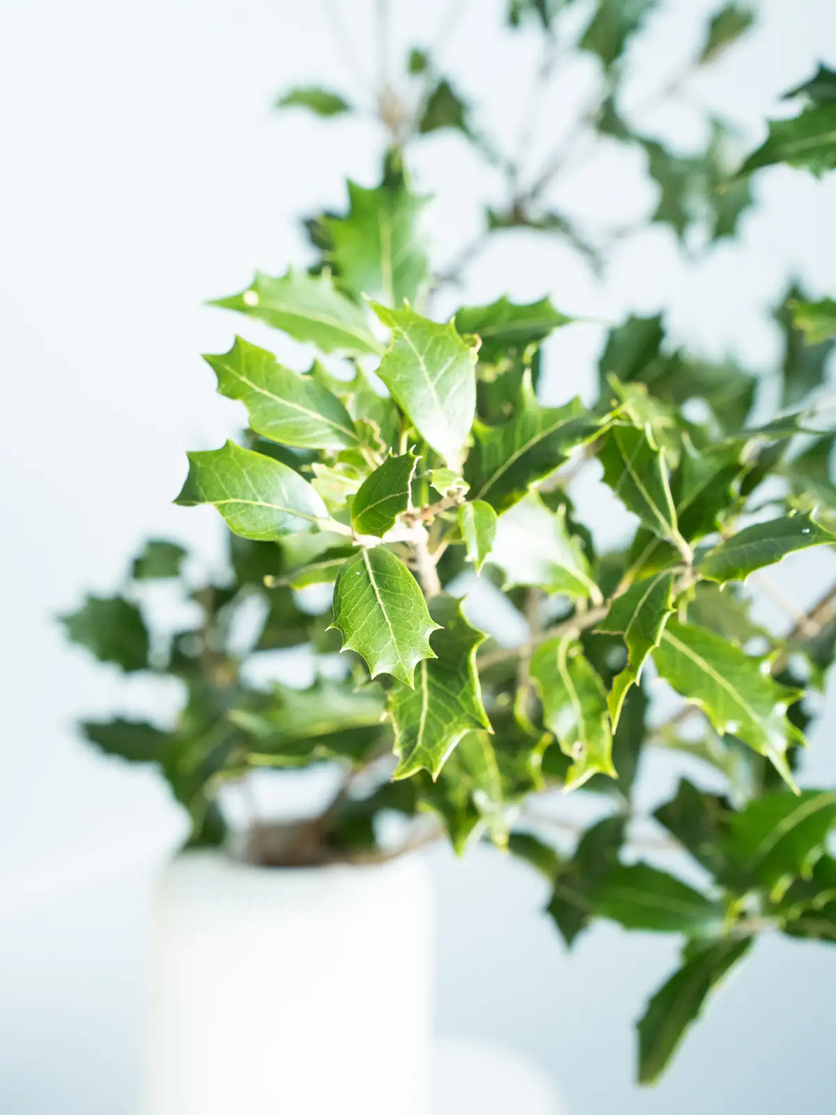 濃緑色の光沢ある葉を持つ常緑樹。葉は硬く、鋭い切れ込みが入るのが特徴です。