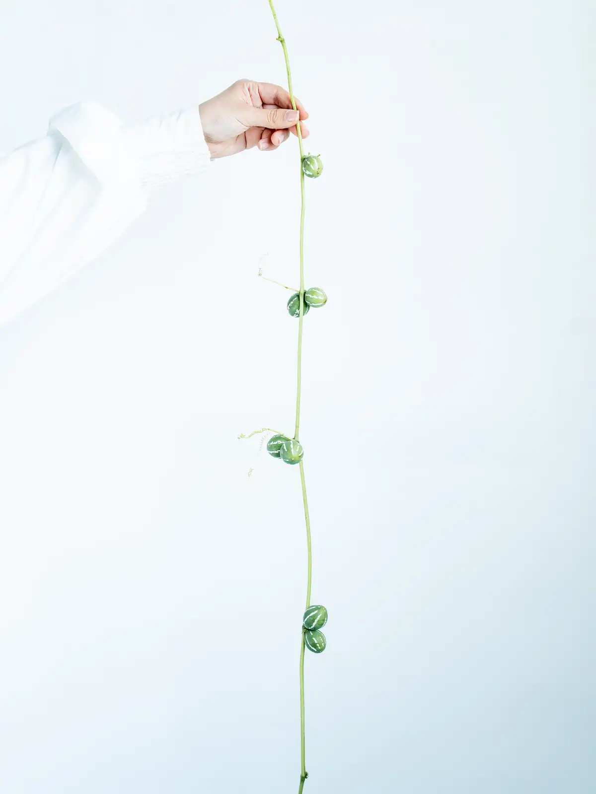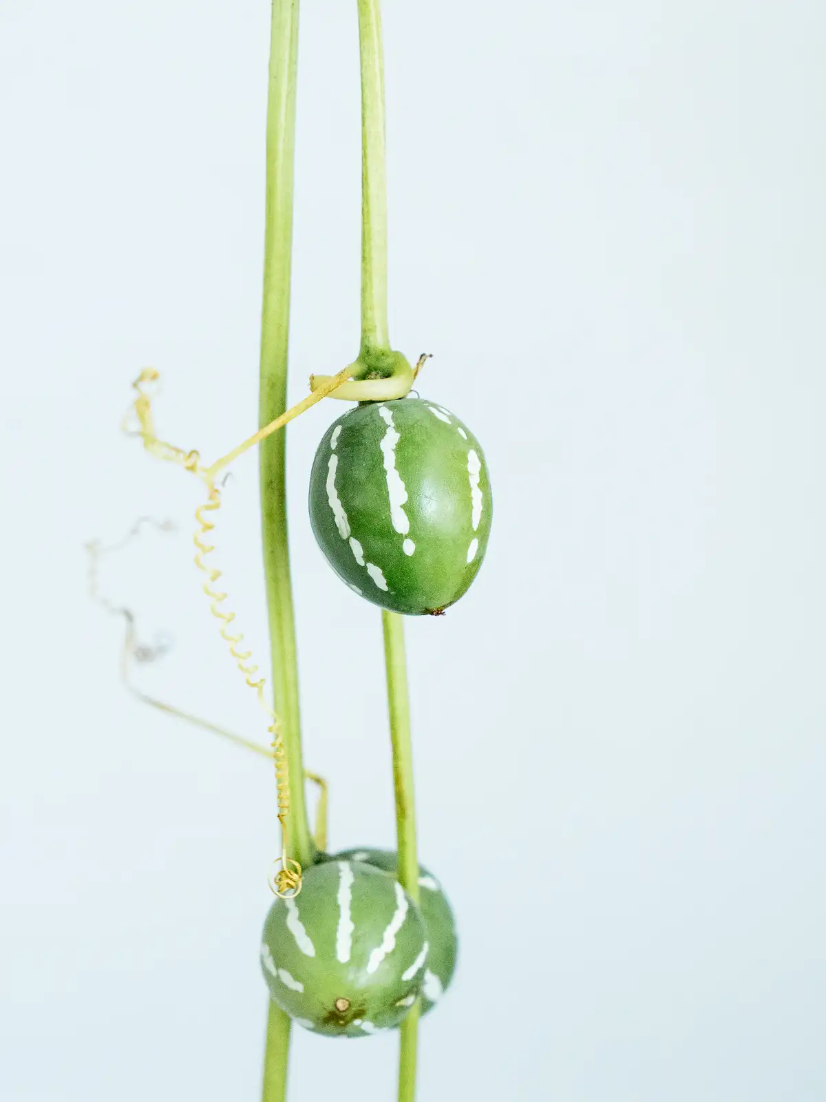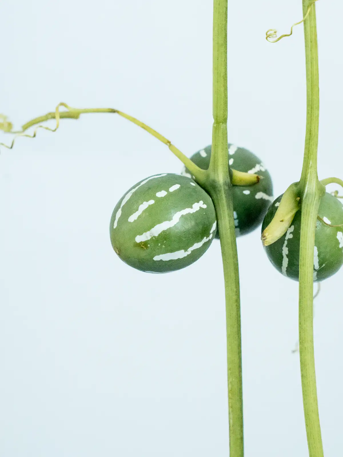 丸く小さな緑色の実をつけるつる性植物。果実は白い縞模様が入り、ナチュラルな雰囲気を持ちます。