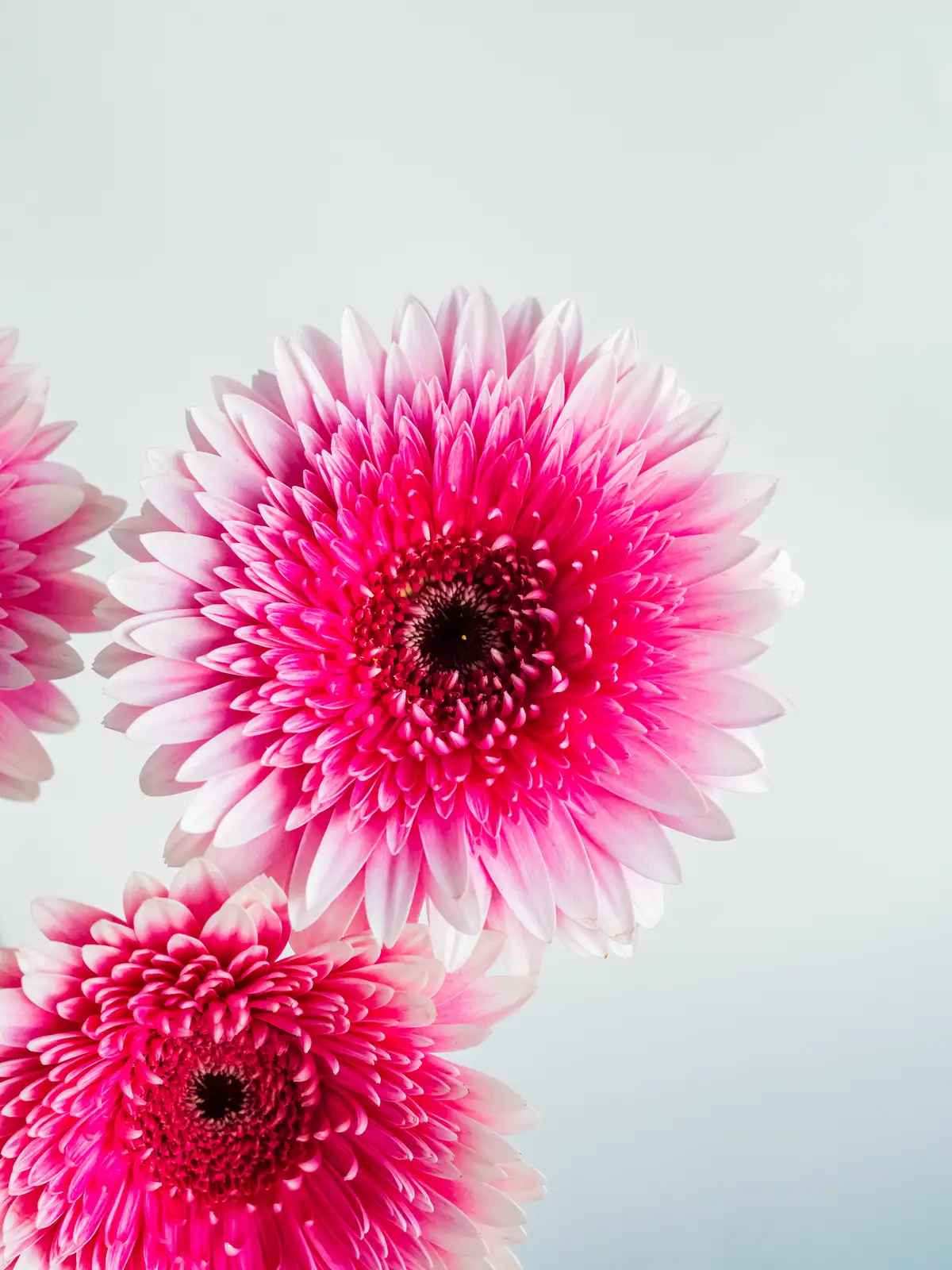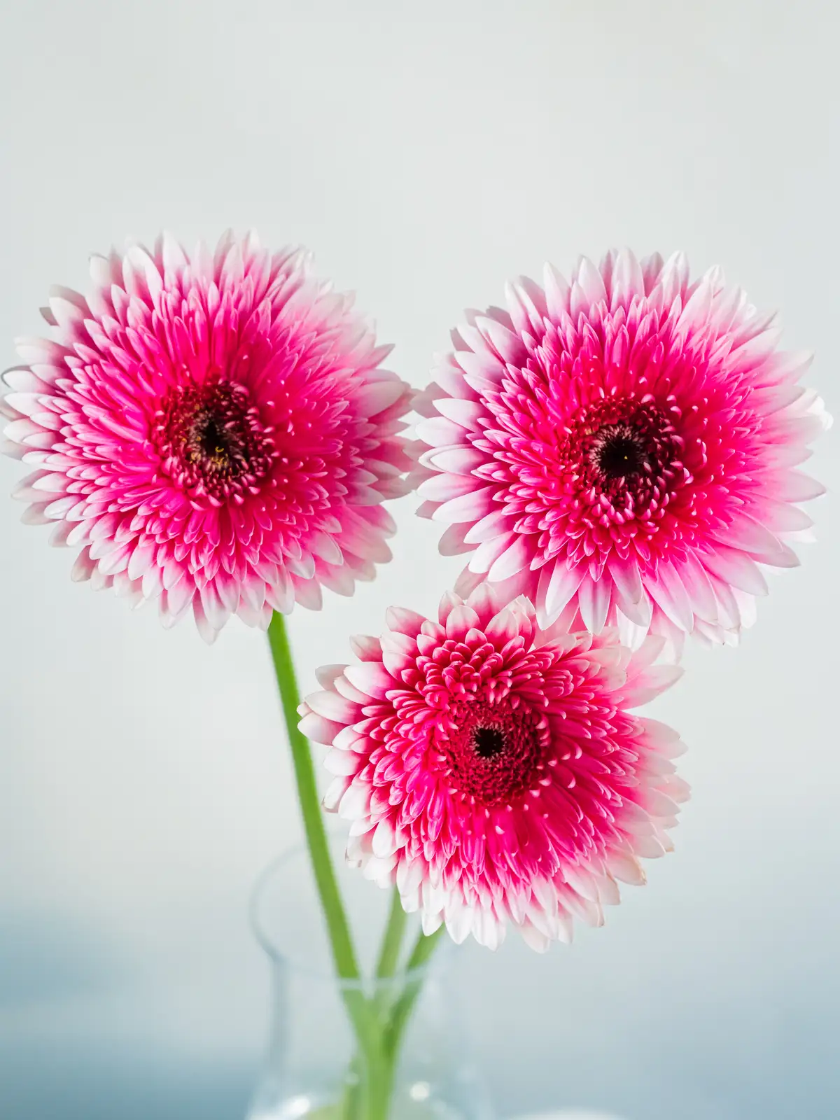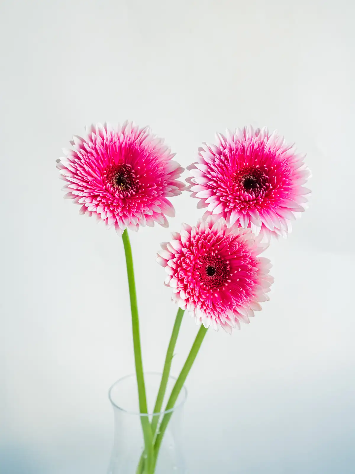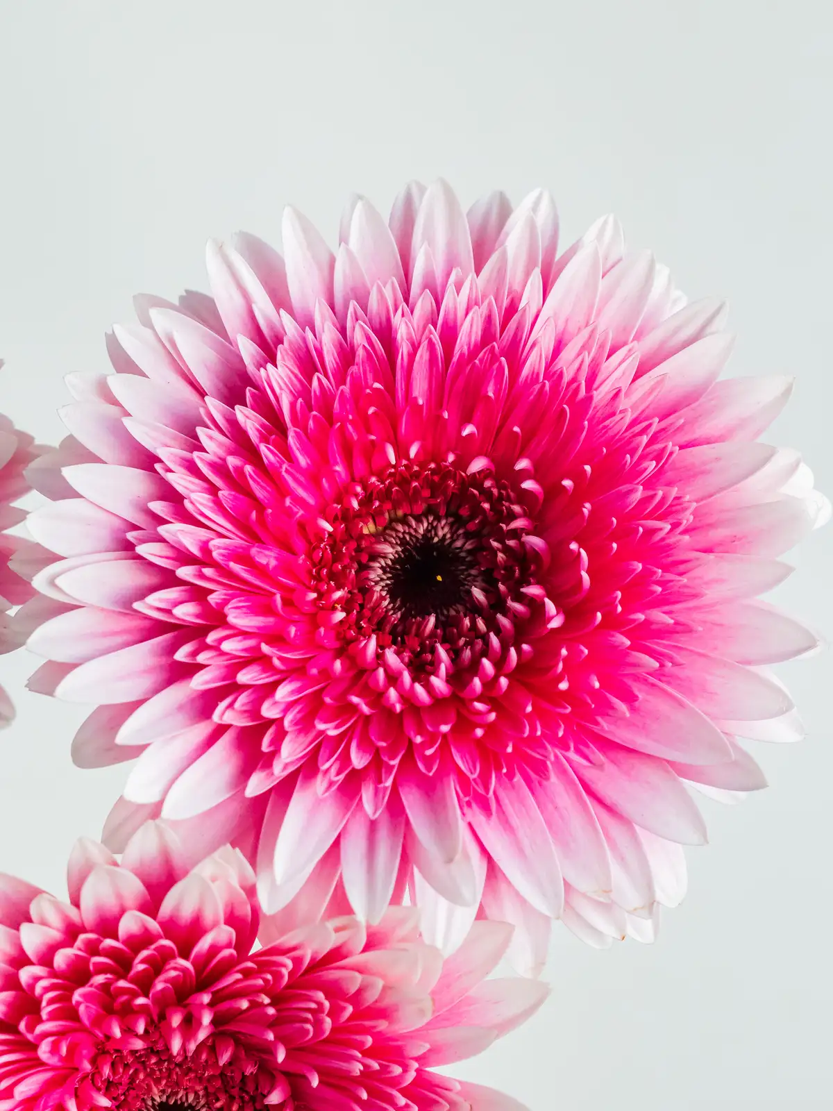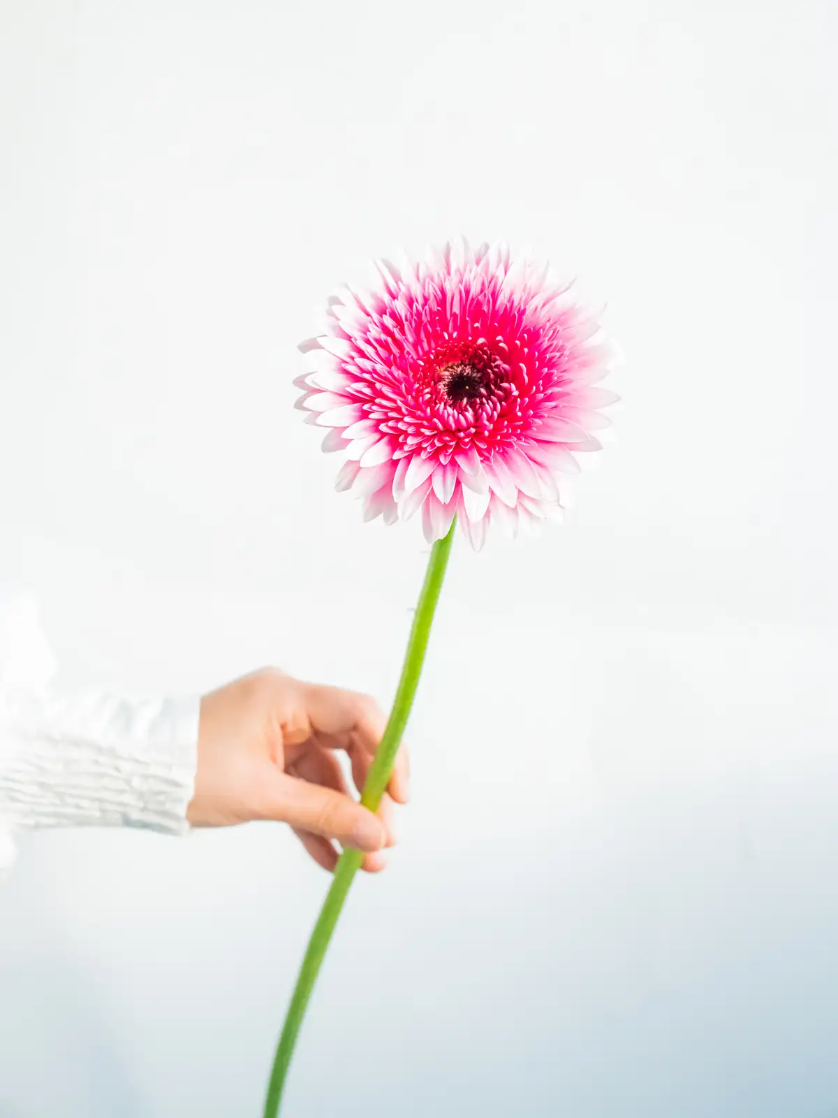 花弁の先に白、中心に向かってピンクみを帯びる複色系。明るく柔らかな印象のガーベラです。