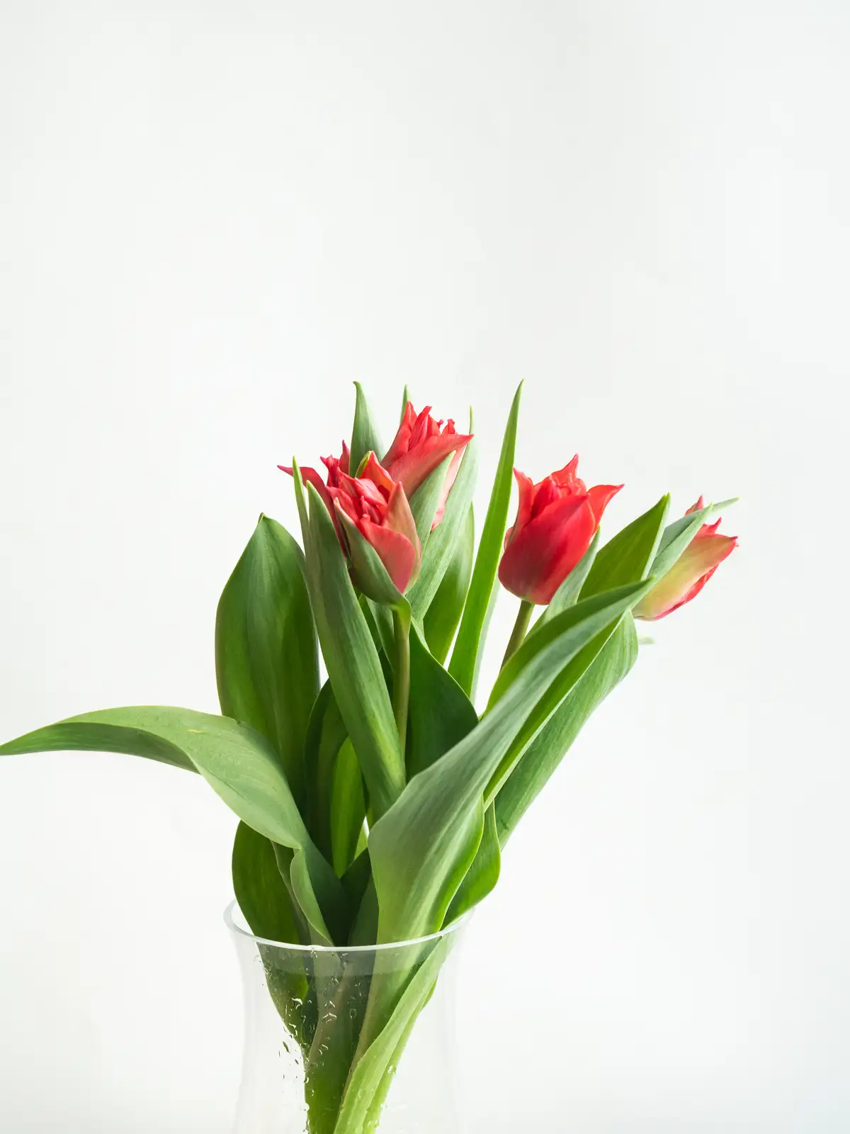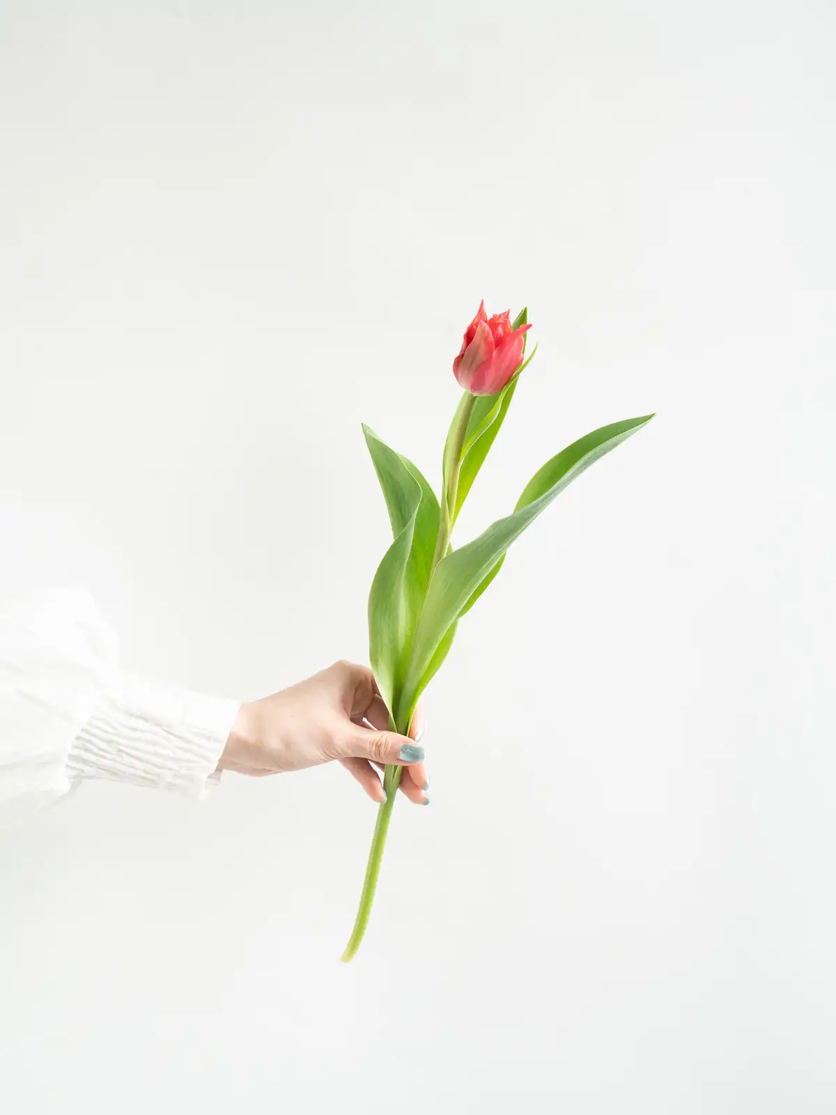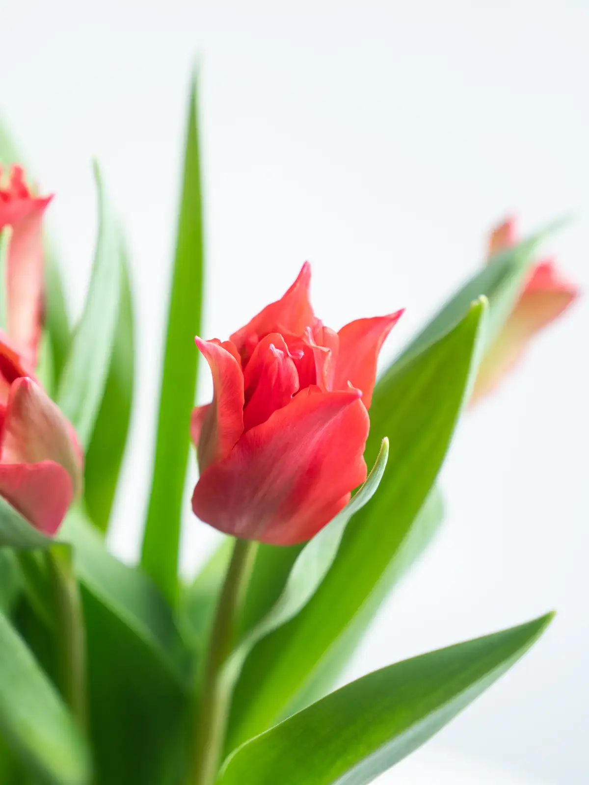 鮮やかな赤色の花弁が印象的なチューリップ。花形は端正で、発色の良さと存在感があります。